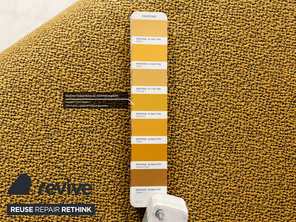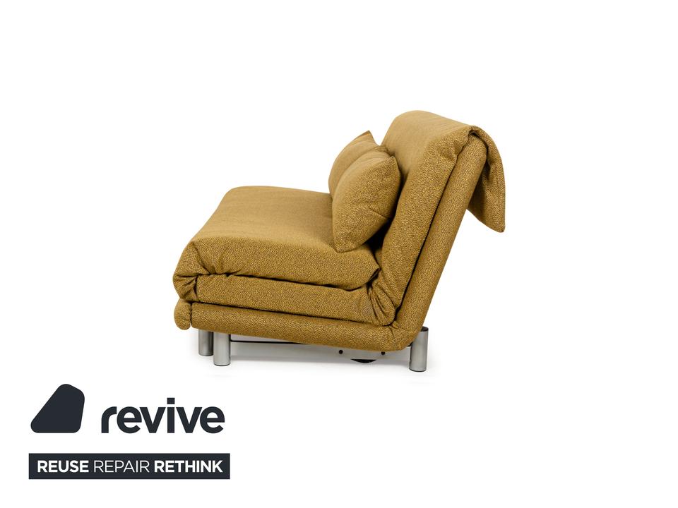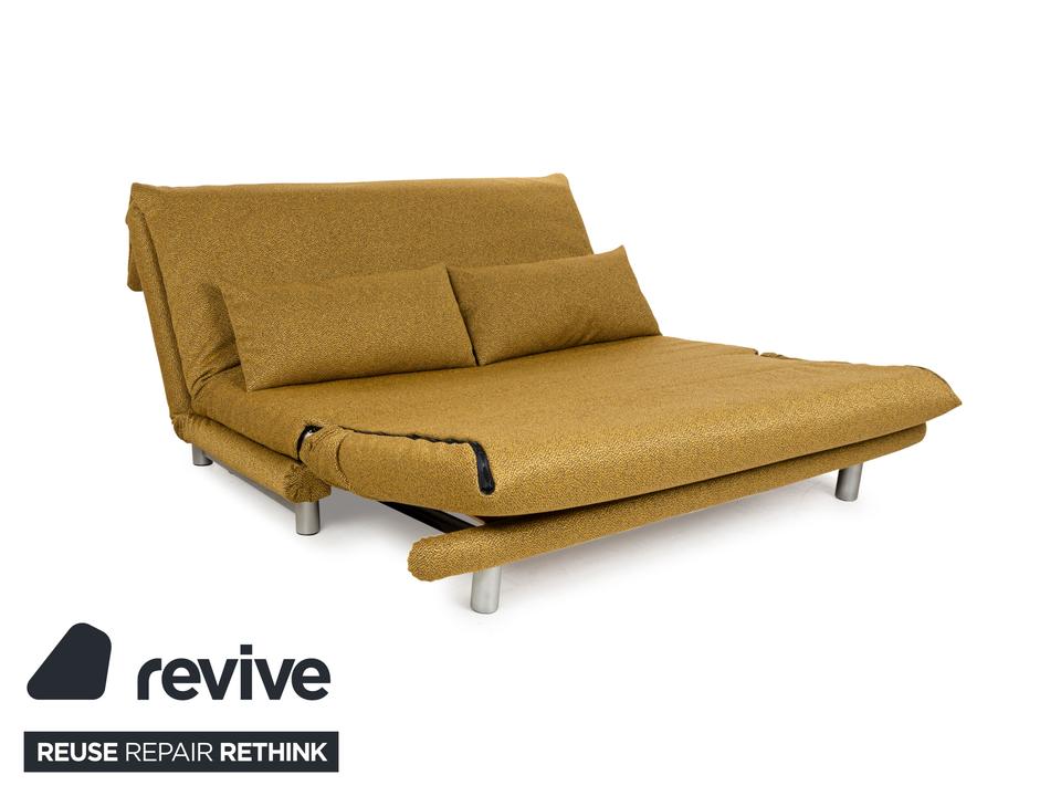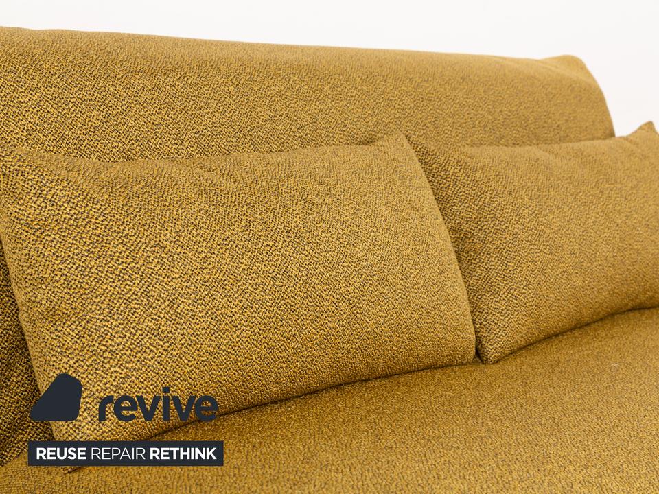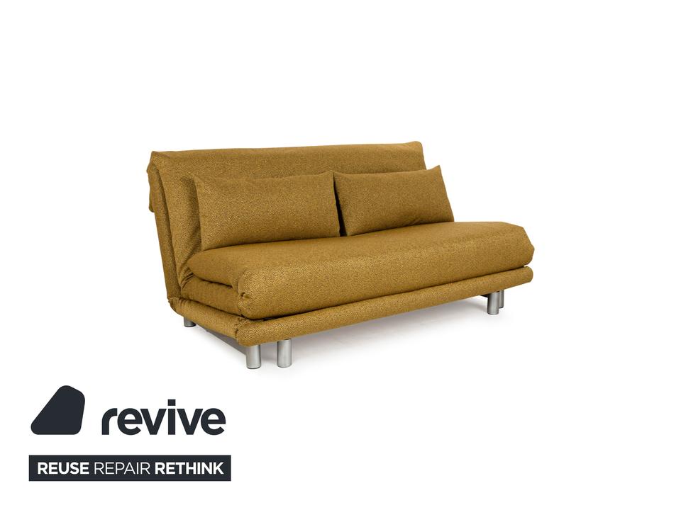 Das Multy Sofa von ligne roset ist mit einem senfgelben Stoff neu bezogen worden und steht auf runden Metallfüßen. Das minimalistische Design und die praktische Schlaffunktion zeichnen den Dreisitzer aus.