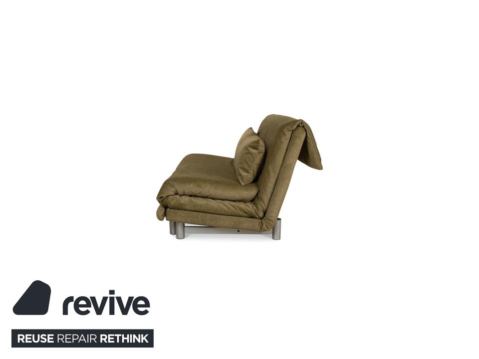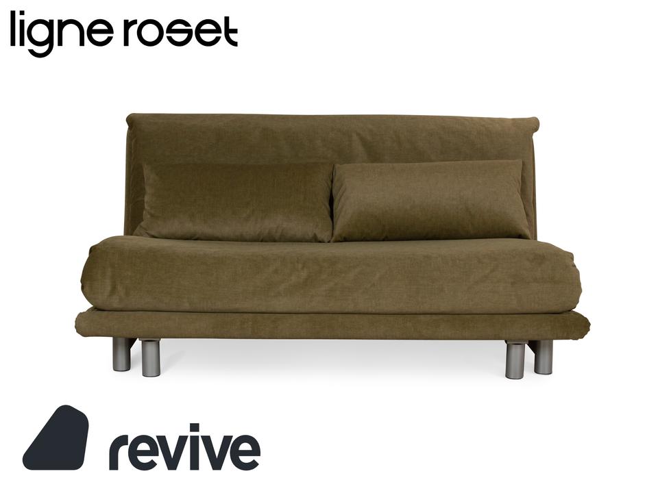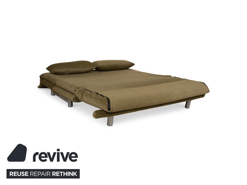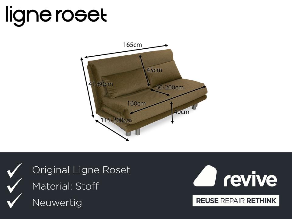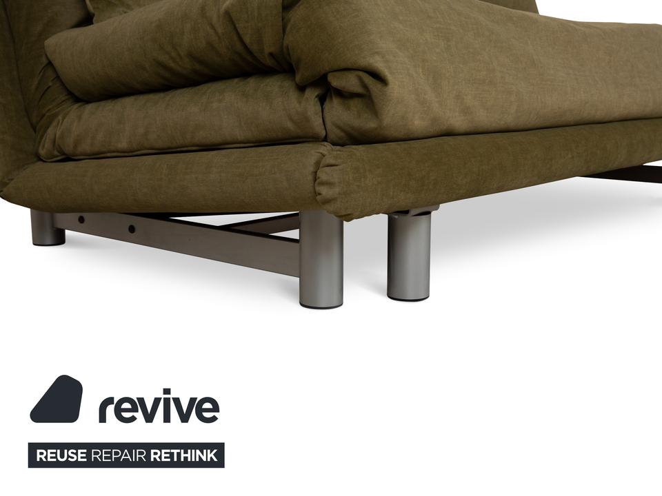 Das Multy Sofa von ligne roset ist mit einem grünen Stoff neu bezogen und steht auf runden, schwarzen Füßen. Das minimalistische Design und die komfortable Schlaffunktion zeichnen den Dreisitzer aus.