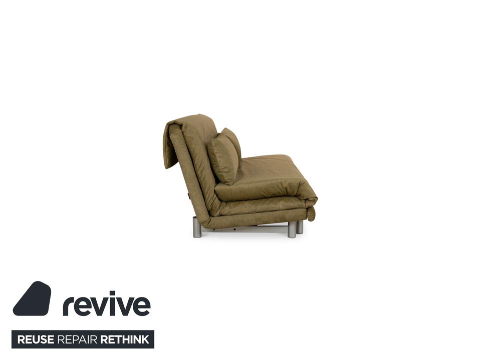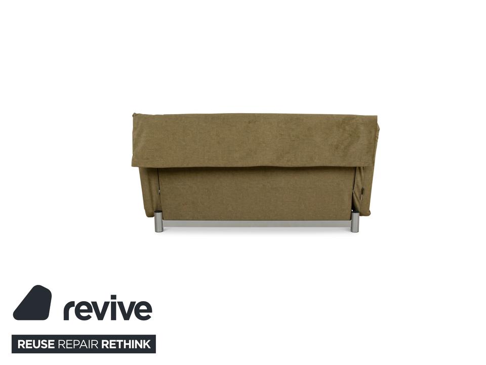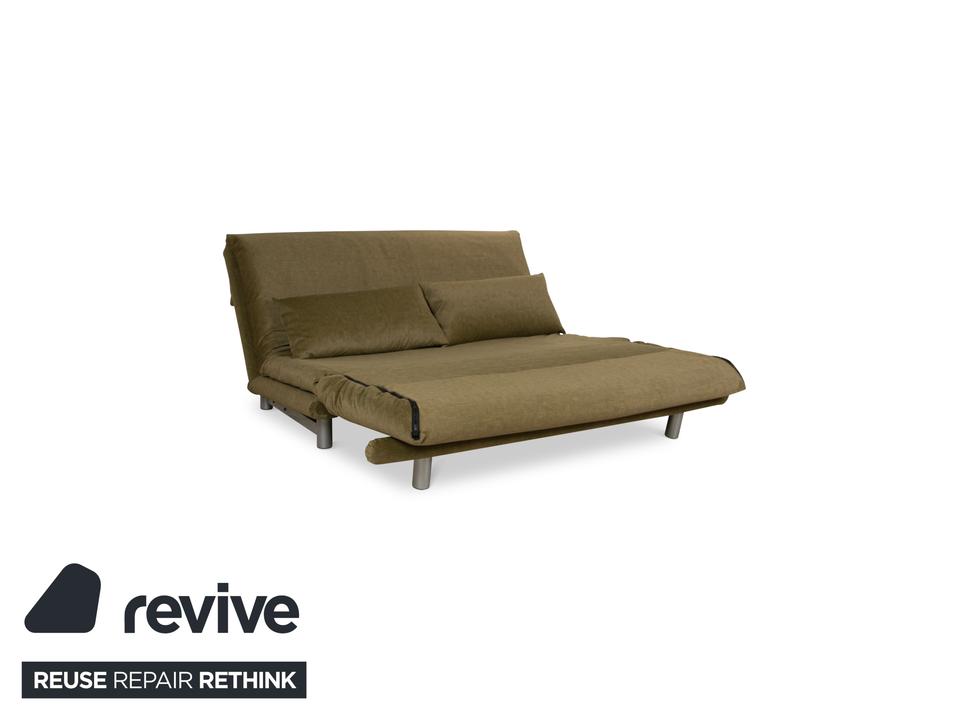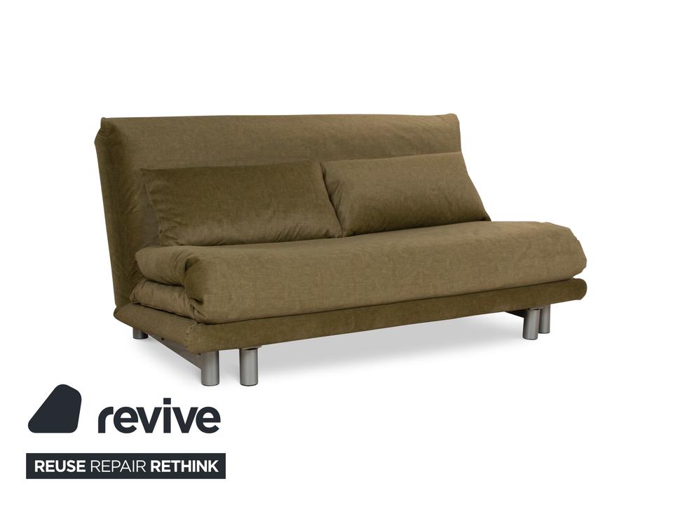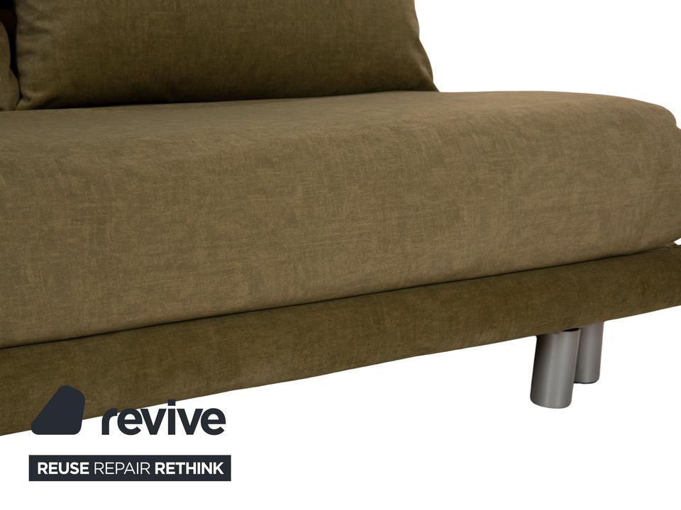 Das Multy Sofa von ligne roset ist mit einem grünen Stoff neu bezogen und steht auf runden, schwarzen Füßen. Das minimalistische Design und die komfortable Schlaffunktion zeichnen den Dreisitzer aus.