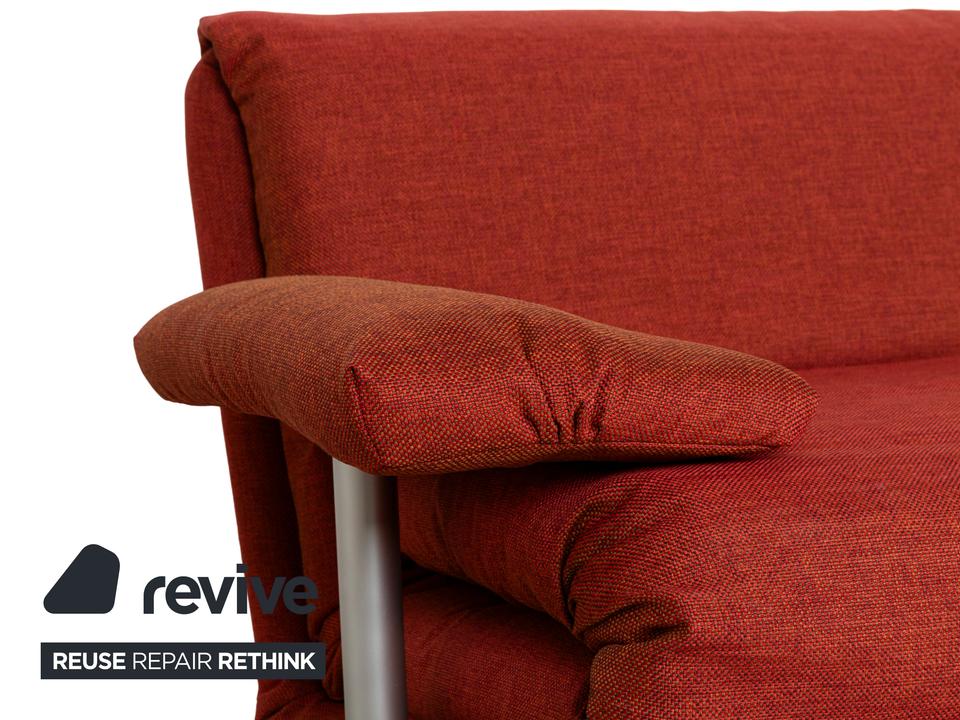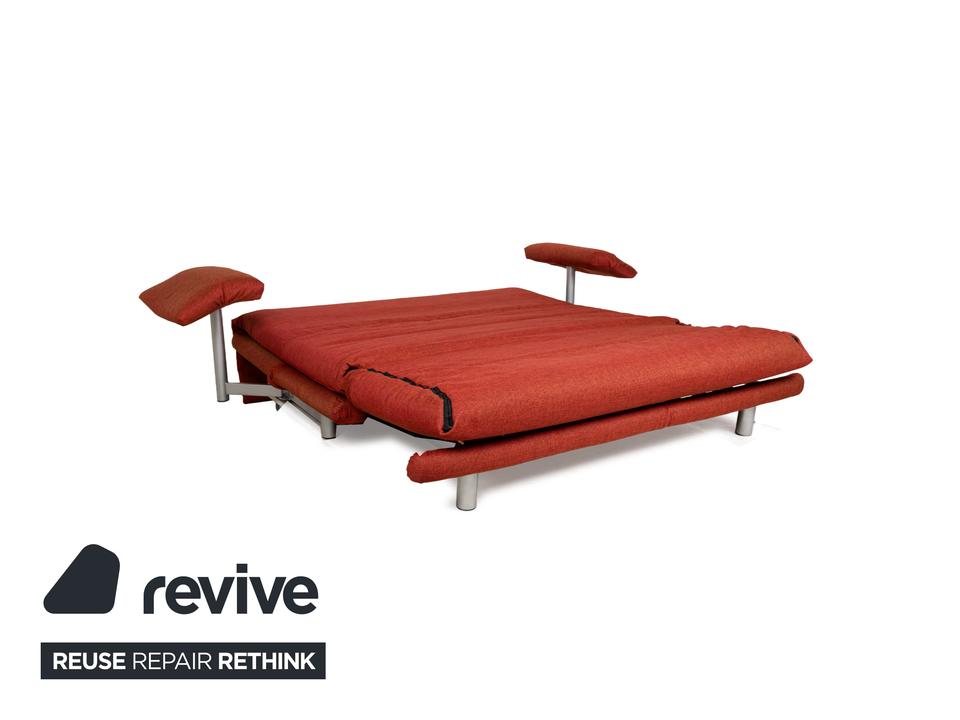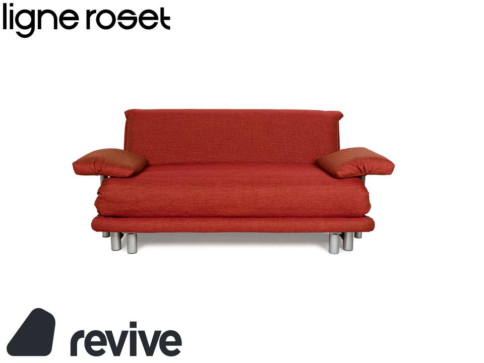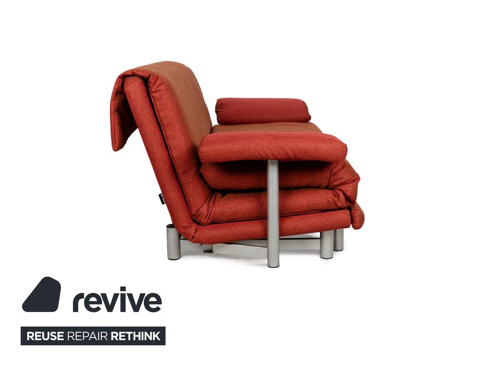 Das Multy Sofa von ligne roset ist mit einem rot-orangefarbenen Stoff neu bezogen worden und steht auf einem silbernen Metallgestell. Das minimalistische Design und die komfortable Schlaffunktion zeichnen den Dreisitzer aus, der sich mit nur wenigen Handgriffen in ein Schlafsofa verwandeln lässt. Diese Ausführung verfügt über praktische und seitlich verstellbare Armlehnen.