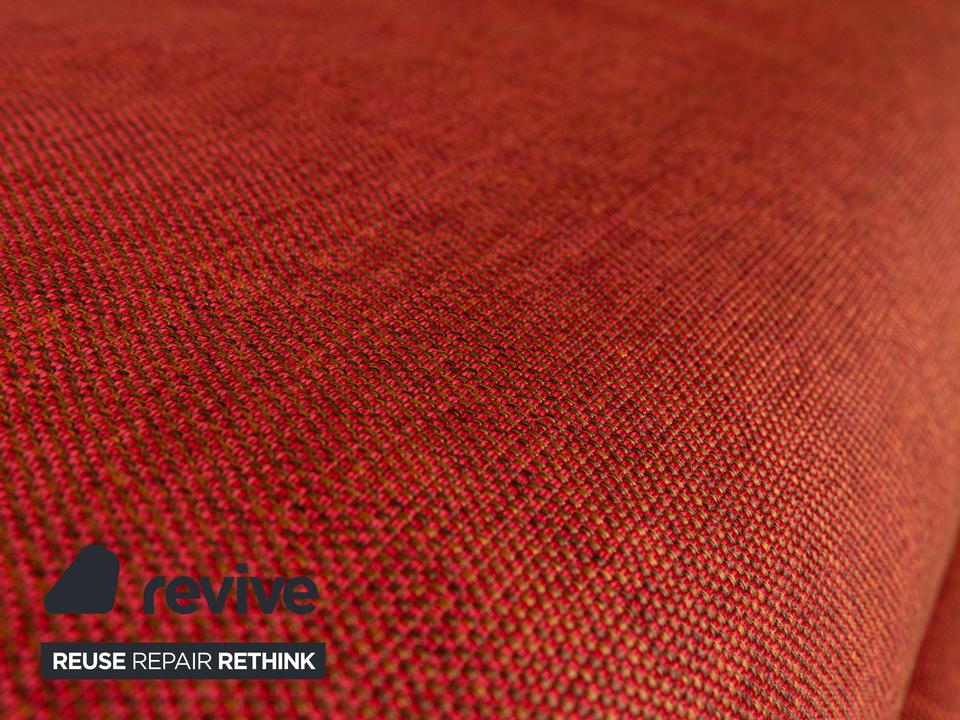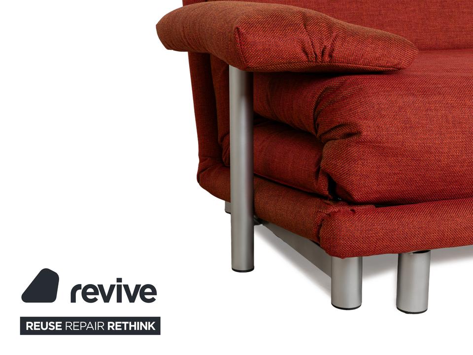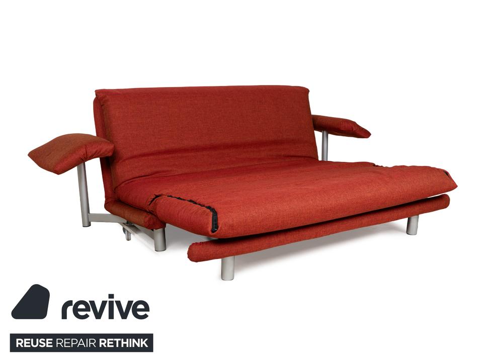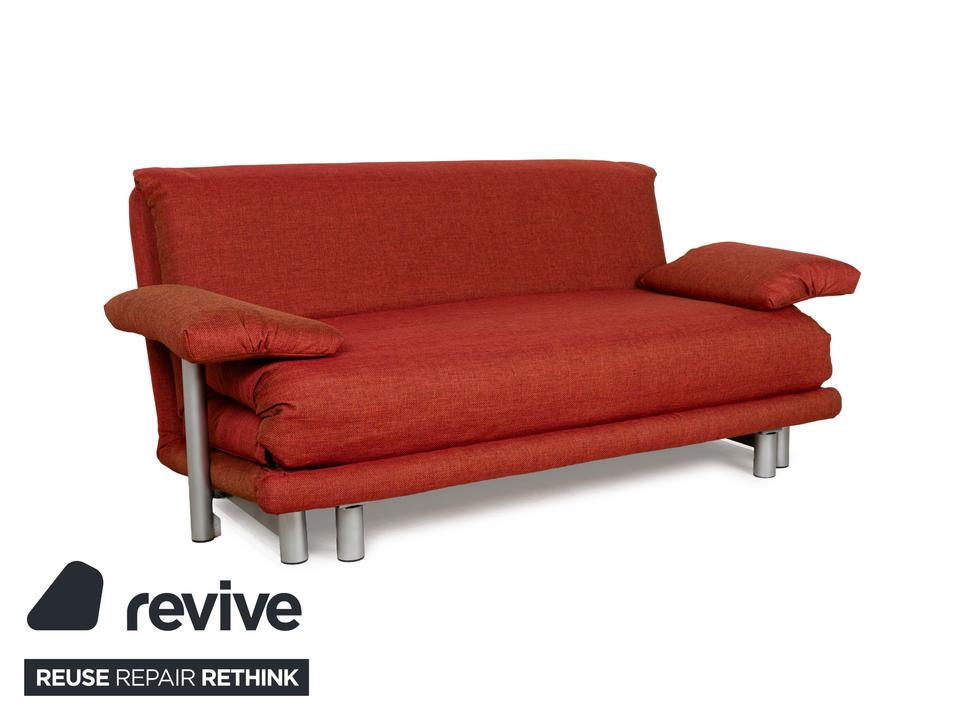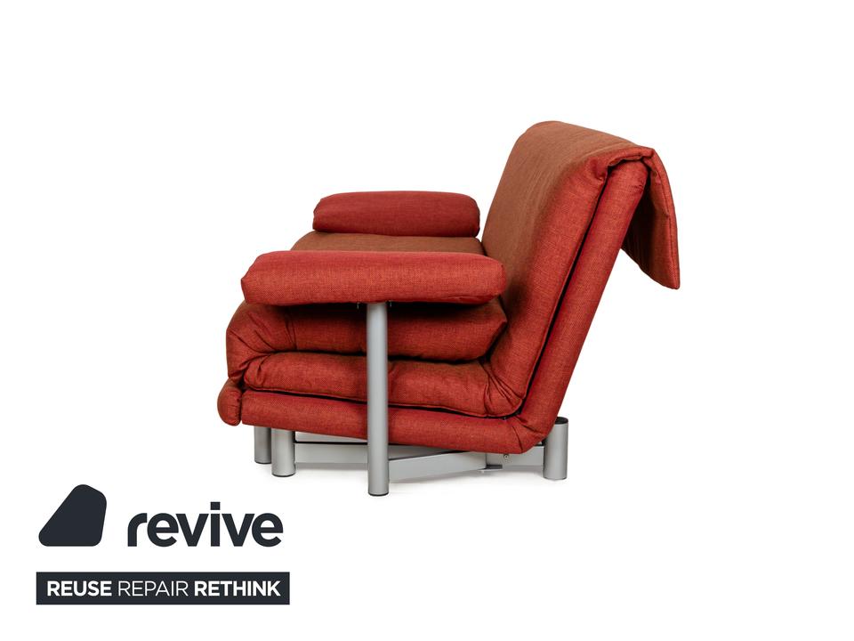 Das Multy Sofa von ligne roset ist mit einem rot-orangefarbenen Stoff neu bezogen worden und steht auf einem silbernen Metallgestell. Das minimalistische Design und die komfortable Schlaffunktion zeichnen den Dreisitzer aus, der sich mit nur wenigen Handgriffen in ein Schlafsofa verwandeln lässt. Diese Ausführung verfügt über praktische und seitlich verstellbare Armlehnen.