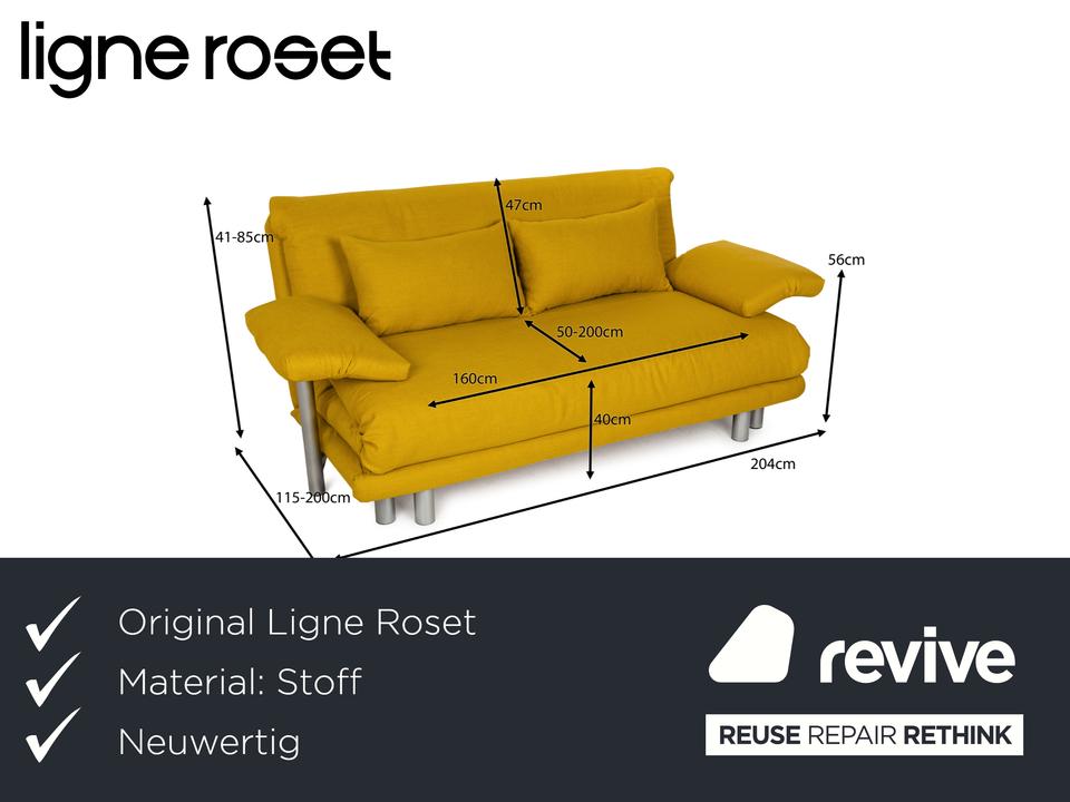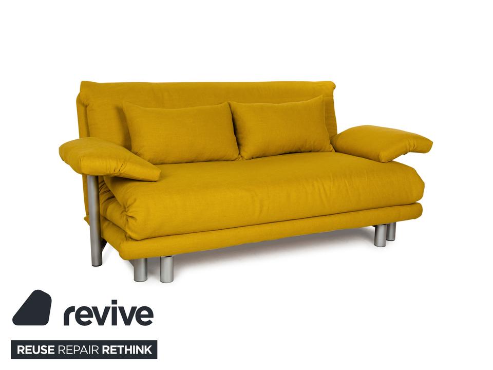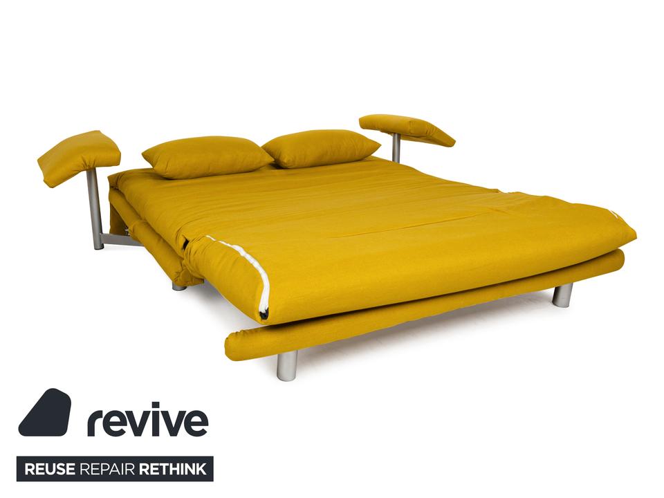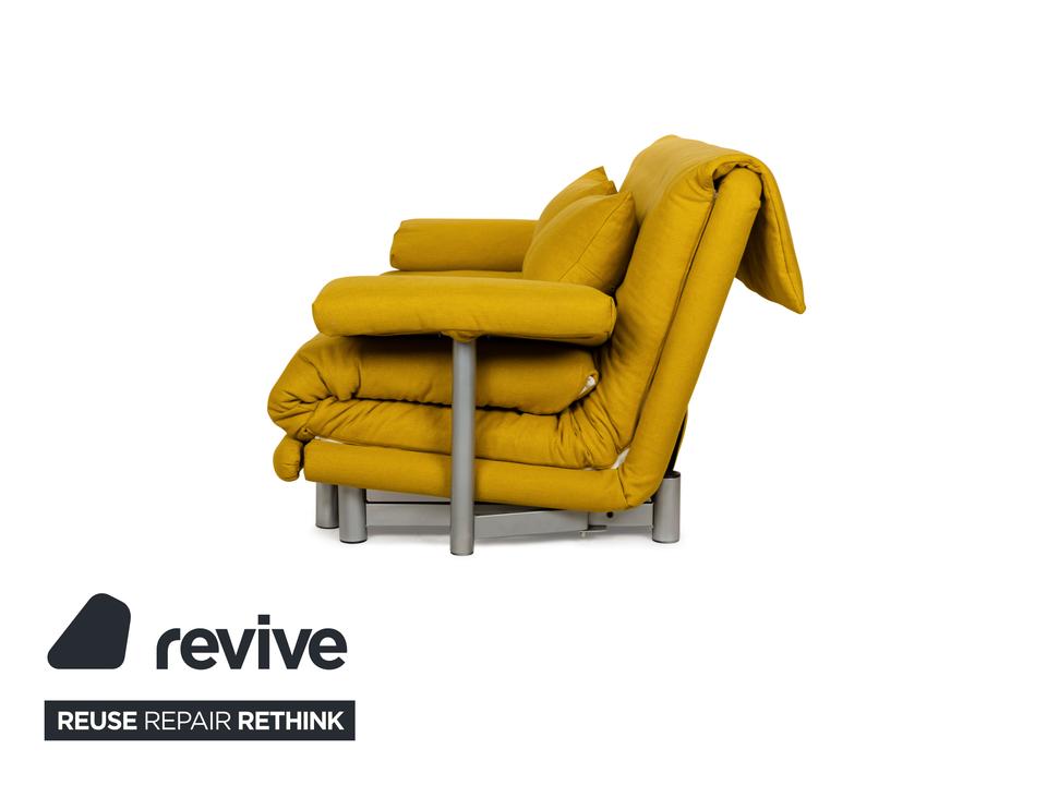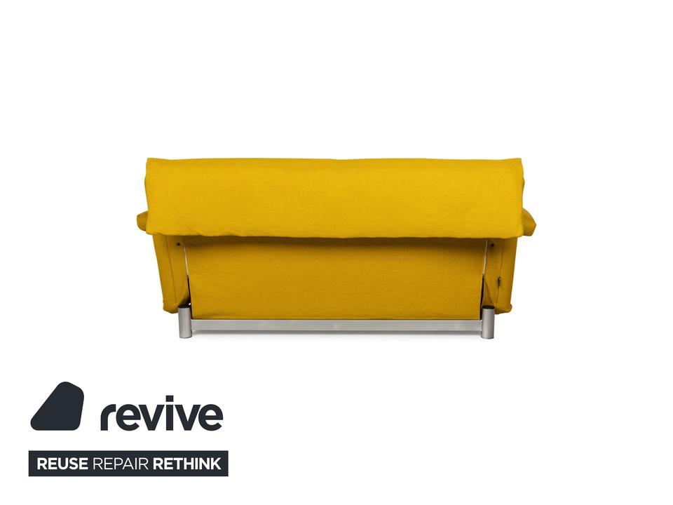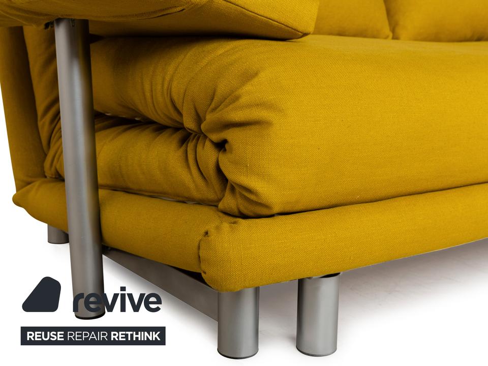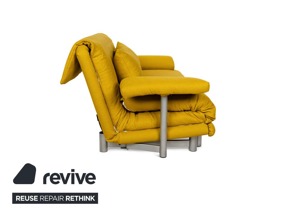 Das Multy Sofa von ligne roset ist mit einem gelben Stoff neu bezogen worden und steht auf einem silbernen Metallgestell. Das minimalistische Design und die komfortable Schlaffunktion zeichnen den Dreisitzer aus, der sich mit nur wenigen Handgriffen in ein Schlafsofa verwandeln lässt. Diese Ausführung verfügt über praktische und seitlich verstellbare Armlehnen.