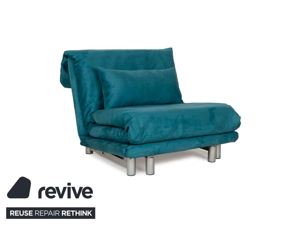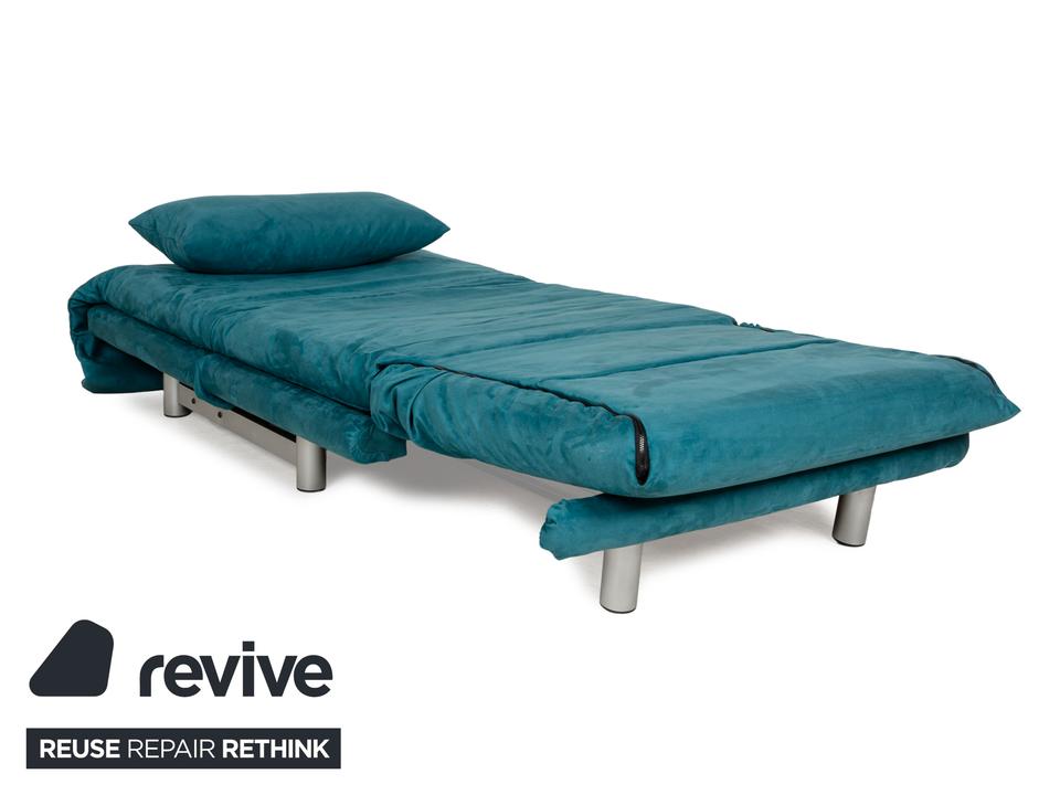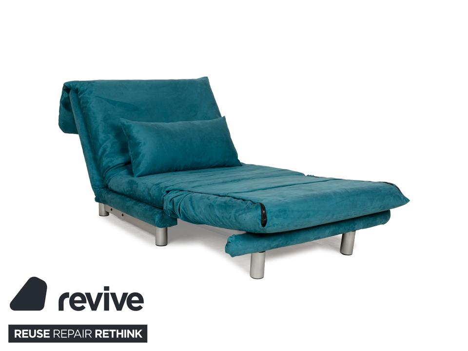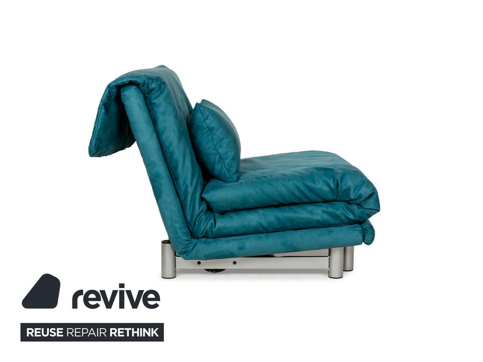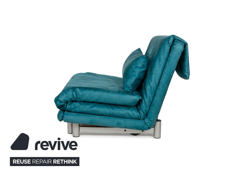 Der Sessel multy von ligne roset ist mit einem blau-petrolfarbenen Stoff neu bezogen worden und steht auf einem silbernen Metallgestell. Das minimalistische Design und die komfortable Schlaffunktion zeichnen ihn aus und mit nur wenigen Handgriffen lässt sich dieser Sessel in ein Schlafsofa verwandeln.