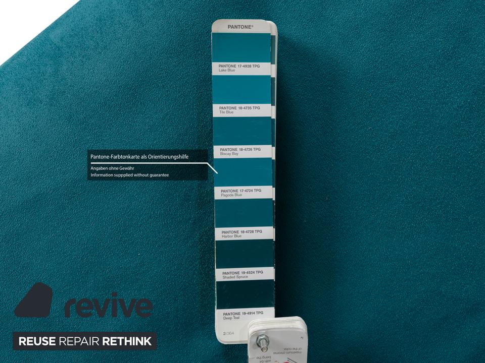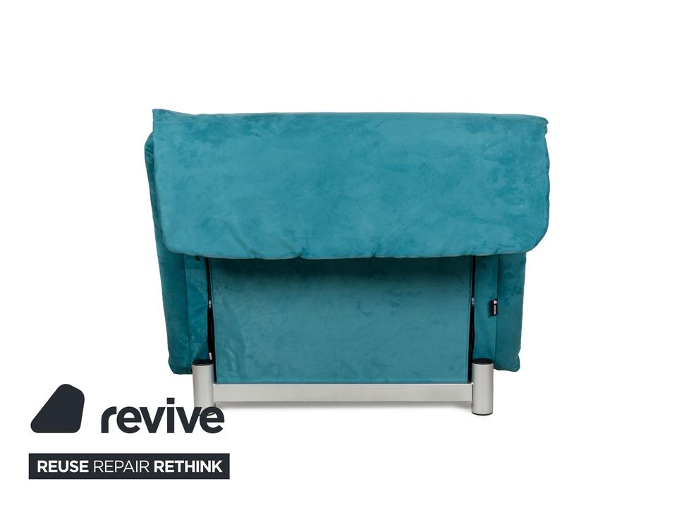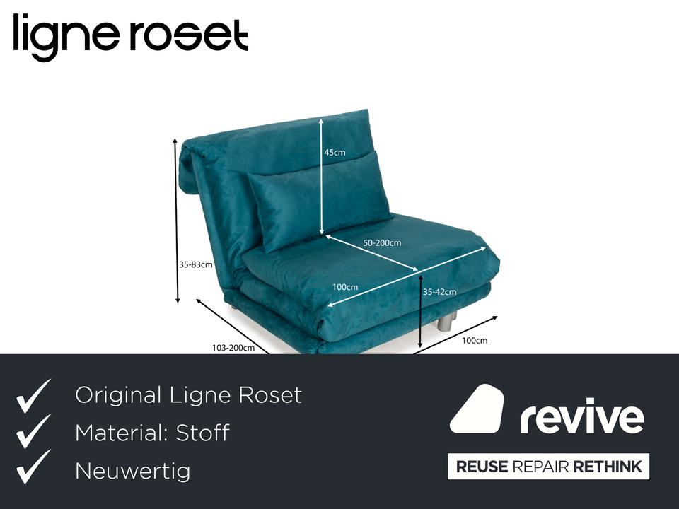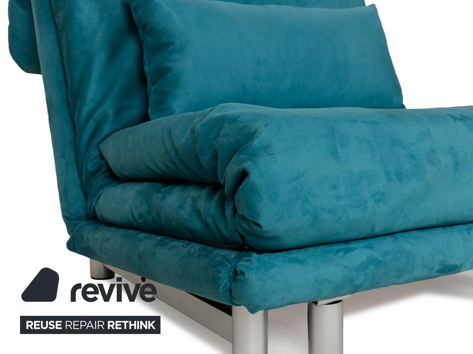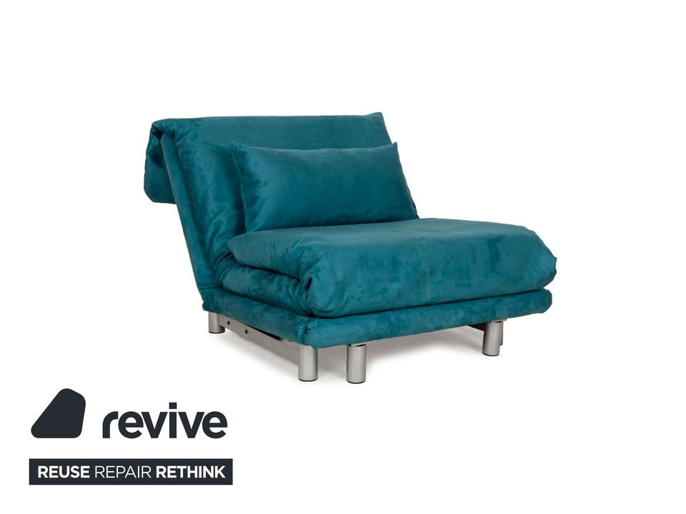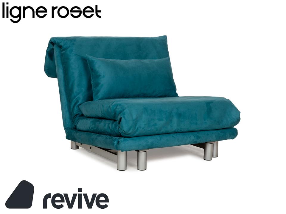 Der Sessel multy von ligne roset ist mit einem blau-petrolfarbenen Stoff neu bezogen worden und steht auf einem silbernen Metallgestell. Das minimalistische Design und die komfortable Schlaffunktion zeichnen ihn aus und mit nur wenigen Handgriffen lässt sich dieser Sessel in ein Schlafsofa verwandeln.