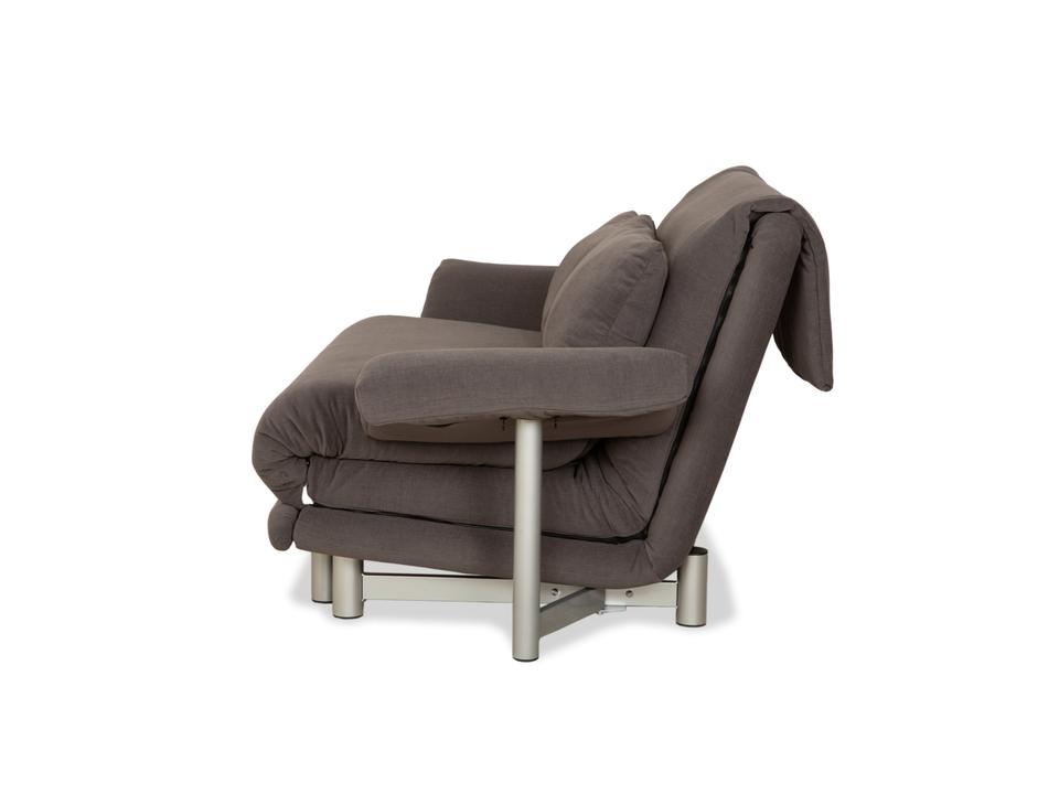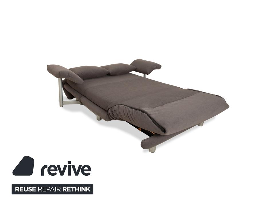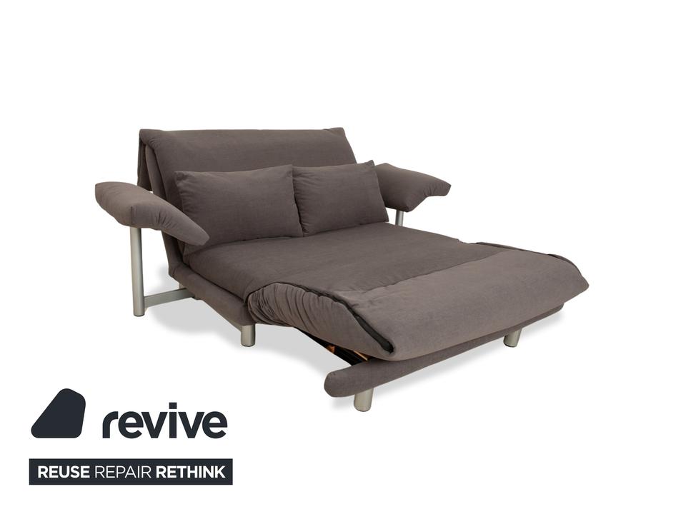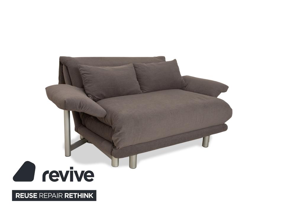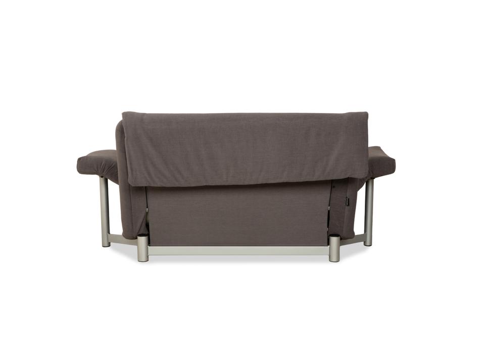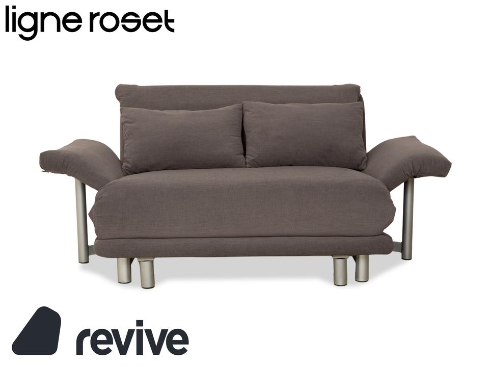Das Sofa Multy von Ligne Roset ist mit einem grauen Stoff neu bezogen worden und steht auf einem silbernen Metallgestell. Das minimalistische Design und die komfortable Schlaffunktion zeichnen den Zweisitzer aus, der sich mit nur wenigen Handgriffen in ein Schlafsofa verwandeln lässt. Diese Ausführung verfügt über praktische und seitlich verstellbare Armlehnen.