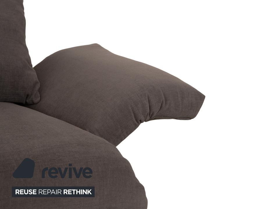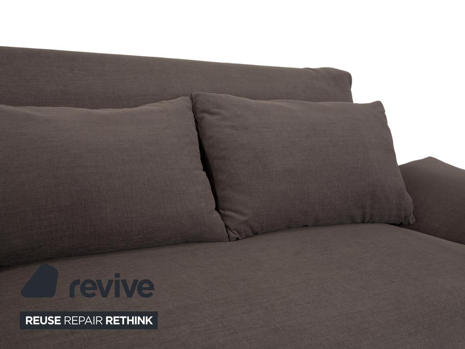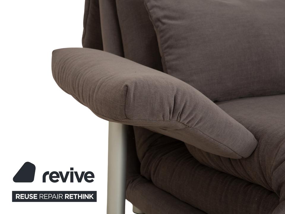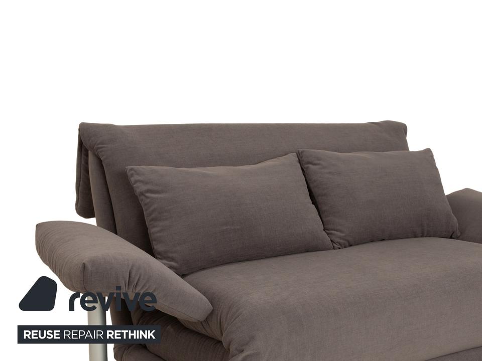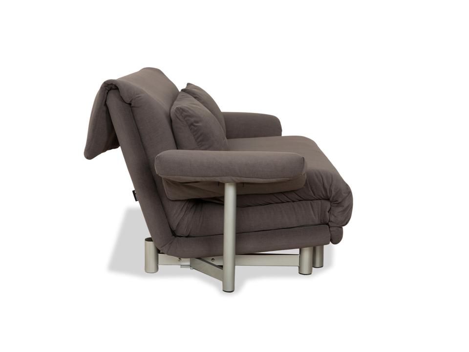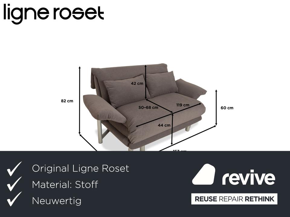 Das Sofa Multy von Ligne Roset ist mit einem grauen Stoff neu bezogen worden und steht auf einem silbernen Metallgestell. Das minimalistische Design und die komfortable Schlaffunktion zeichnen den Zweisitzer aus, der sich mit nur wenigen Handgriffen in ein Schlafsofa verwandeln lässt. Diese Ausführung verfügt über praktische und seitlich verstellbare Armlehnen.