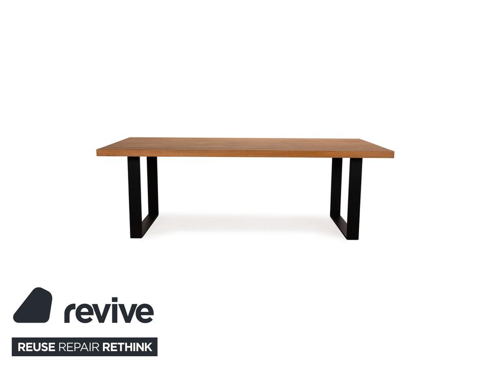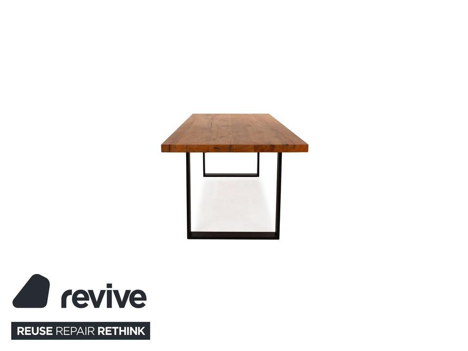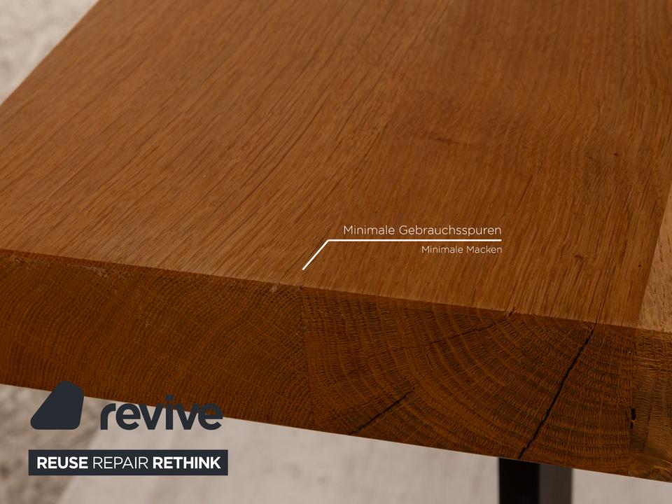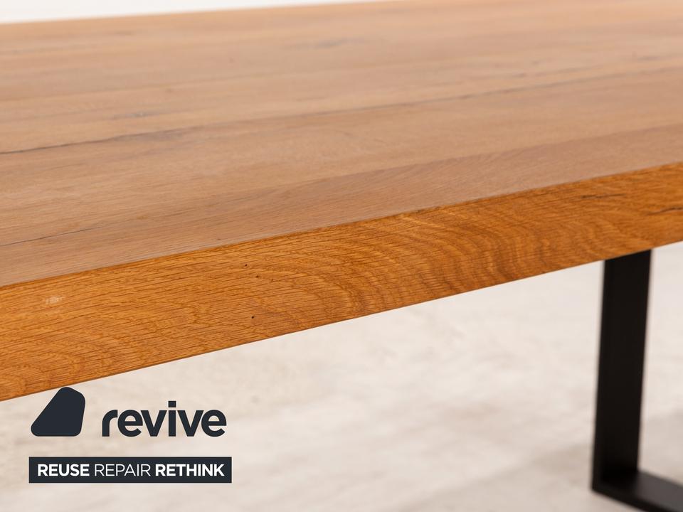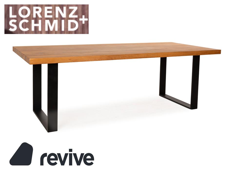 Der Esstisch von Lorenz&Schmid besteht aus einer Holzplatte und steht auf schwarzen Füßen. Er zeichnet sich durch die moderne, rustikale Optik aus.