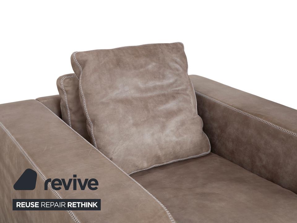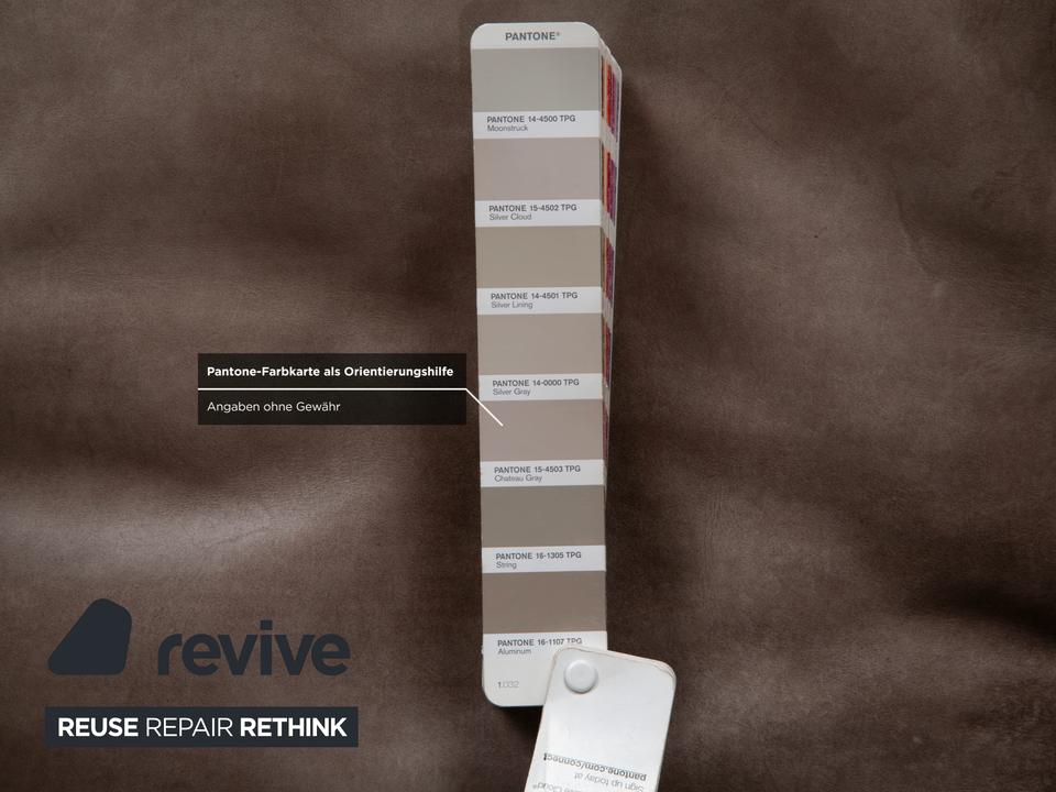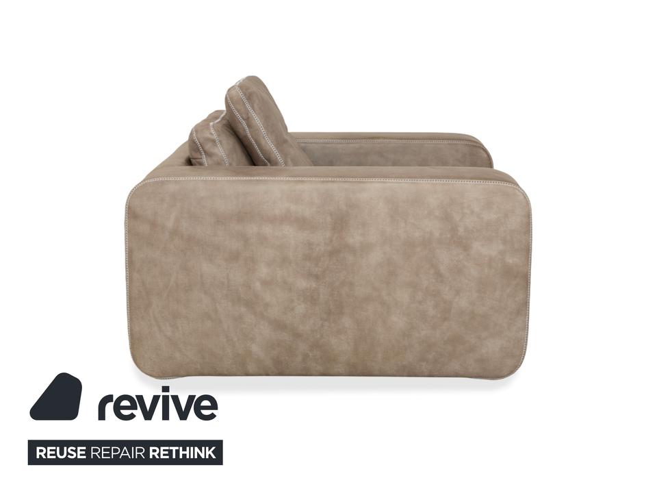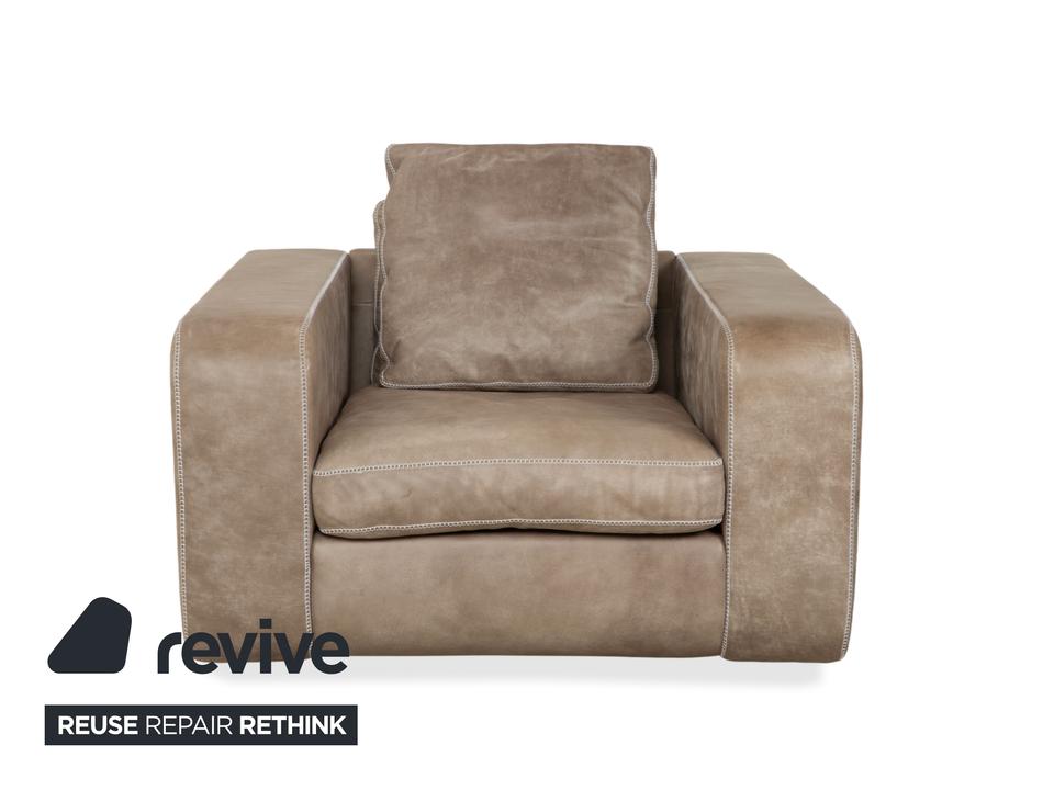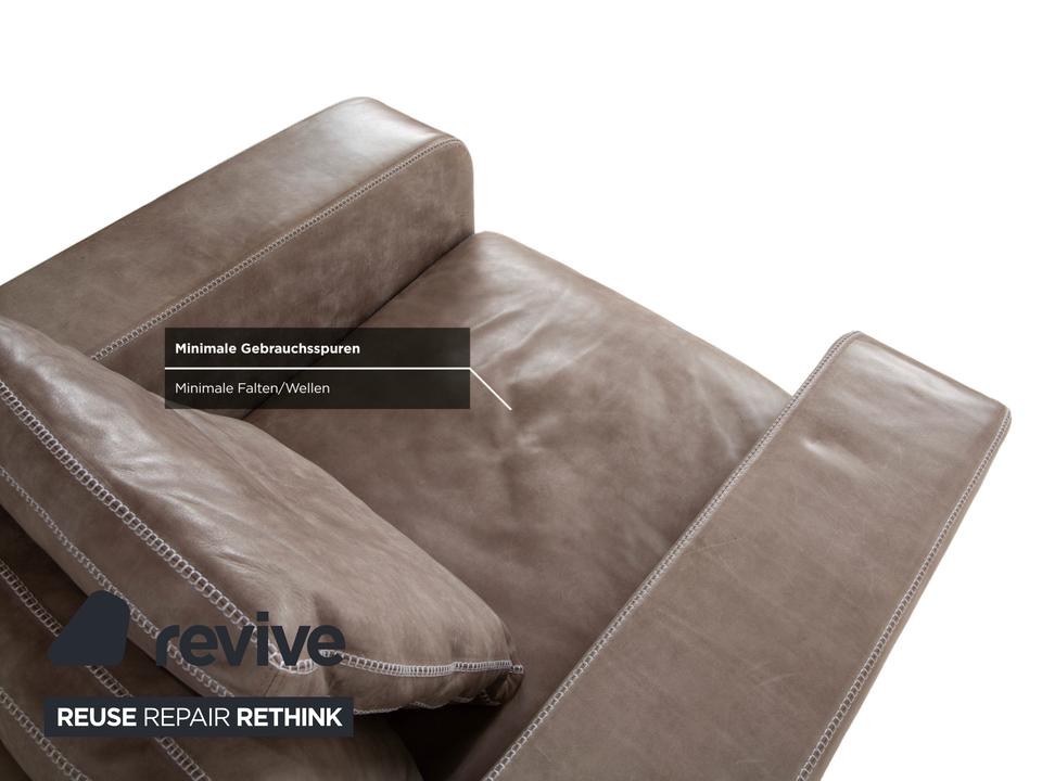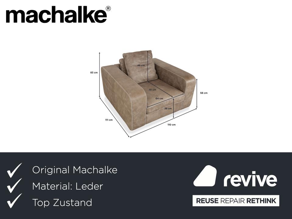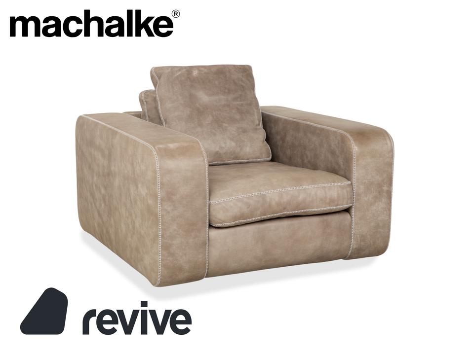 Machalke Valentino: Lässiger Luxus mit CharakterDieser Sessel ist das Gegenteil von steifem Repräsentations-Möbel – er ist ein Freund fürs Leben. Das Modell „Valentino“ der Manufaktur Machalke ist berühmt für seinen „Knautsch-Look“ und den unvergleichlichen Sitzkomfort.Der Sessel präsentiert sich als kompakter, bodennaher Kubus. Der Bezug aus grauem Leder (oft ein nubukartiges oder sehr weiches Glattleder) hat eine matte, samtige Oberfläche, die Wärme ausstrahlt. Die Form ist geprägt von den extrem breiten Armlehnen, die auf gleicher Höhe wie der Rückenrahmen verlaufen und dem Sessel seine Wucht nehmen.Das absolute Erkennungsmerkmal dieses Design-Klassikers ist die grobe, helle Ziernaht (Kettelnaht). Sie rahmt die Kanten des Sessels und bildet einen rustikalen, handwerklichen Kontrast zum grauen Leder. Ein loses Rückenkissen sorgt dafür, dass man nicht starr sitzt, sondern sich gemütlich in die tiefe Sitzfläche fallen lassen kann.