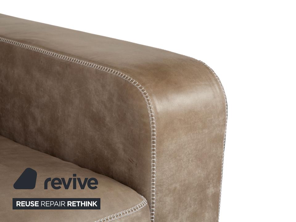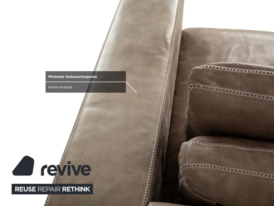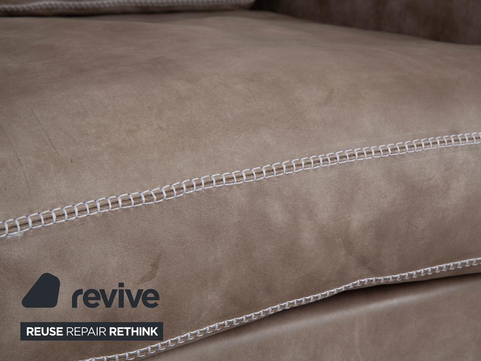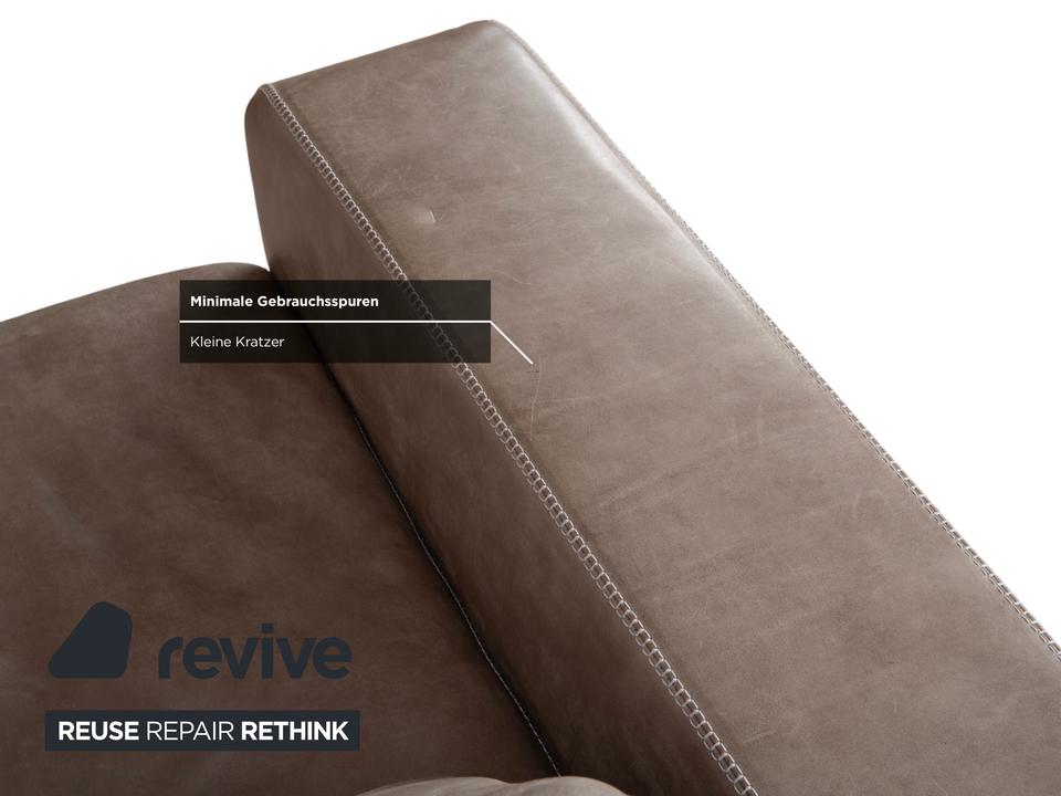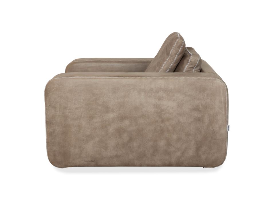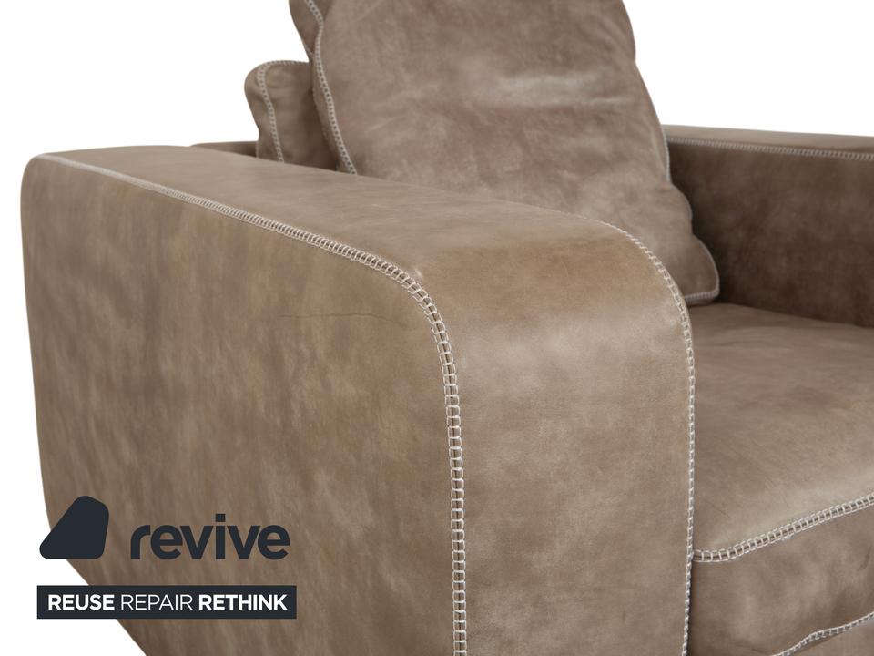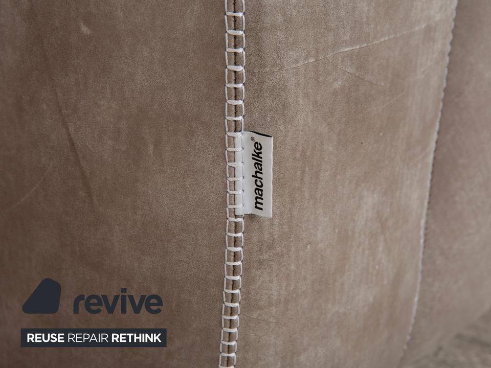 Machalke Valentino: Lässiger Luxus mit CharakterDieser Sessel ist das Gegenteil von steifem Repräsentations-Möbel – er ist ein Freund fürs Leben. Das Modell „Valentino“ der Manufaktur Machalke ist berühmt für seinen „Knautsch-Look“ und den unvergleichlichen Sitzkomfort.Der Sessel präsentiert sich als kompakter, bodennaher Kubus. Der Bezug aus grauem Leder (oft ein nubukartiges oder sehr weiches Glattleder) hat eine matte, samtige Oberfläche, die Wärme ausstrahlt. Die Form ist geprägt von den extrem breiten Armlehnen, die auf gleicher Höhe wie der Rückenrahmen verlaufen und dem Sessel seine Wucht nehmen.Das absolute Erkennungsmerkmal dieses Design-Klassikers ist die grobe, helle Ziernaht (Kettelnaht). Sie rahmt die Kanten des Sessels und bildet einen rustikalen, handwerklichen Kontrast zum grauen Leder. Ein loses Rückenkissen sorgt dafür, dass man nicht starr sitzt, sondern sich gemütlich in die tiefe Sitzfläche fallen lassen kann.