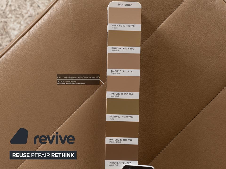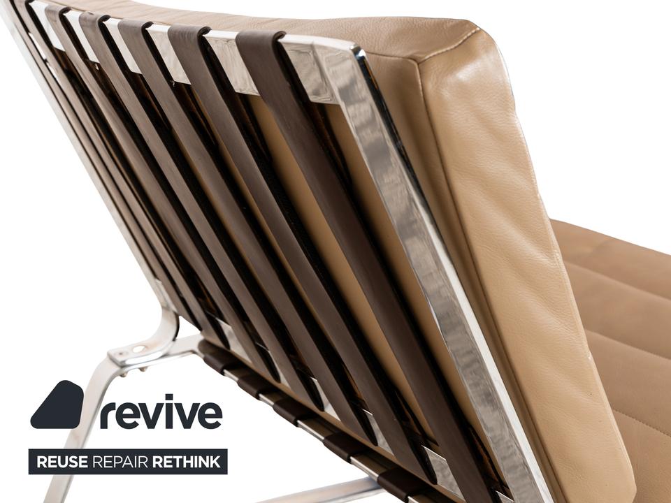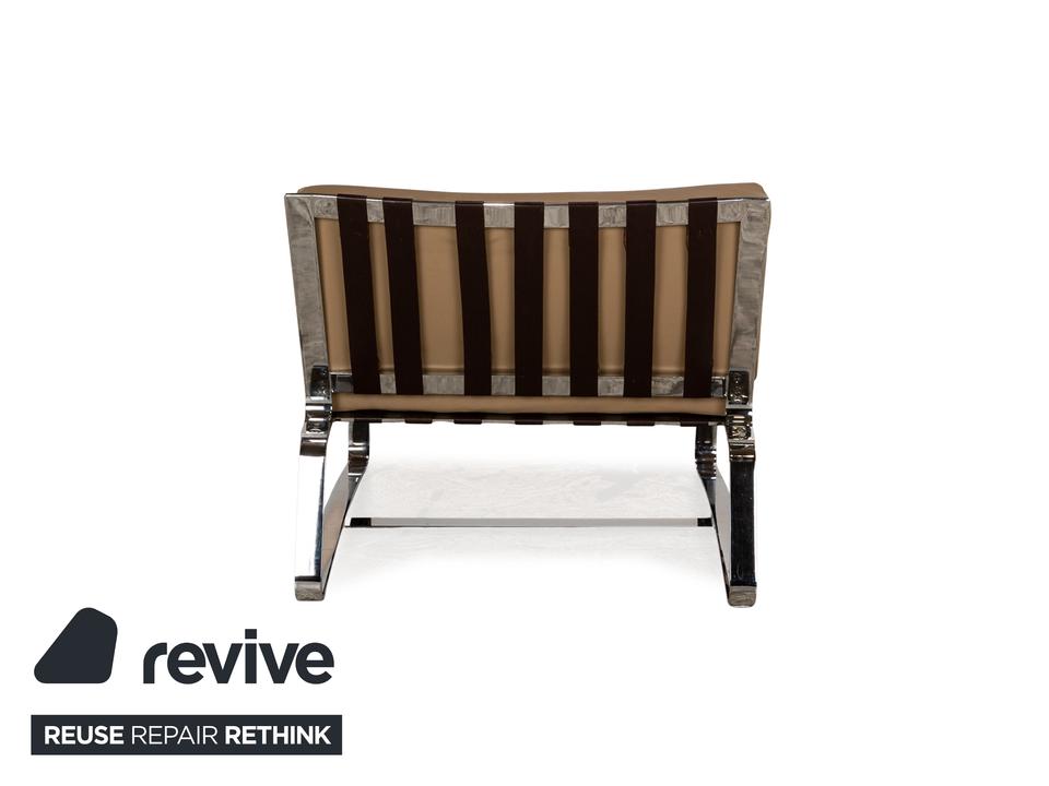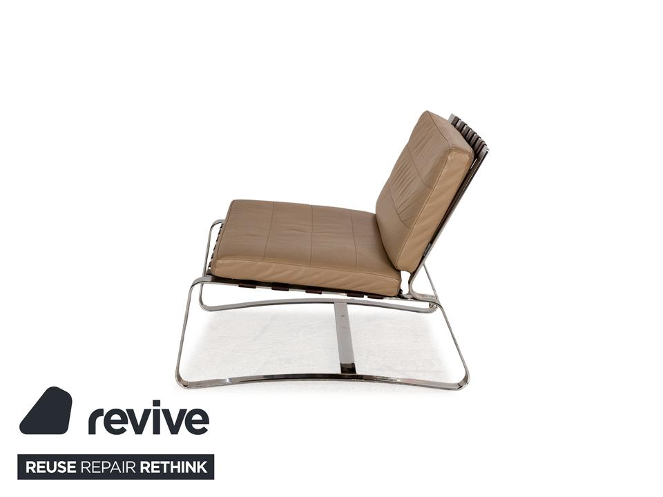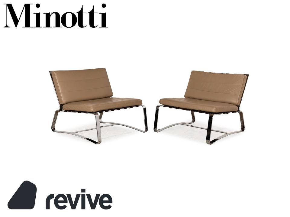 Die Sessel Garnitur Delaunary von Minotti ist mit einem beigen Echtleder bezogen und steht auf silbernen Metallfüßen. Sie zeichnet sich durch das moderne Design und die stilvolle, minimalistische Optik aus. Die Garnitur besteht aus zwei Sesseln.