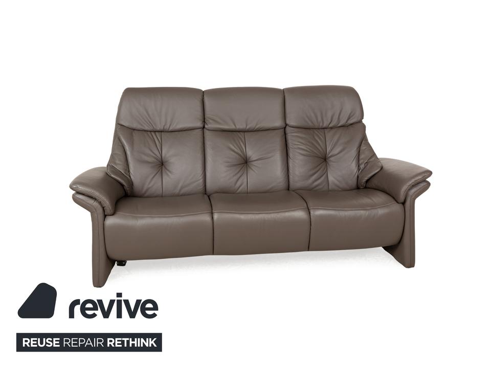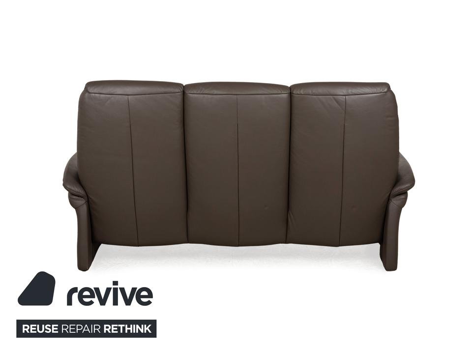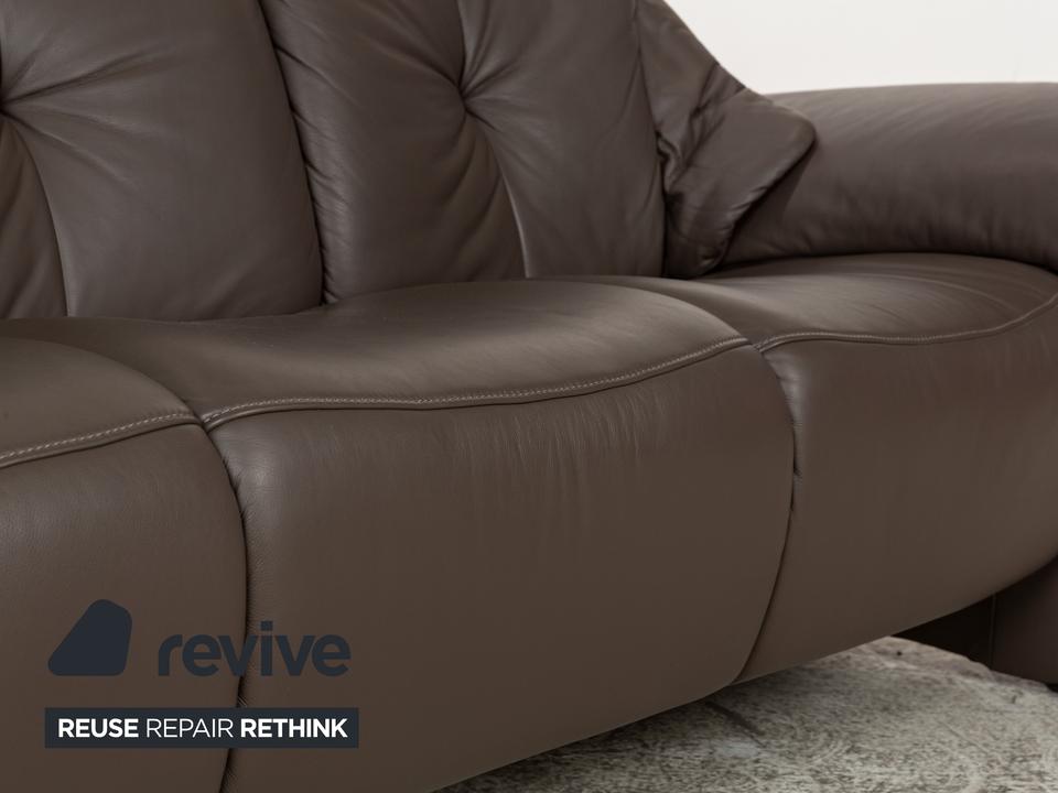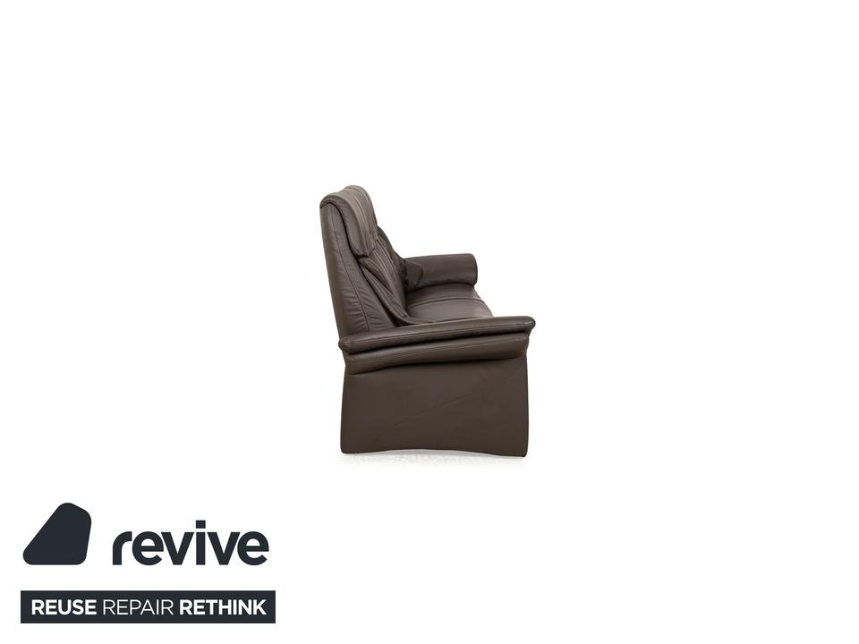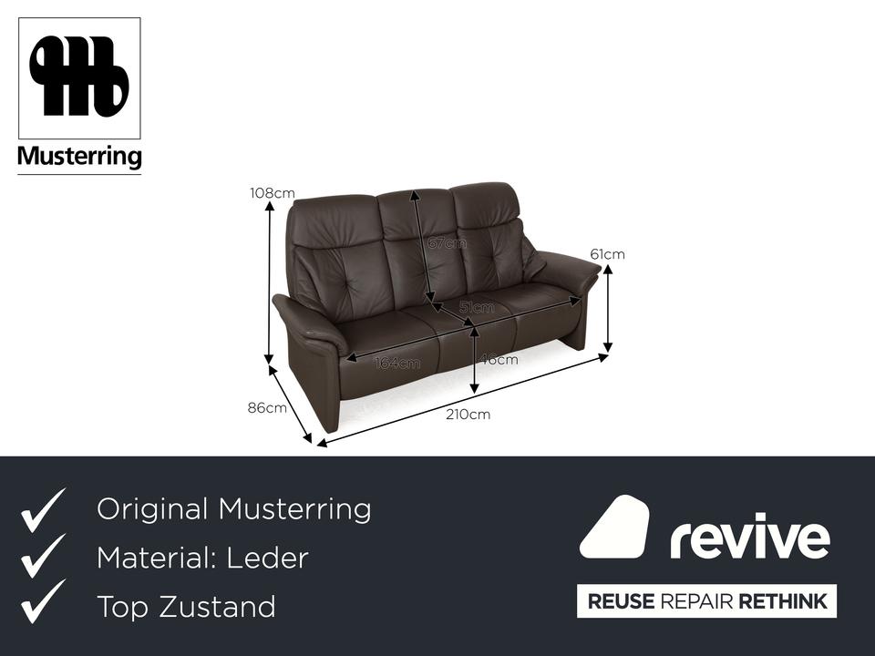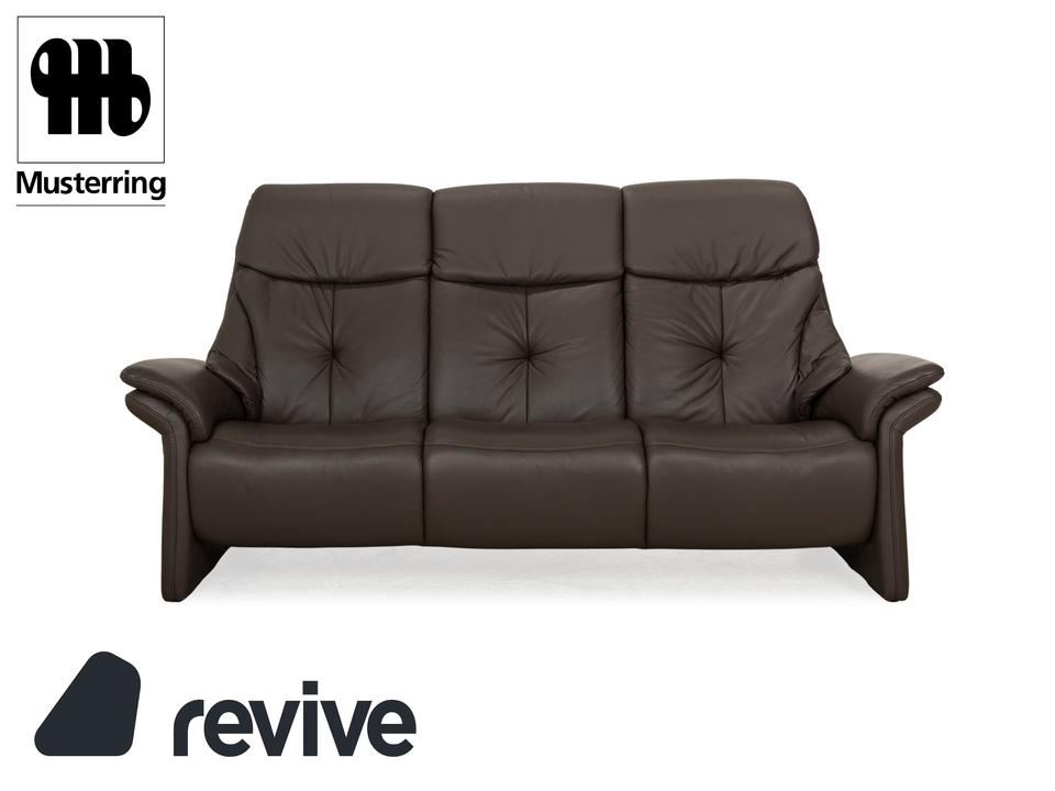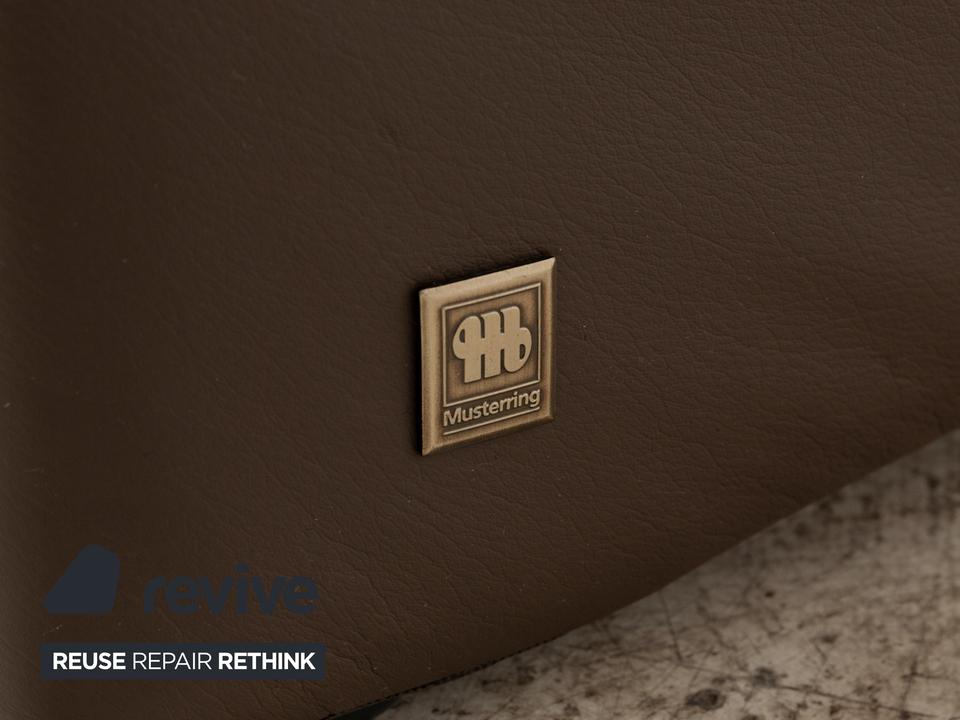 Das Musterring Sofa ist mit einem braunen Echtleder bezogen und steht auf bodentiefen Seitenteilen. Das klassische Design zeichnet den Dreisitzer aus.