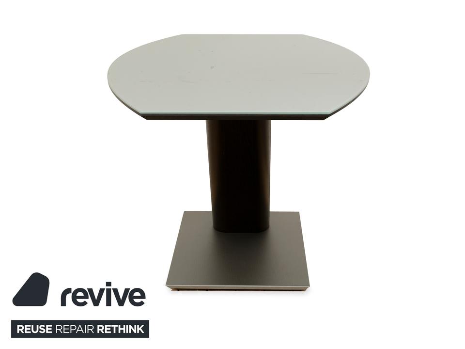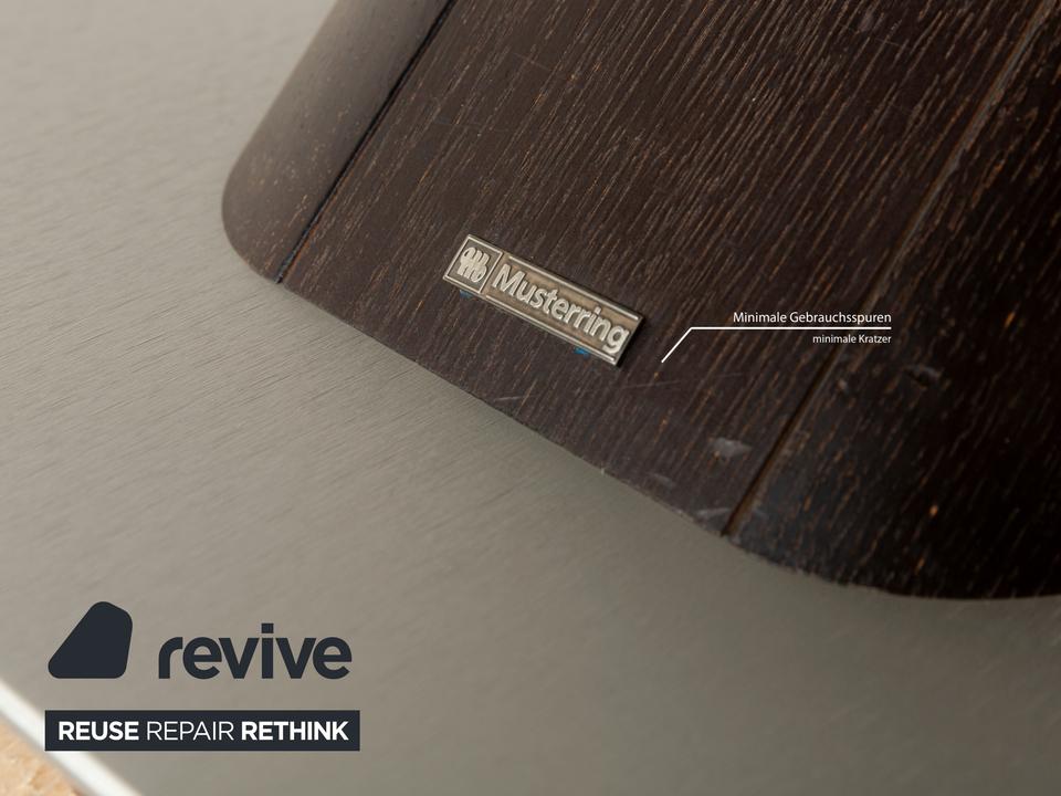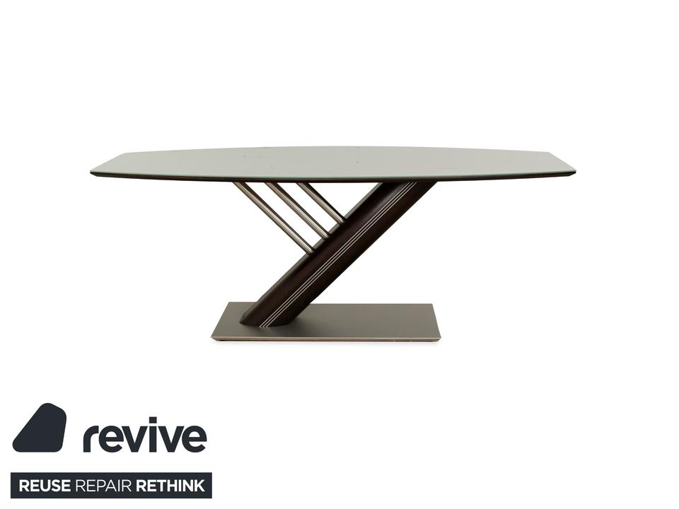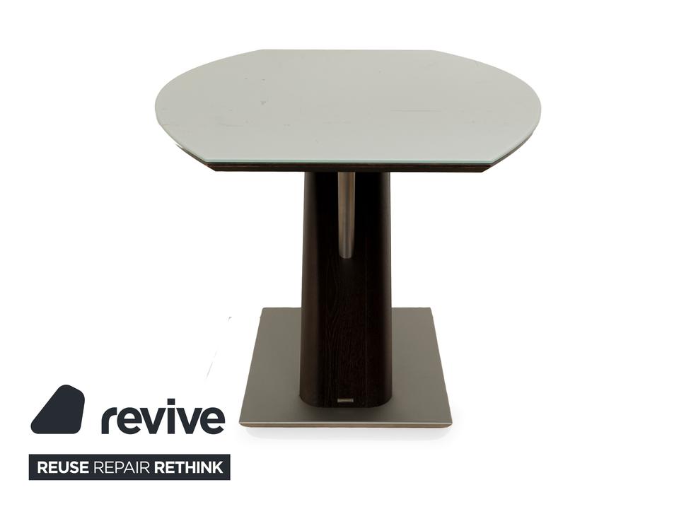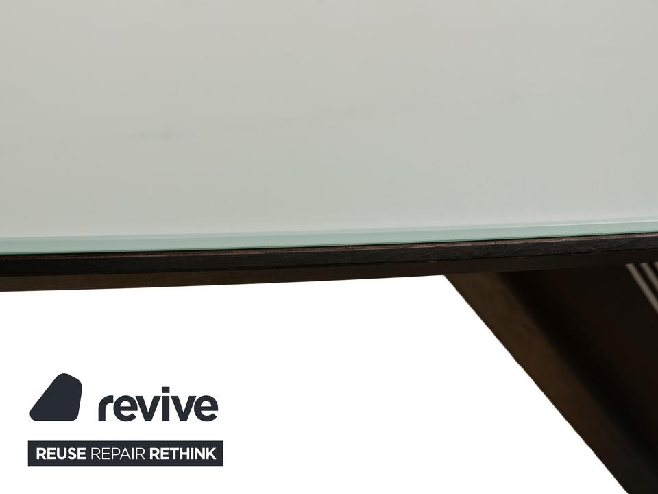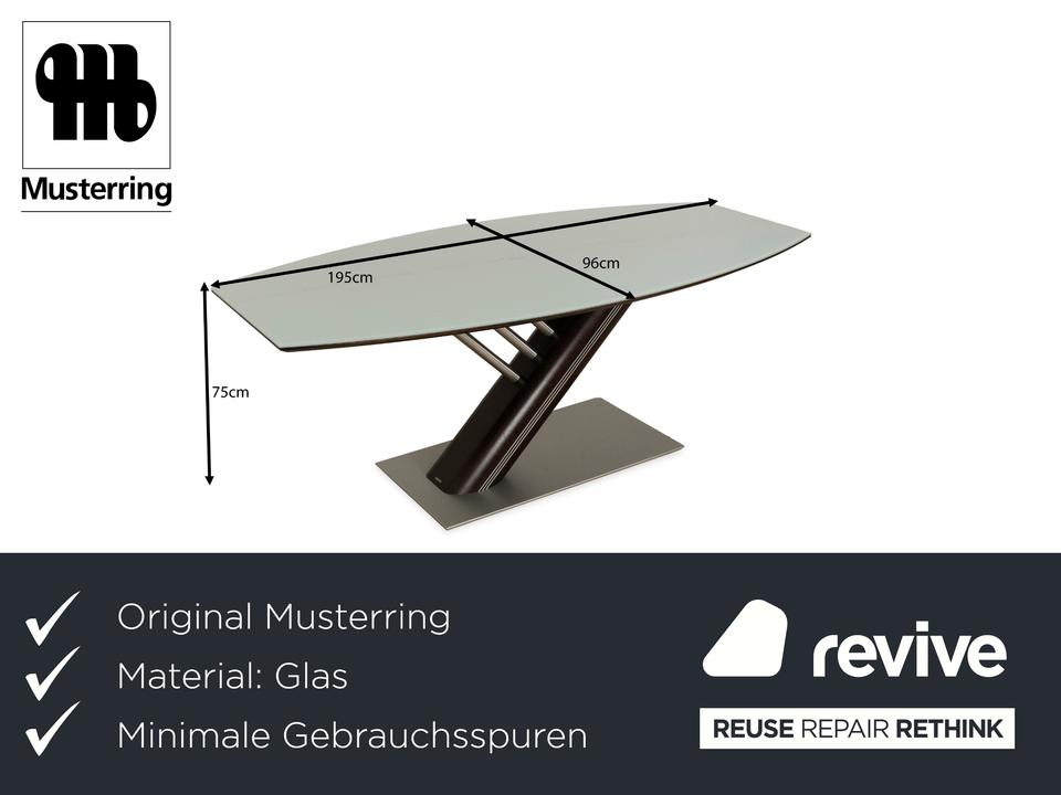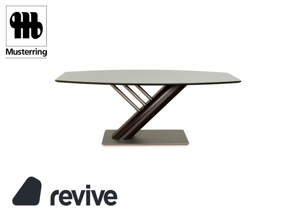 Der Esstisch Rosario von Musterring ist ein Zeichen für extravagantes Design. Die Tischplatte mit ihrer Grundform zwischen Ellipse und Rechteck ist auf einem schräg verlaufenden Holzträger in dunkelbraun montiert. Drei Metallelemente haben eine tragende, aber vor allem akzentsetzende Funktion und verleihen dem Tisch eine unaufdringliche Eleganz. Das Zusammenspiel der Materialien Holz, Glas und Metall und ihre verschiedenen Farben und Haptiken gehen hier eine gelungene Verbindung ein.