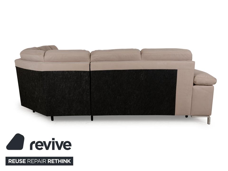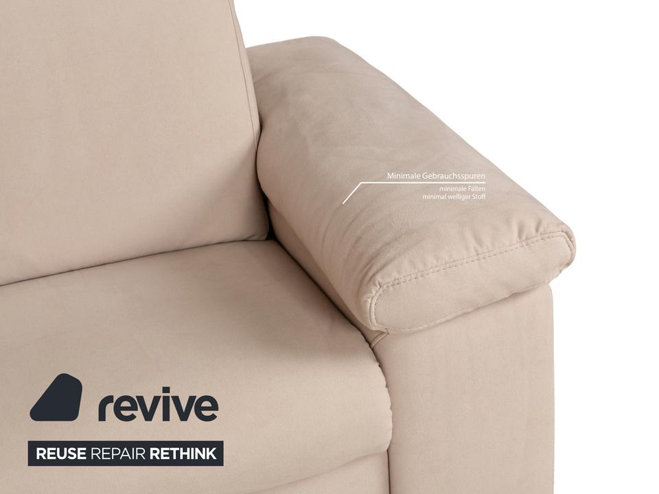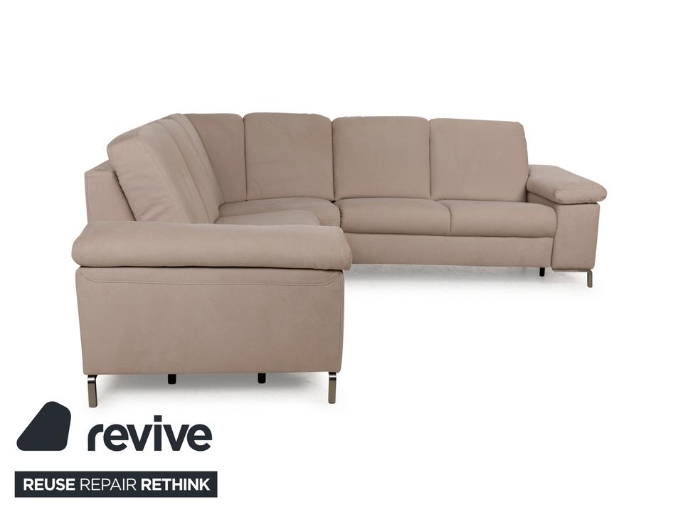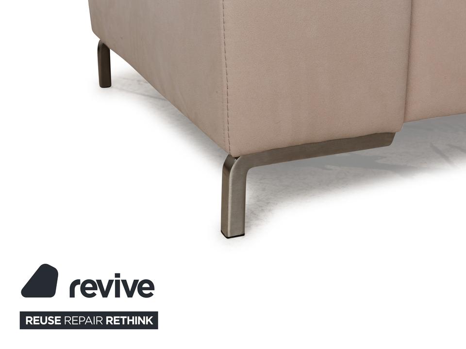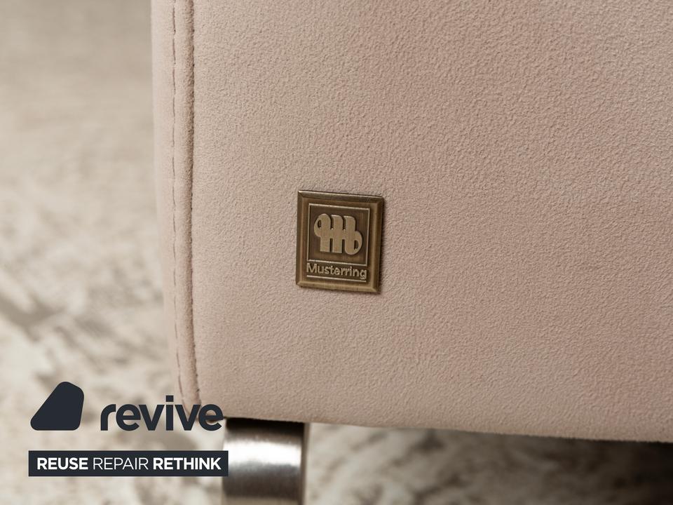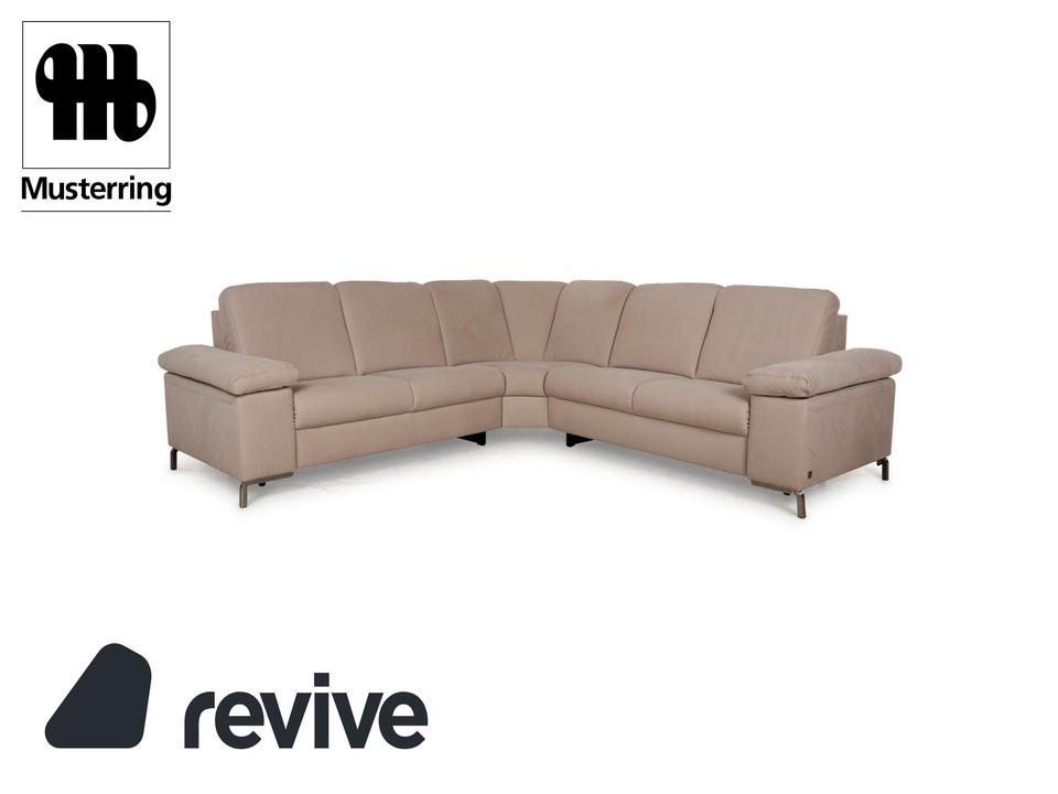 Das Sofa von Musterring ist mit einem beigefarbenen Stoff bezogen und steht auf schmalen Metallwinkeln als Beinen. Das Ecksofa zeichnet sich durch sein quadratisches Grunddesign und die komfortable Polsterung aus. Hohe Rückenlehnen und breite Armlehnen laden zum Verweilen ein.