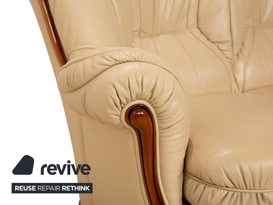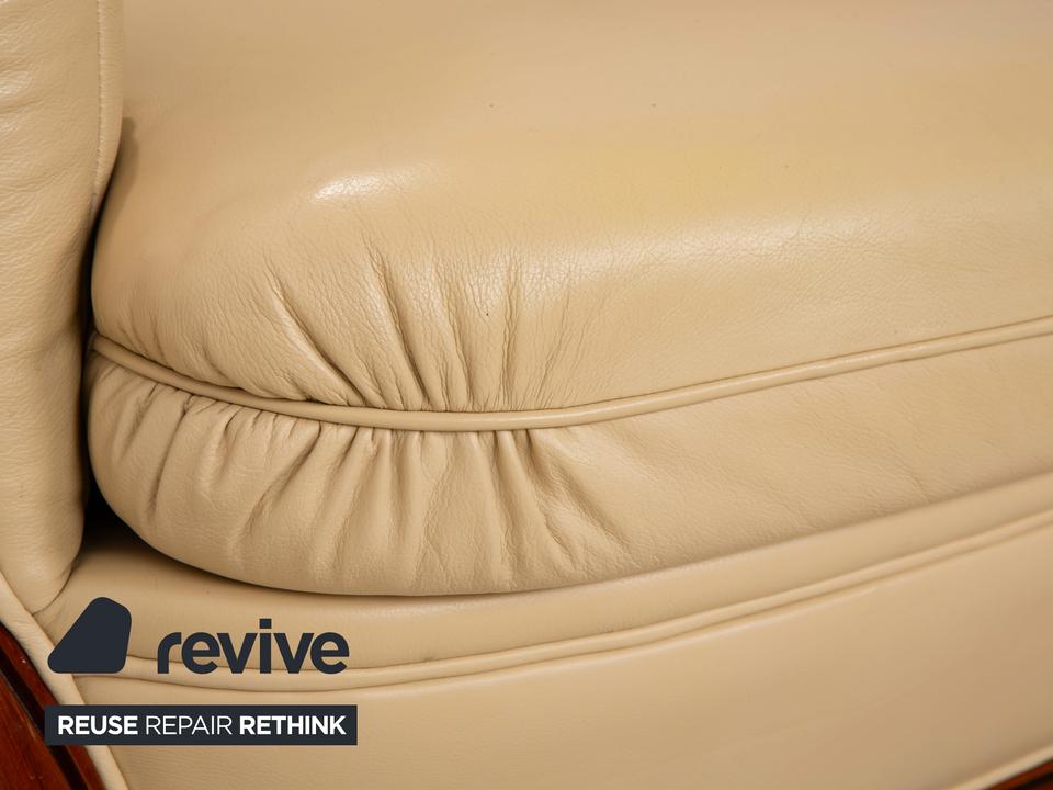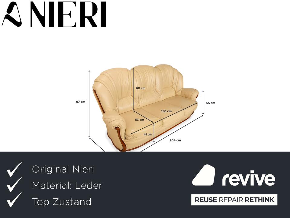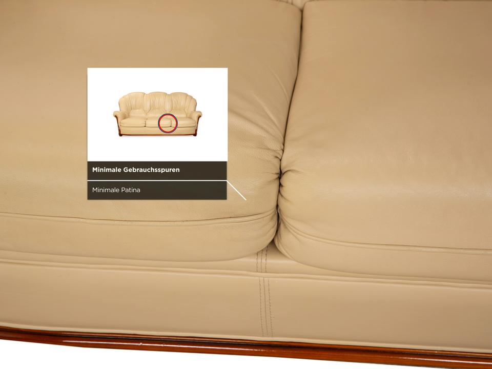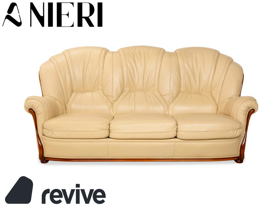 Mit diesem Dreisitzer der italienischen Manufaktur Nieri holst du dir ein Stück klassische Handwerkskunst ins Wohnzimmer. Das Sofa besticht durch seine geschwungenen, fast schon organischen Formen – hier ist nichts eckig oder hart. Besonders markant ist die sichtbare Holzleiste am unteren Rand, die dem cremefarbenen Leder einen edlen Rahmen gibt und wunderbar mit den geschwungenen Armlehnen harmoniert.Der Sitzkomfort ist typisch für Nieri: Du sitzt hier nicht auf einer weichen „Wolke“, sondern hast eine feste, ergonomisch geformte Polsterung, die dich gut stützt. Durch die hohe Rückenlehne mit der ausgeformten Nackenpartie kannst du dich entspannt zurücklehnen und hast auch bei längeren Gesprächen oder Fernsehabenden immer eine gute Haltung. Ein Sofa mit Charakter, das Wärme und eine gewisse mediterrane Eleganz ausstrahlt.