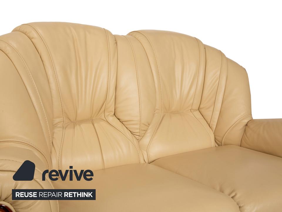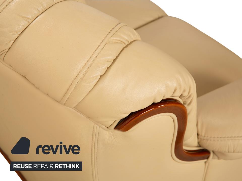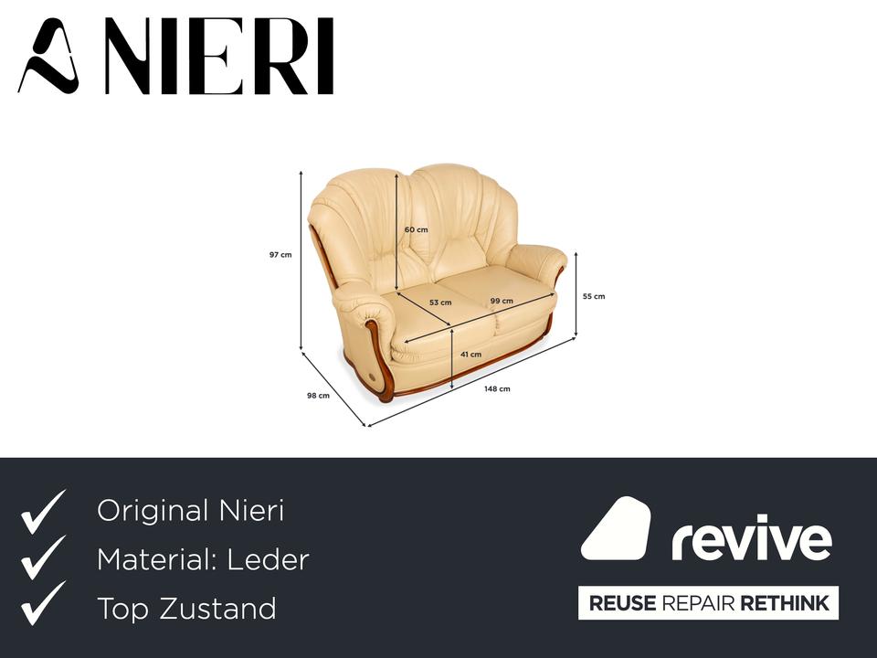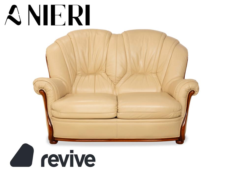 Dieser Zweisitzer ist die kompakte Antwort auf den großen Bruder und bringt den charmanten, italienischen Nieri-Stil auch in kleinere Stellflächen. Auch hier dominiert das hochwertige, cremefarbene Leder, das den Raum sofort heller und freundlicher wirken lässt. Die typischen Designmerkmale – wie die sanft geschwungenen Armlehnen und das edle Holzgestell an der Basis – machen den Sessel zu einem echten Blickfang.Da es sich um einen Zweisitzer handelt, wirkt das Modell etwas knuffiger und einladender. Es ist der perfekte Platz für vertrauliche Gespräche oder um es sich alleine mit viel Platz gemütlich zu machen. Die Polsterung ist formstabil und bietet dir dank der hohen Lehne genau die Unterstützung im Rücken, die man bei modernen Low-Profile-Sofas oft vermisst.