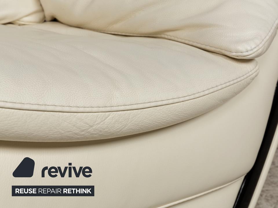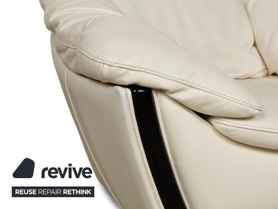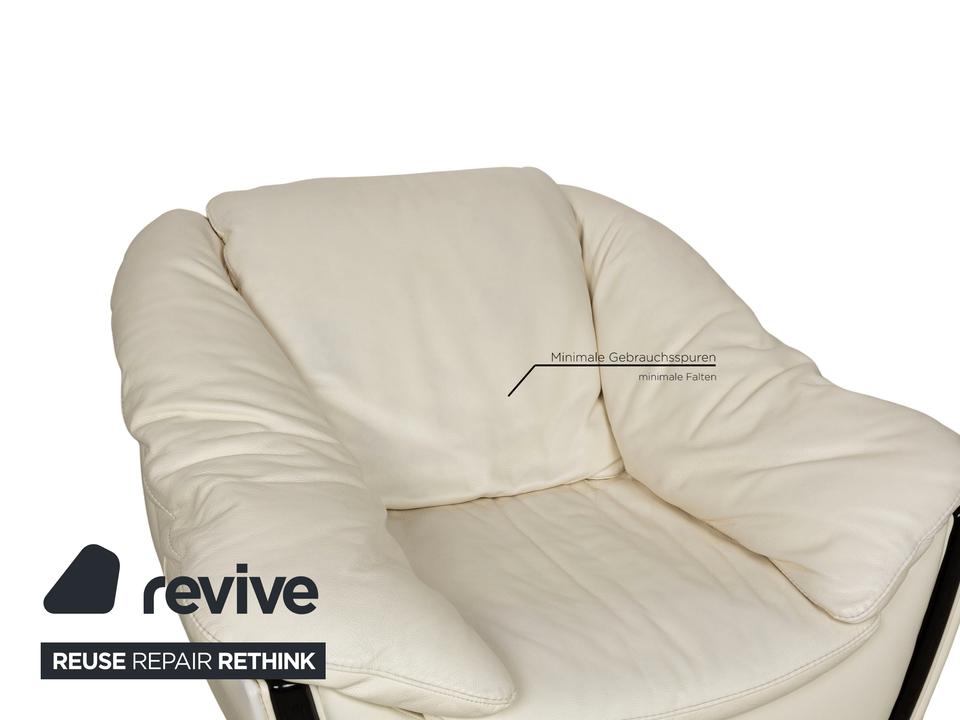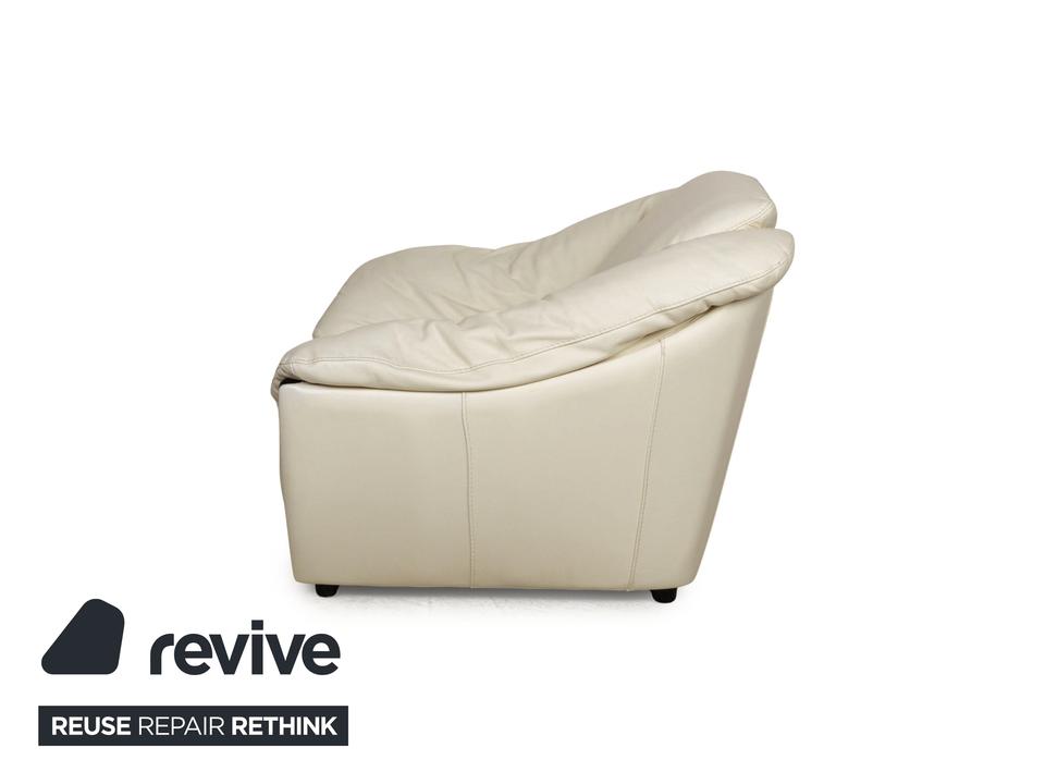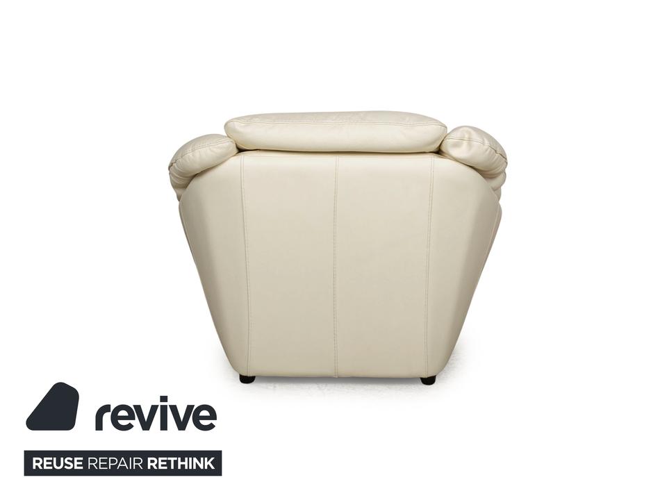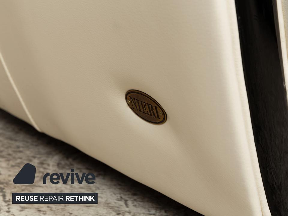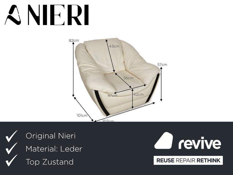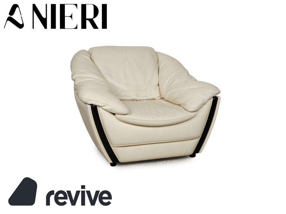 Der Sessel von Nieri ist mit einem cremefarbenen Echtleder bezogen und steht auf kleinen, schwarzen Füßen. Die abgerundeten Kanten und das klassische Design zeichnen ihn aus.