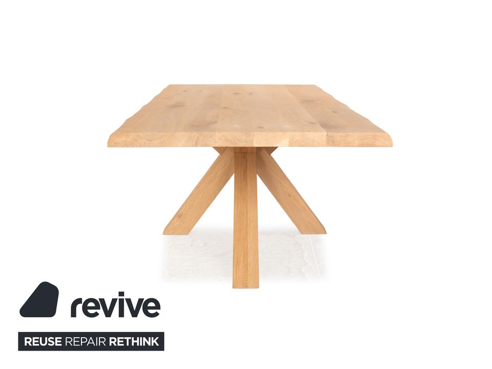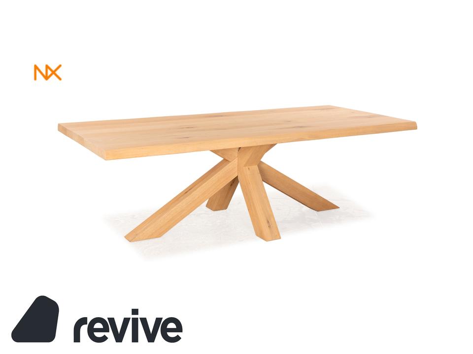 Der Esstisch von PMP Furniture besteht aus einer braunen Holzplatte und steht auf einem stilvolle Holzfuß. Er zeichnet sich durch die rustikale Optik und das massive Design aus.