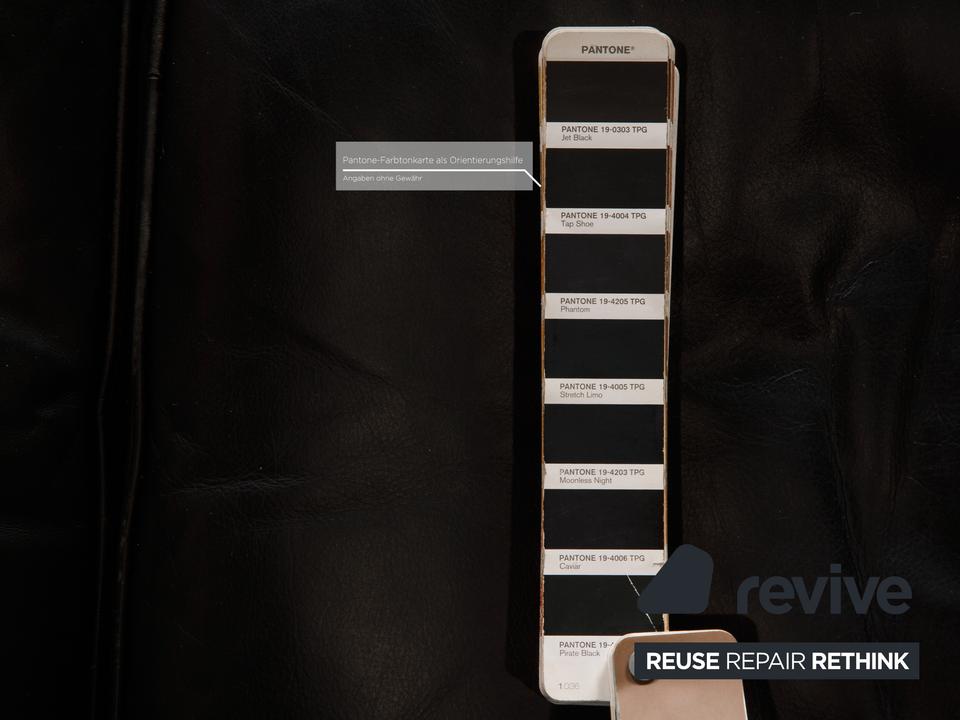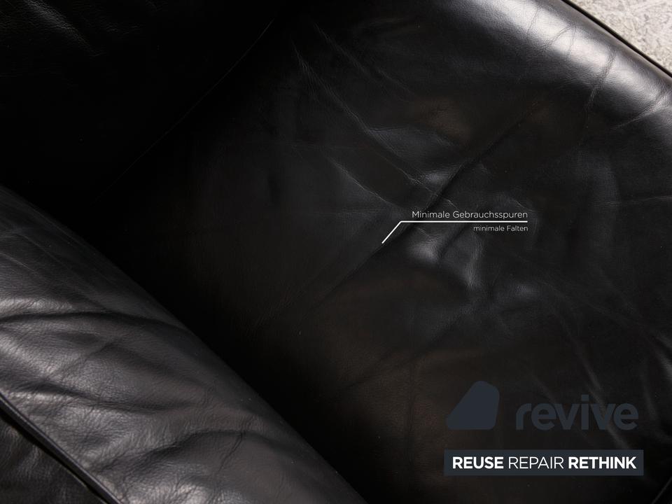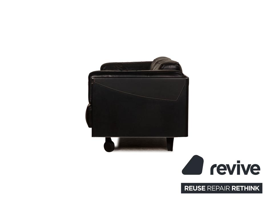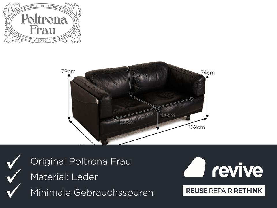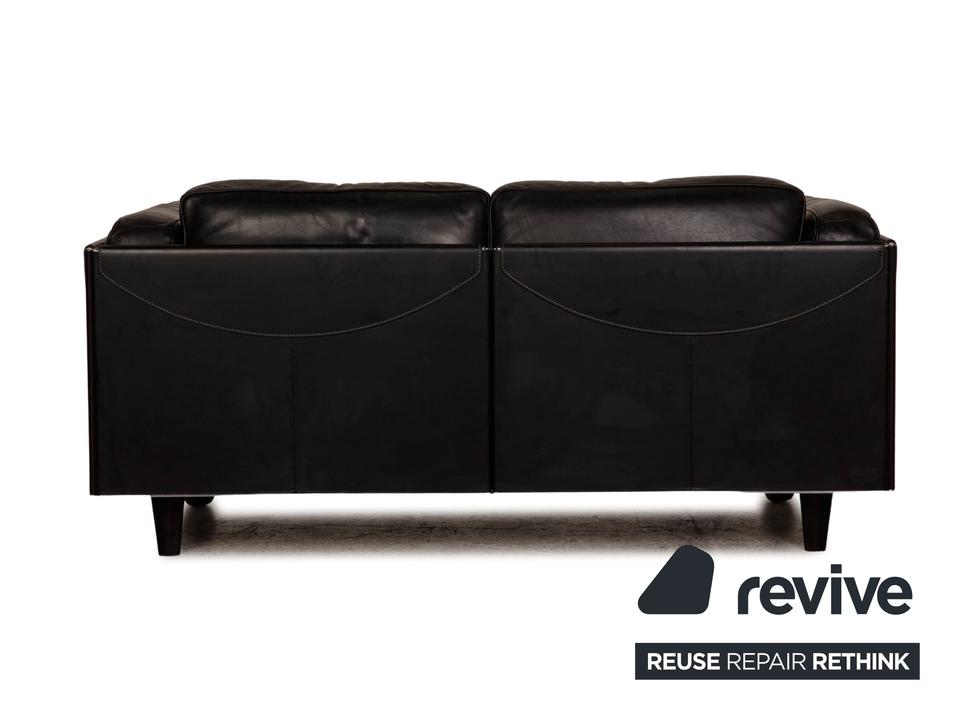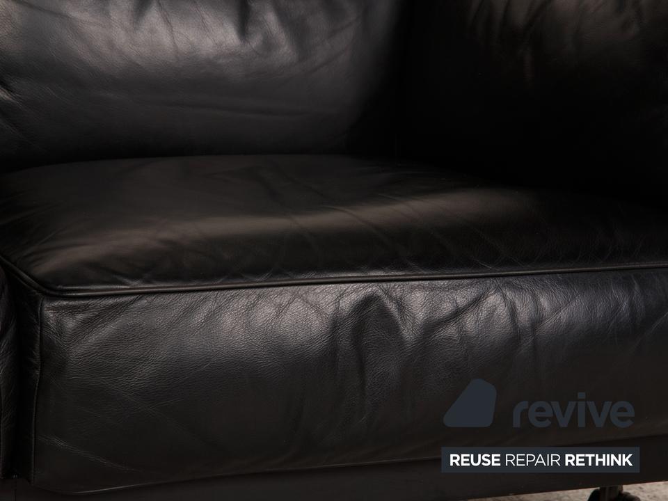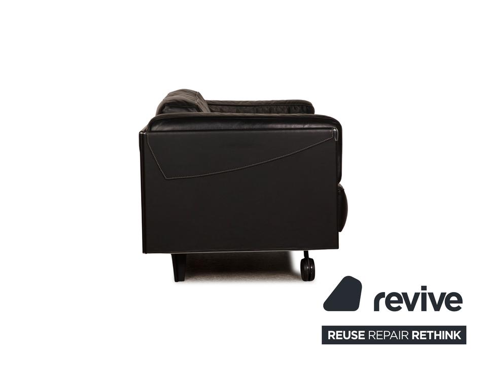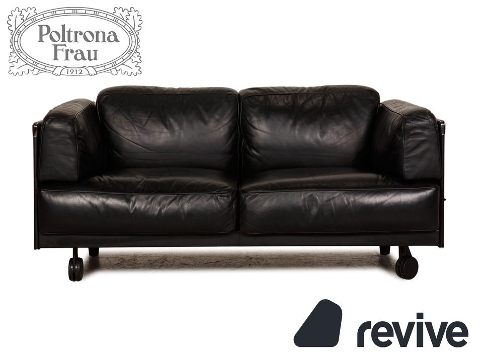 Das Twice Sofa von Poltrona Frau ist mit einem schwarzen Echtleder bezogen und steht auf schwarzen Rollen. Das zeitlose Design und die abgerundeten Kanten zeichnen den Zweisitzer aus.