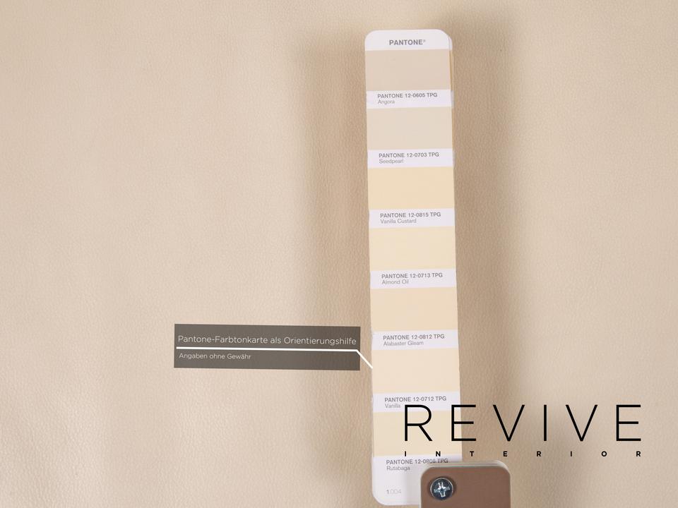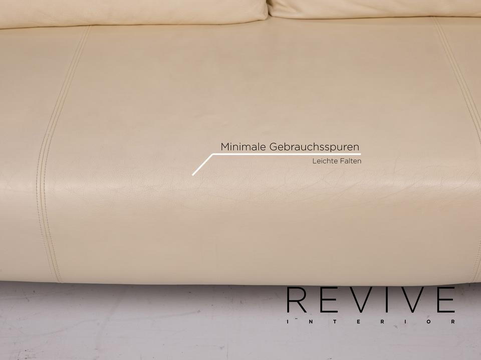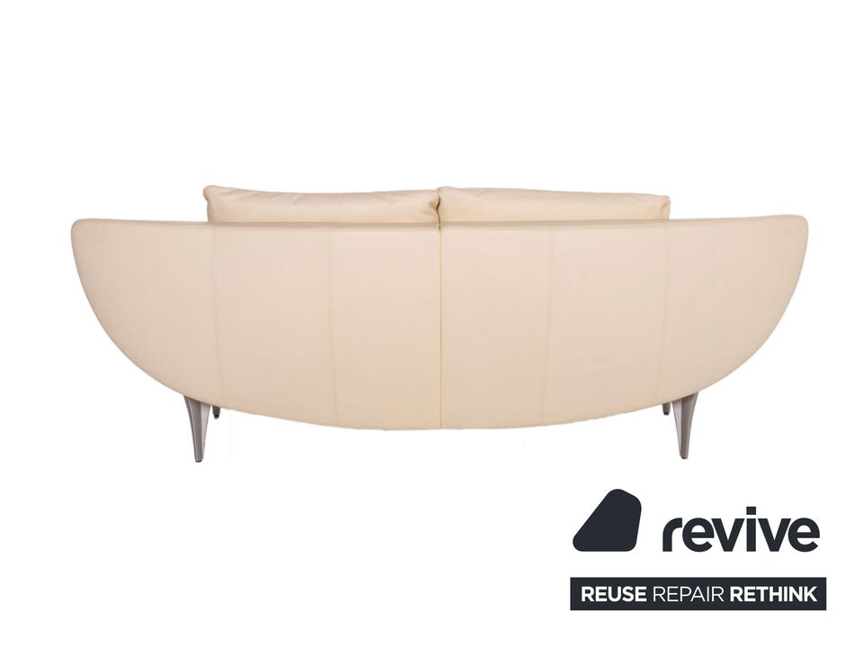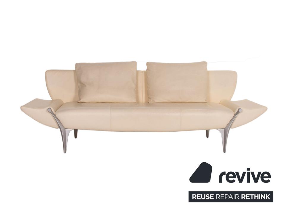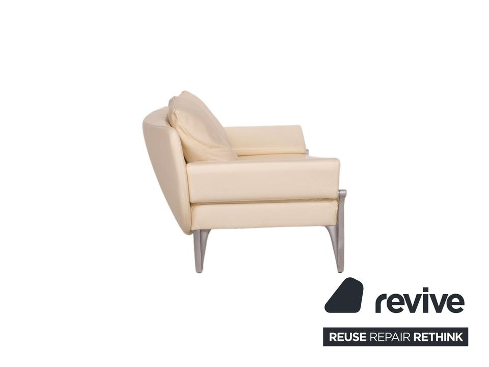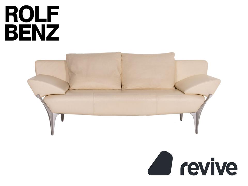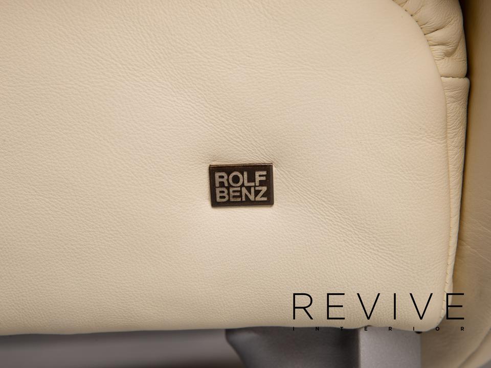 Das Modell 1600 von Rolf Benz ist mit einem cremefarbenen Echtleder bezogen und steht auf dynamisch geformten, matten Metallfüßen. Das Sofa zeichnet sich besonders durch sein futuristisches Design aus. Die Armlehnen können nach unten geklappt werden, die Kissen sind von einem anderen Hersteller.