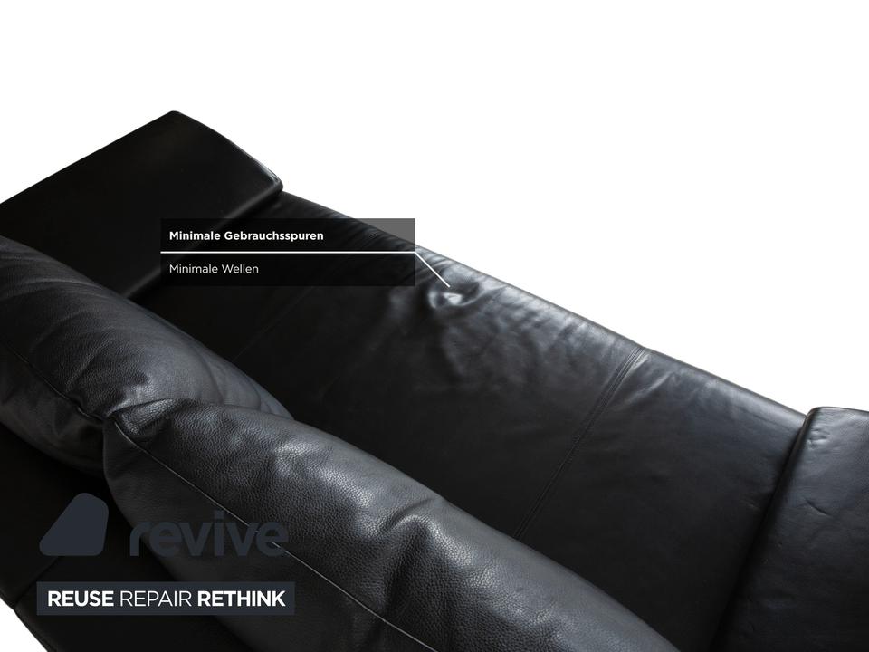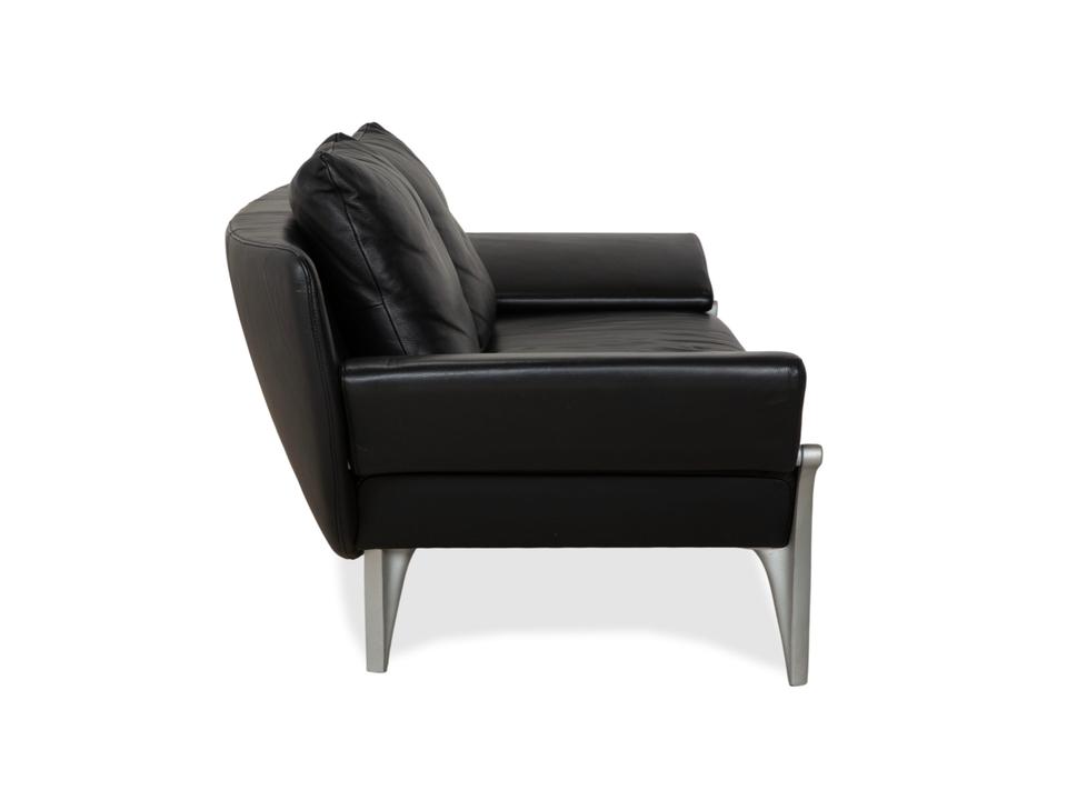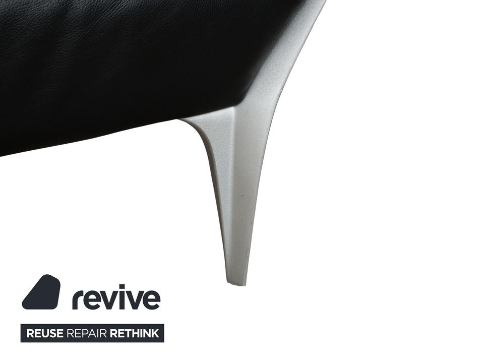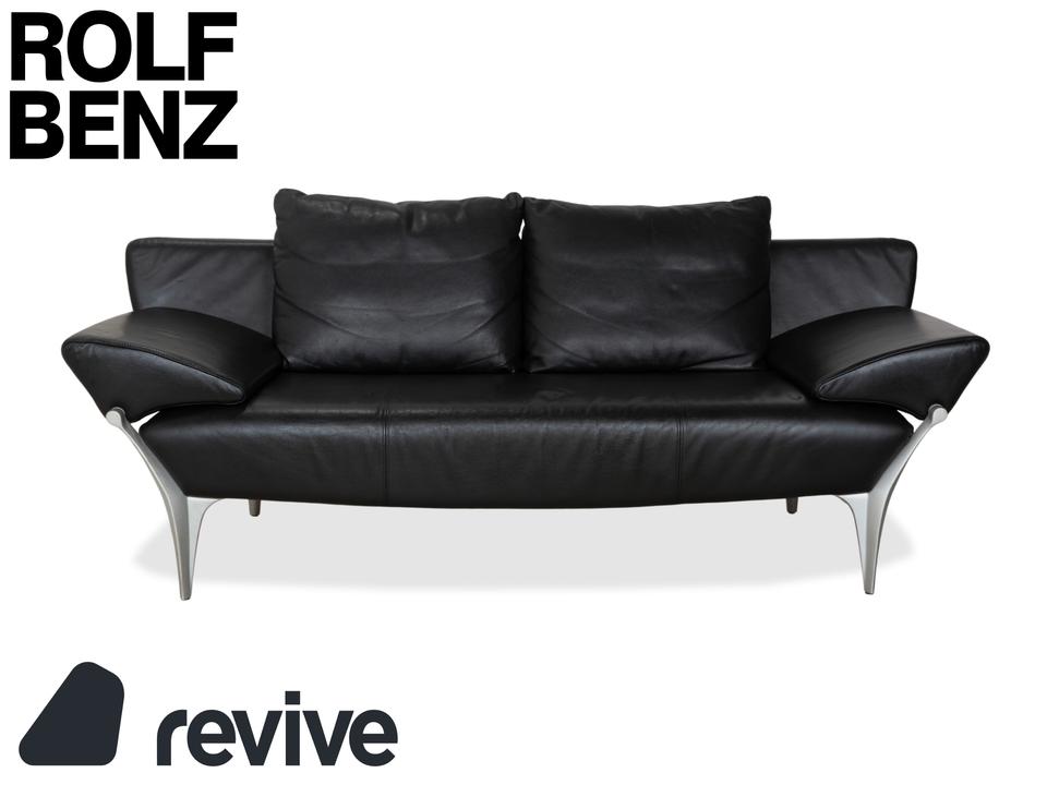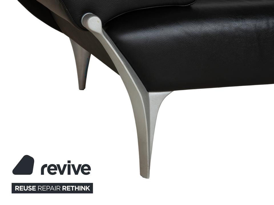 Rolf Benz 1600: Skulpturales Design mit CharakterDieses Sofa ist ein echter Design-Klassiker, der sich nicht verstecken muss. Das Modell 1600 von Rolf Benz ist bekannt für seine extravagante Formensprache, die Eleganz mit einer fast schon futuristischen Leichtigkeit verbindet.Der Zweisitzer ist in hochwertiges, schwarzes Leder gehüllt. Die Oberfläche zeigt einen edlen, sanften Glanz und wirkt durch die weiche Polsterung einladend und nicht kühl. Das auffälligste Merkmal ist die geschwungene Silhouette: Die Armlehnen sind nicht starr und gerade, sondern neigen sich wie Flügel elegant nach außen. Dies verleiht dem Sofa eine dynamische, offene Optik, die den Raum nicht blockiert, sondern bereichert.Für den typischen Rolf-Benz-Komfort sorgen die zwei großen, losen Rückenkissen. Sie wirken bewusst leger und „knautschig“, was sofortige Gemütlichkeit verspricht und den strengen Leder-Look aufbricht. Getragen wird das Kunstwerk von markanten Aluminium-Gussfüßen. Diese silbernen Beine sind organisch geschwungen – fast wie Stilettos – und laufen spitz zu. Sie heben den Korpus weit vom Boden ab und unterstreichen die schwebende Anmutung des Designs.