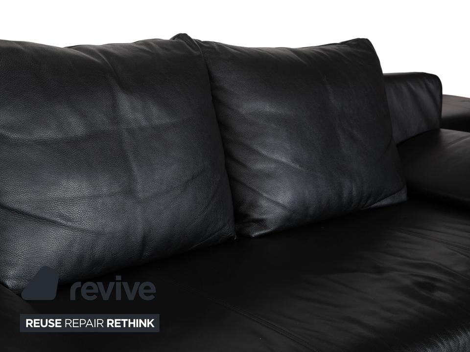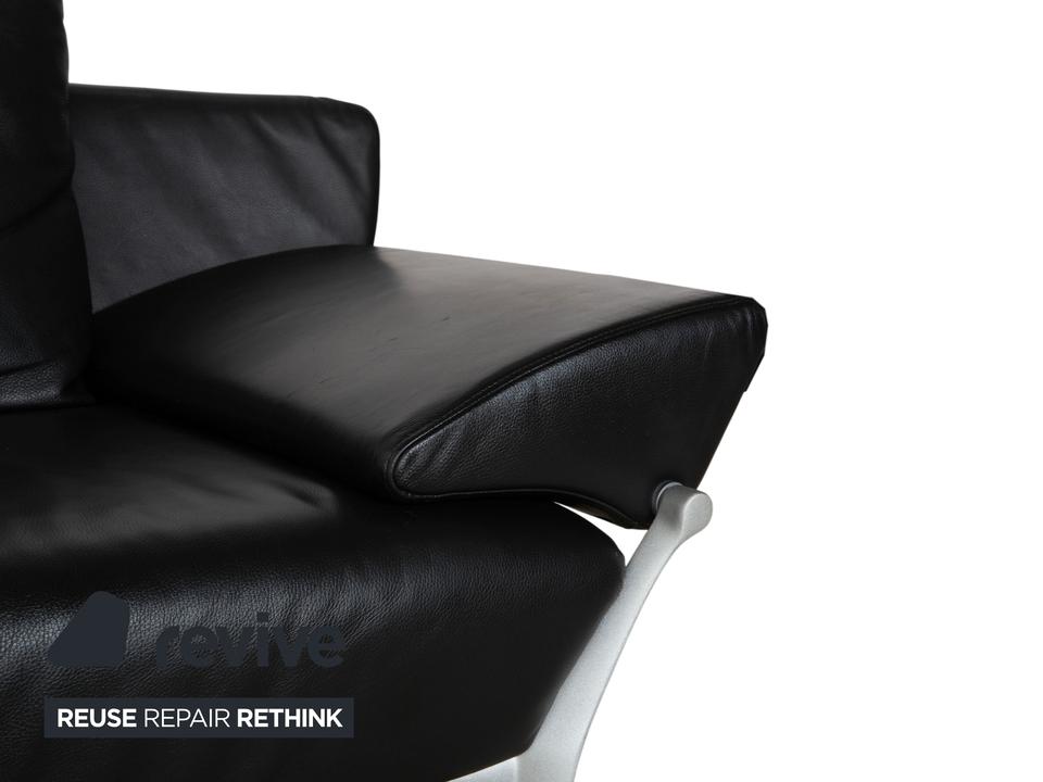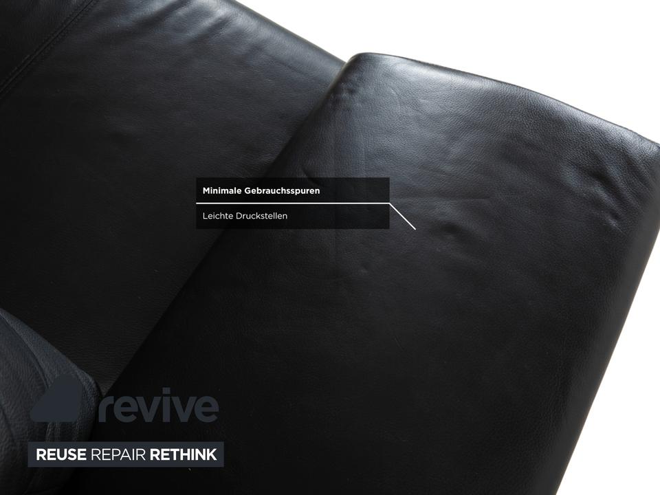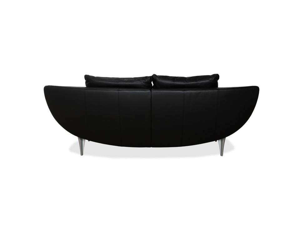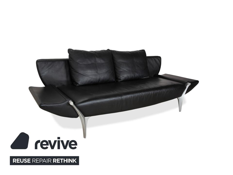 Rolf Benz 1600: Skulpturales Design mit CharakterDieses Sofa ist ein echter Design-Klassiker, der sich nicht verstecken muss. Das Modell 1600 von Rolf Benz ist bekannt für seine extravagante Formensprache, die Eleganz mit einer fast schon futuristischen Leichtigkeit verbindet.Der Zweisitzer ist in hochwertiges, schwarzes Leder gehüllt. Die Oberfläche zeigt einen edlen, sanften Glanz und wirkt durch die weiche Polsterung einladend und nicht kühl. Das auffälligste Merkmal ist die geschwungene Silhouette: Die Armlehnen sind nicht starr und gerade, sondern neigen sich wie Flügel elegant nach außen. Dies verleiht dem Sofa eine dynamische, offene Optik, die den Raum nicht blockiert, sondern bereichert.Für den typischen Rolf-Benz-Komfort sorgen die zwei großen, losen Rückenkissen. Sie wirken bewusst leger und „knautschig“, was sofortige Gemütlichkeit verspricht und den strengen Leder-Look aufbricht. Getragen wird das Kunstwerk von markanten Aluminium-Gussfüßen. Diese silbernen Beine sind organisch geschwungen – fast wie Stilettos – und laufen spitz zu. Sie heben den Korpus weit vom Boden ab und unterstreichen die schwebende Anmutung des Designs.