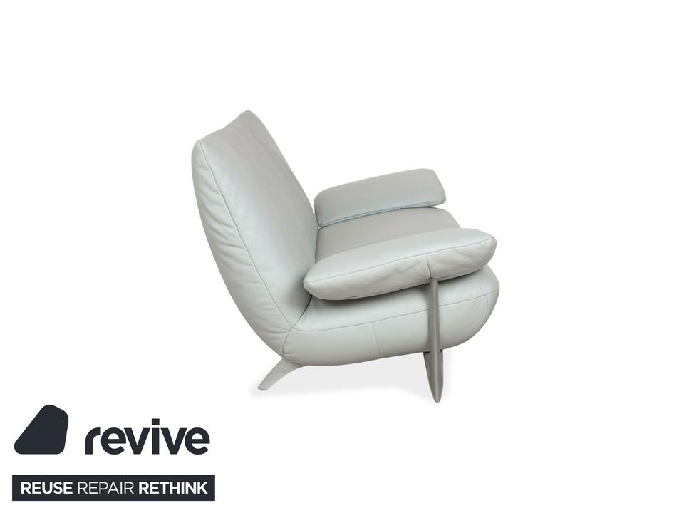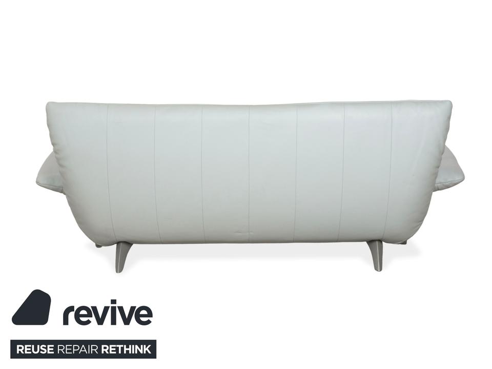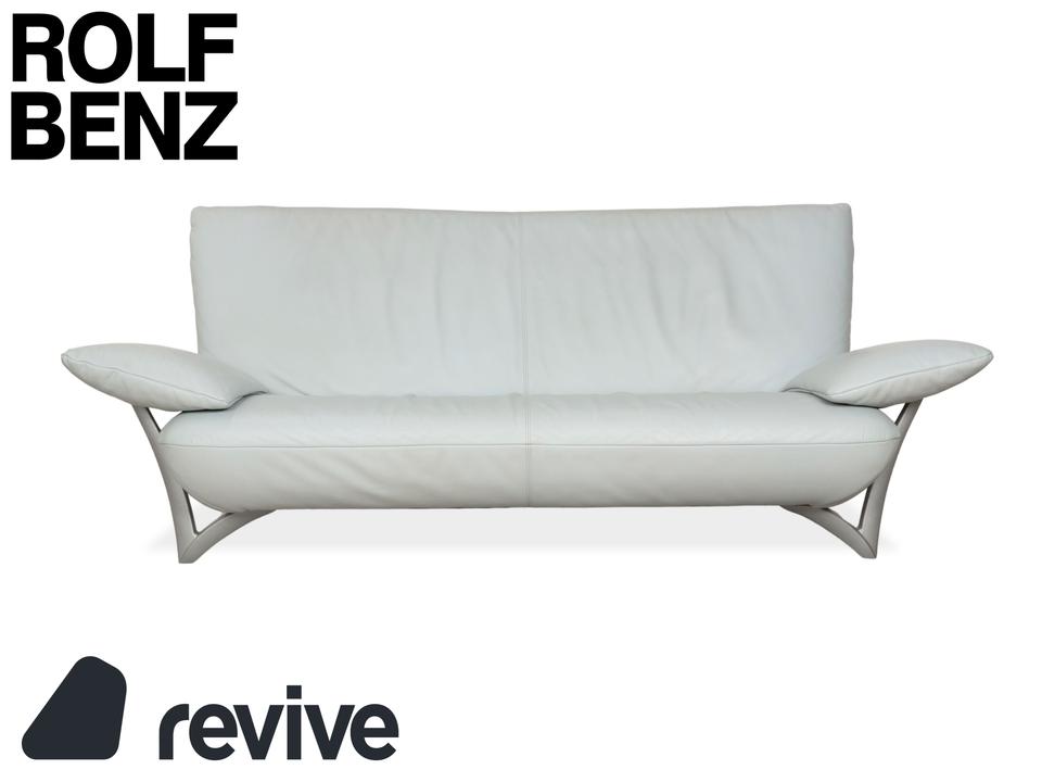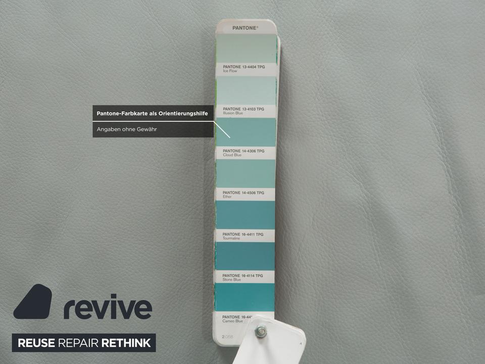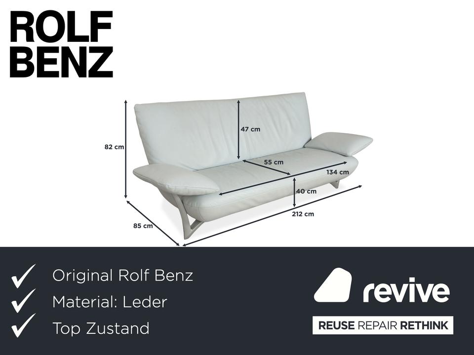 Der 1900 Dreisitzer von Rolf Benz ist mit einem hellblauen Echtleder bezogen. Auffällig ist das geschwungenen Metallgestell der Armlehnen, welches klare Linien mit weich abgerundeten Formen kombiniert. Das moderne Design und die abgerundeten Kanten zeichnen den Dreisitzer aus.