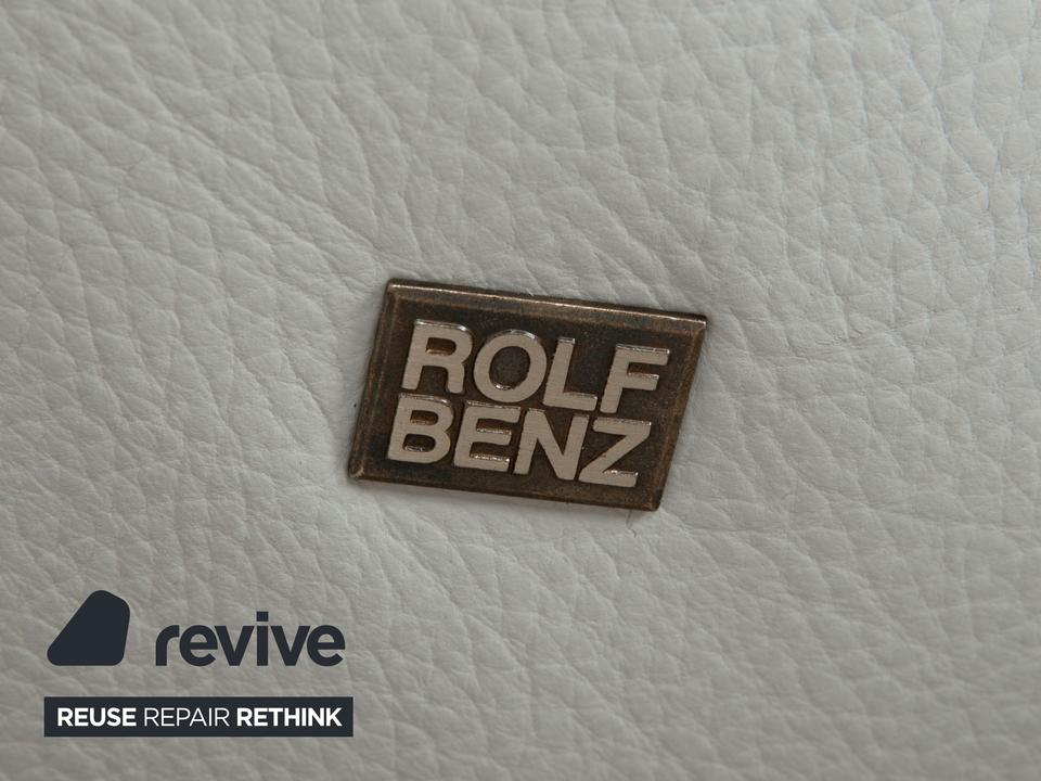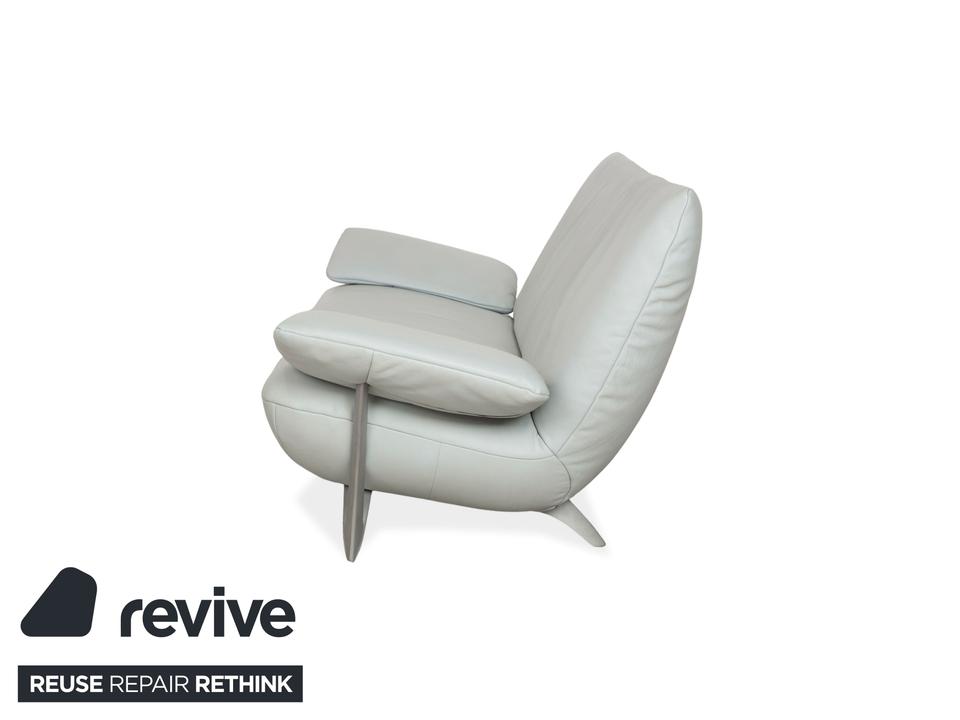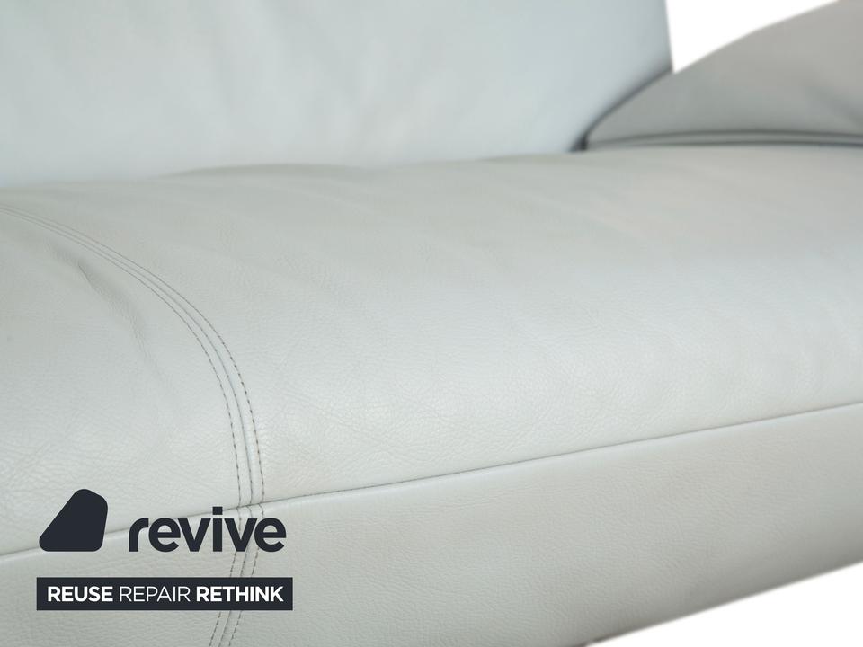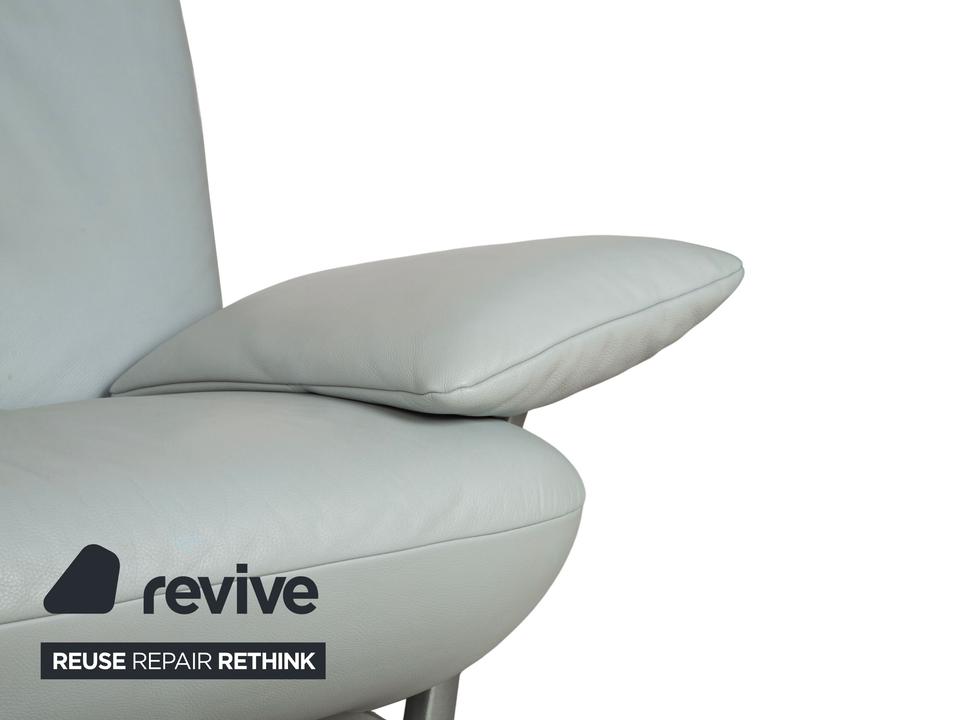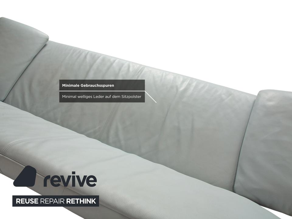 Der 1900 Dreisitzer von Rolf Benz ist mit einem hellblauen Echtleder bezogen. Auffällig ist das geschwungenen Metallgestell der Armlehnen, welches klare Linien mit weich abgerundeten Formen kombiniert. Das moderne Design und die abgerundeten Kanten zeichnen den Dreisitzer aus.