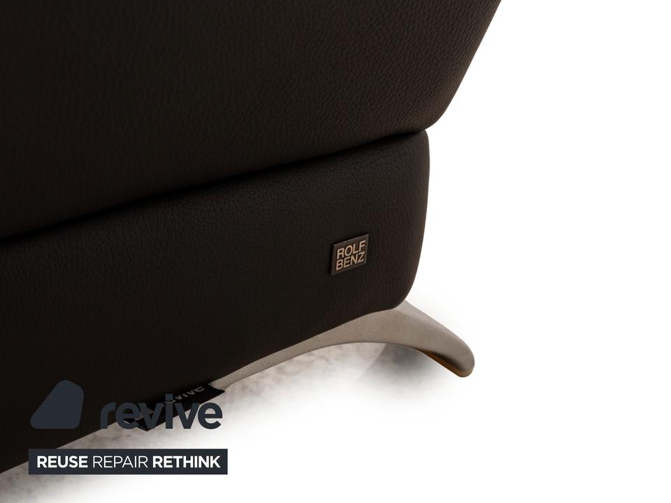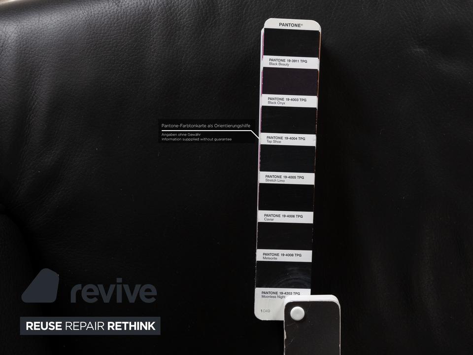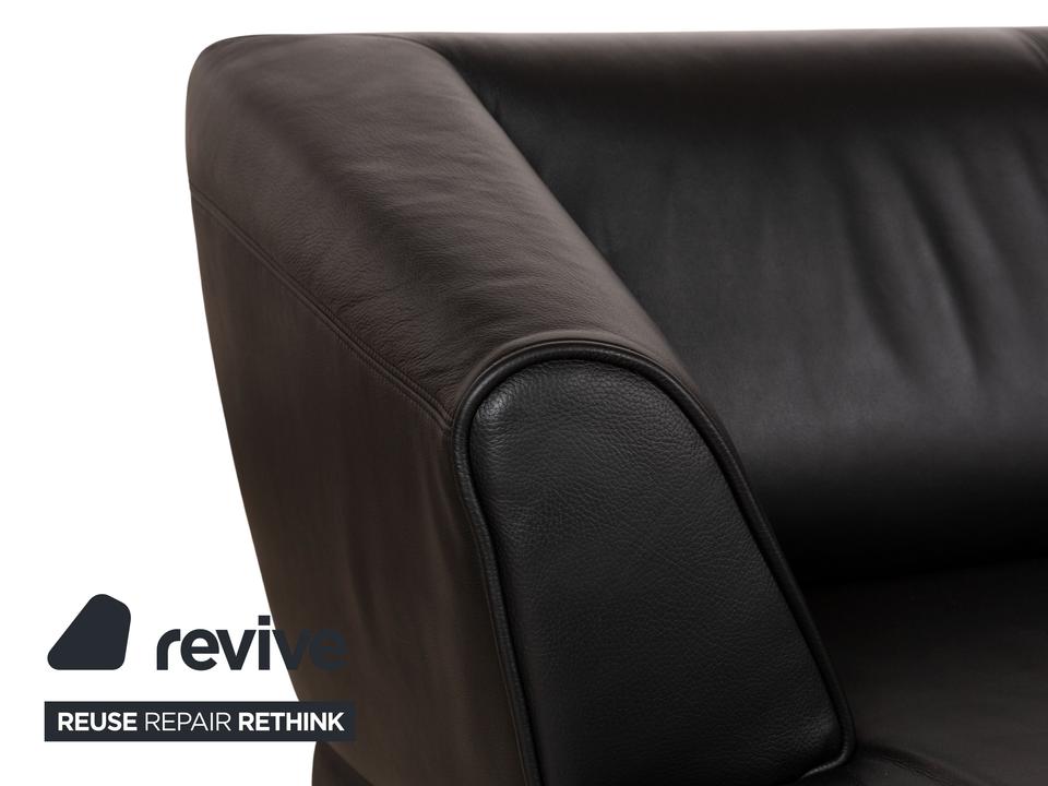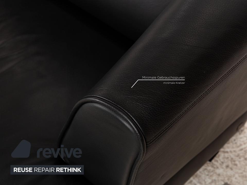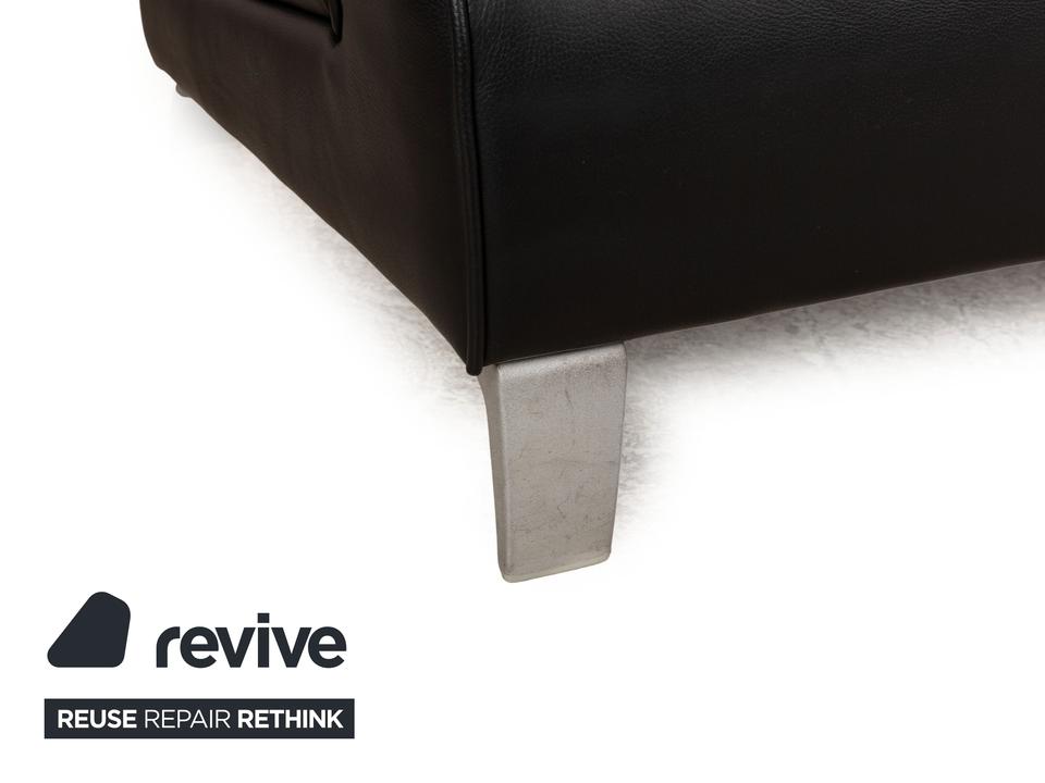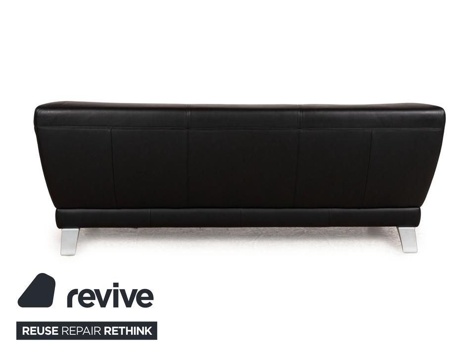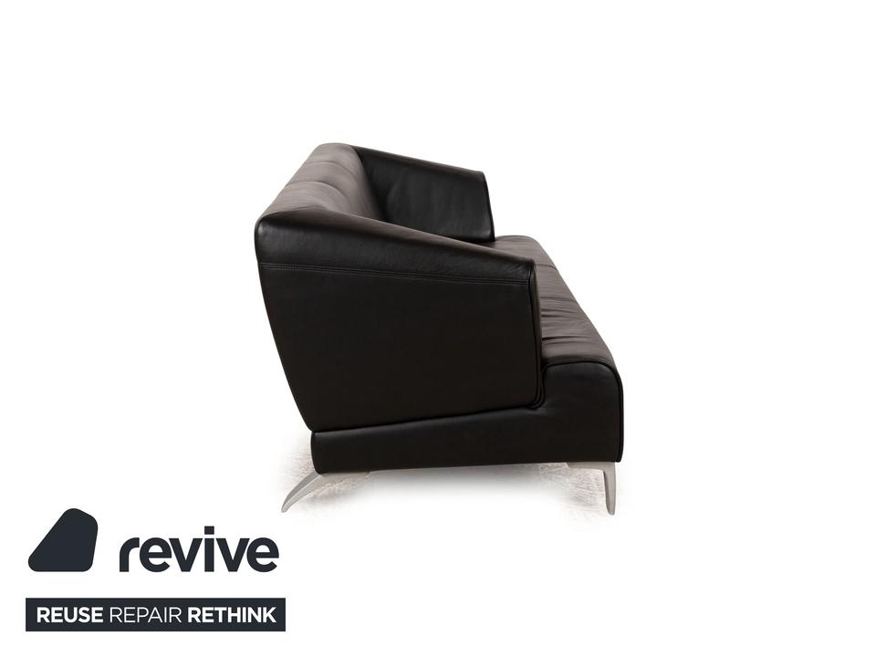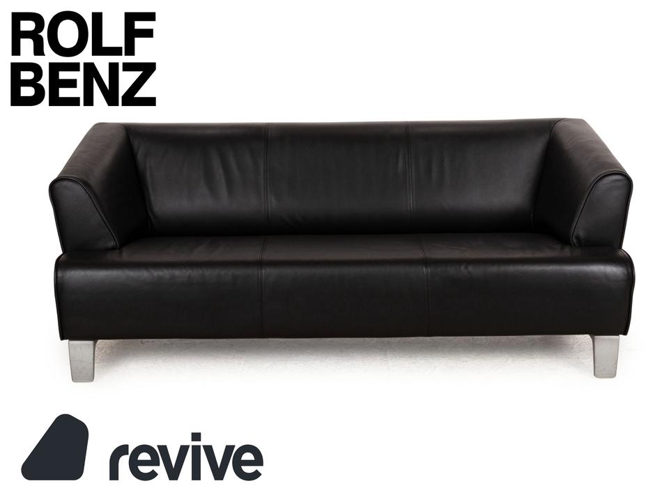 Das 2300 Sofa von Rolf Benz ist mit einem schwarzen Echtleder bezogen und steht auf Metallfüßen. Das zeitlose Design und die abgerundeten Kanten zeichnen den Dreisitzer aus.