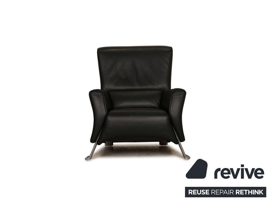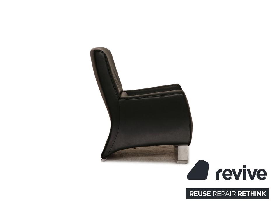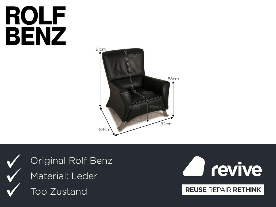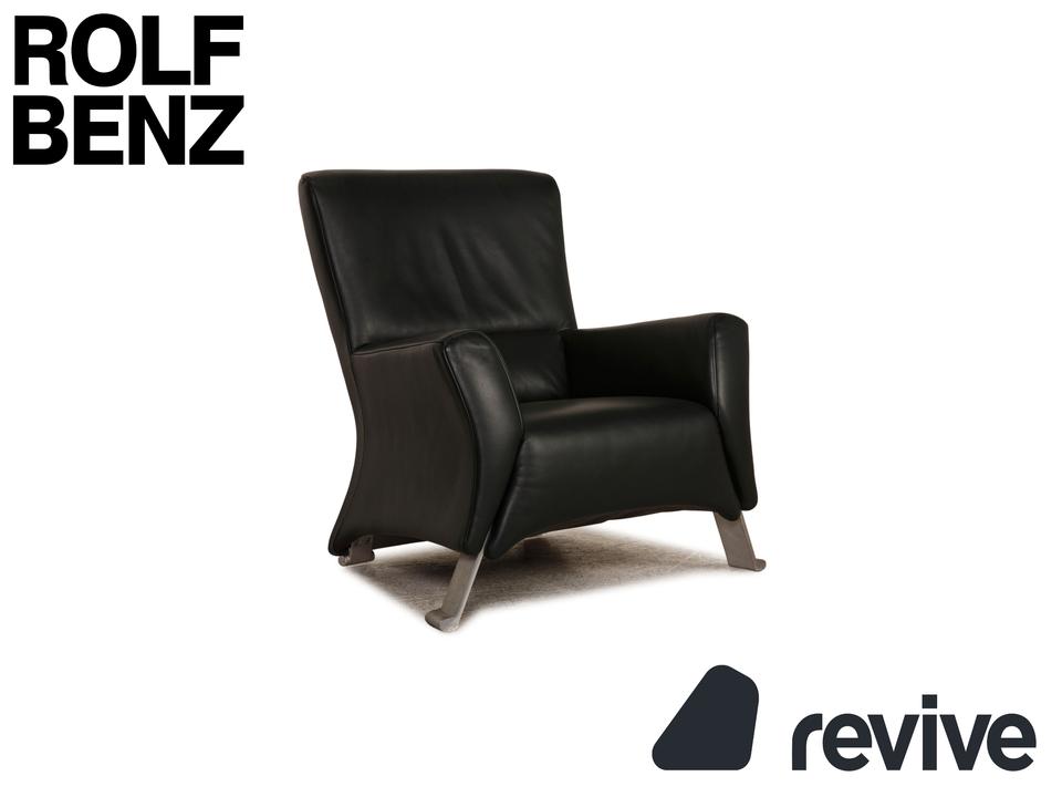 Der 322 Sessel von Rolf Benz ist mit einem schwarzen Echtleder bezogen und steht auf silbernen Metallfüßen. Das klassische, zeitlose Design und die abgerundeten Armlehnen zeichnen ihn aus.