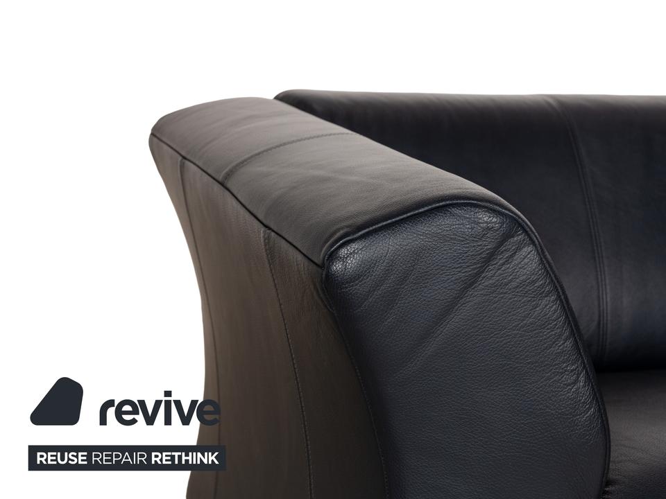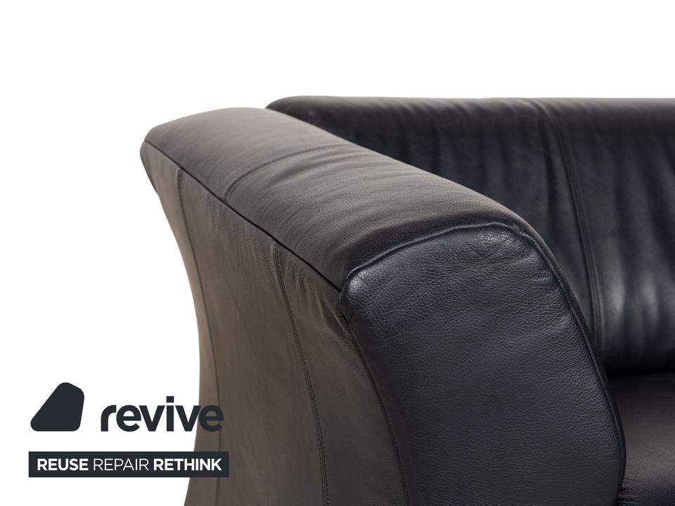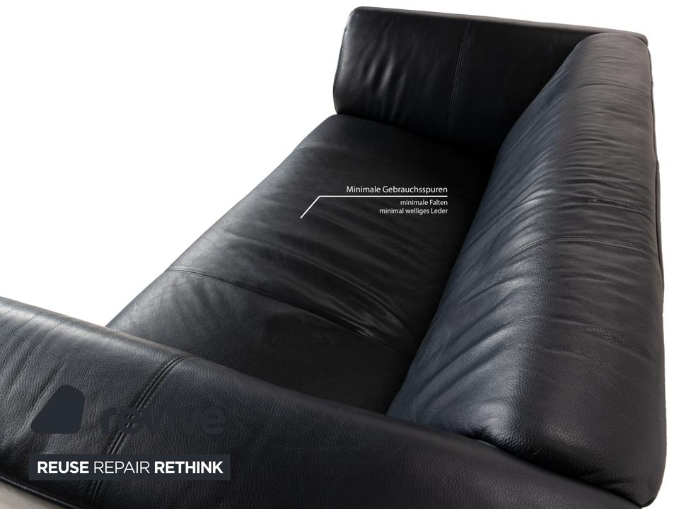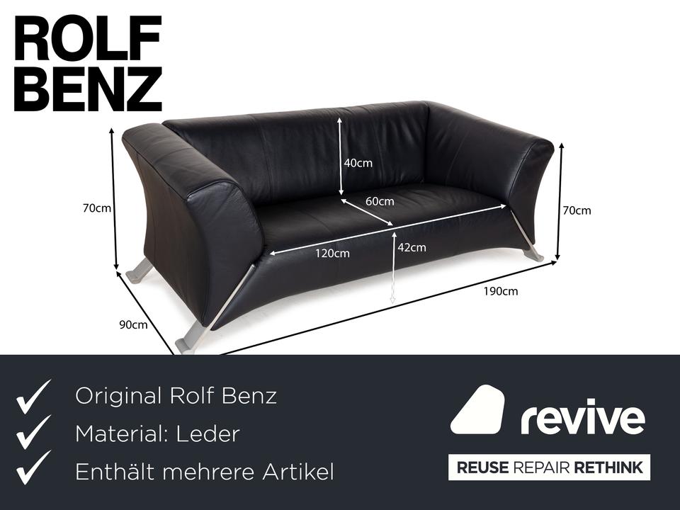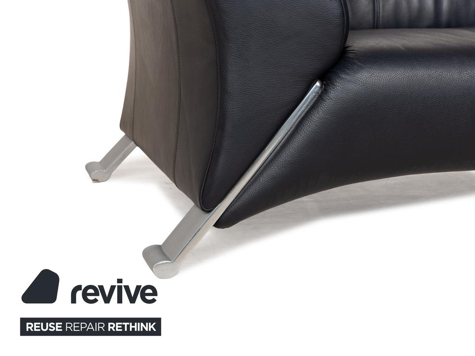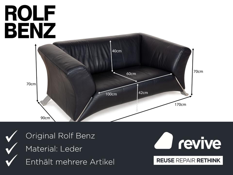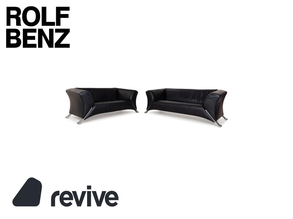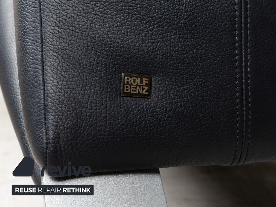 Die Sofa-Garnitur 322 von Rolf Benz ist mit einem schwarzblauen Leder bezogen und steht auf silbernen Metallfüßen. Das moderne Design und die abgerundeten Kanten zeichnen das Set, bestehend aus zwei minimal unterschiedlich breiten Zweisitzern, aus.