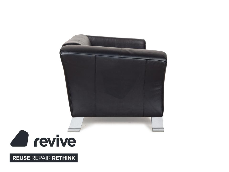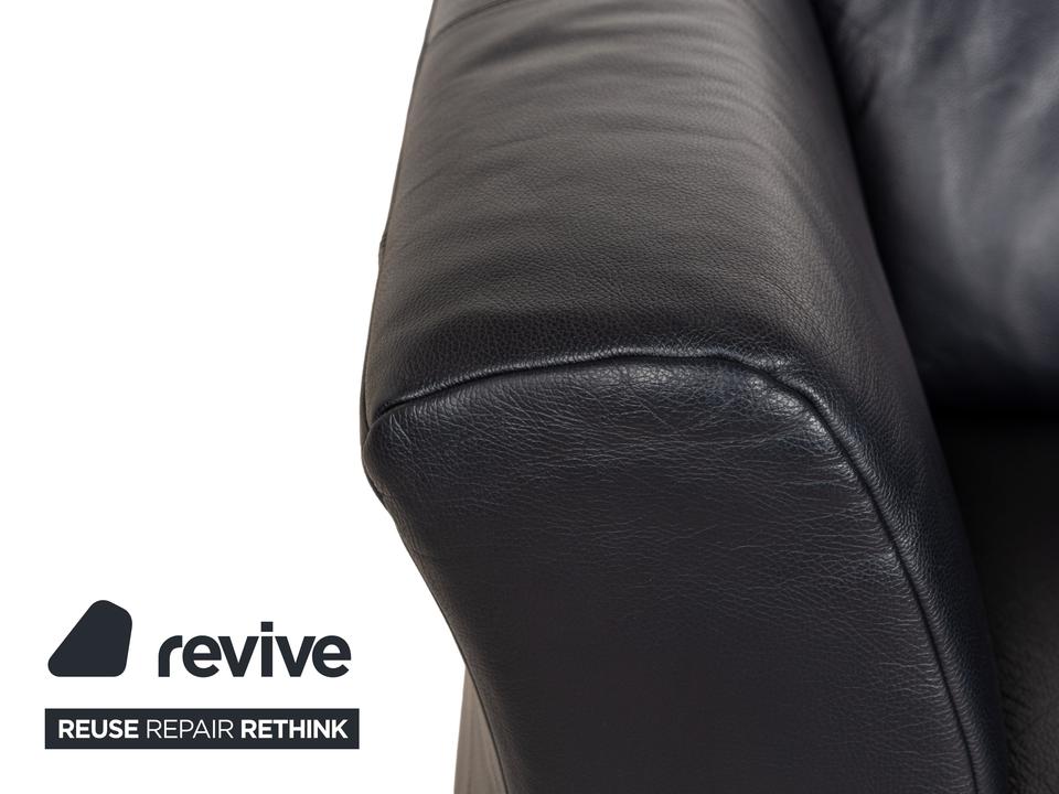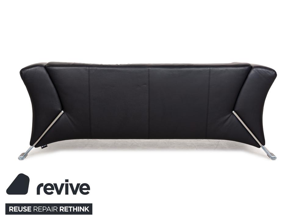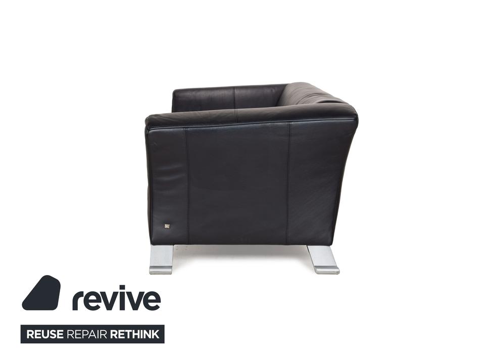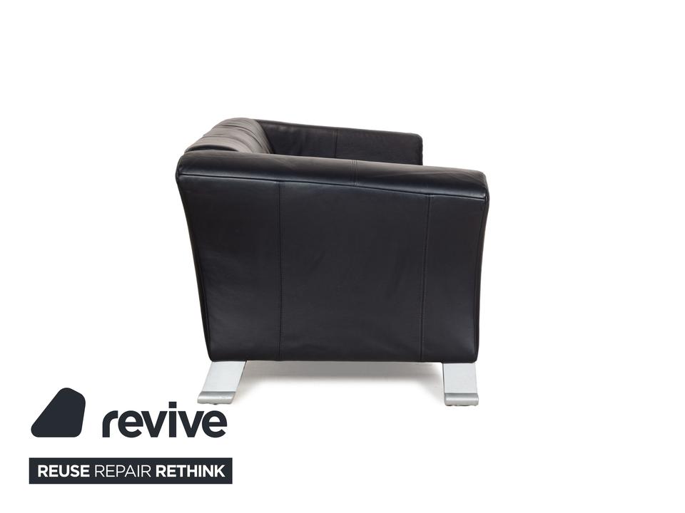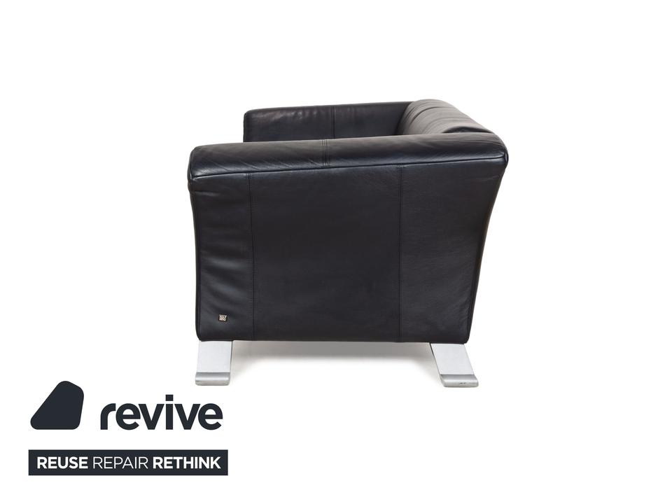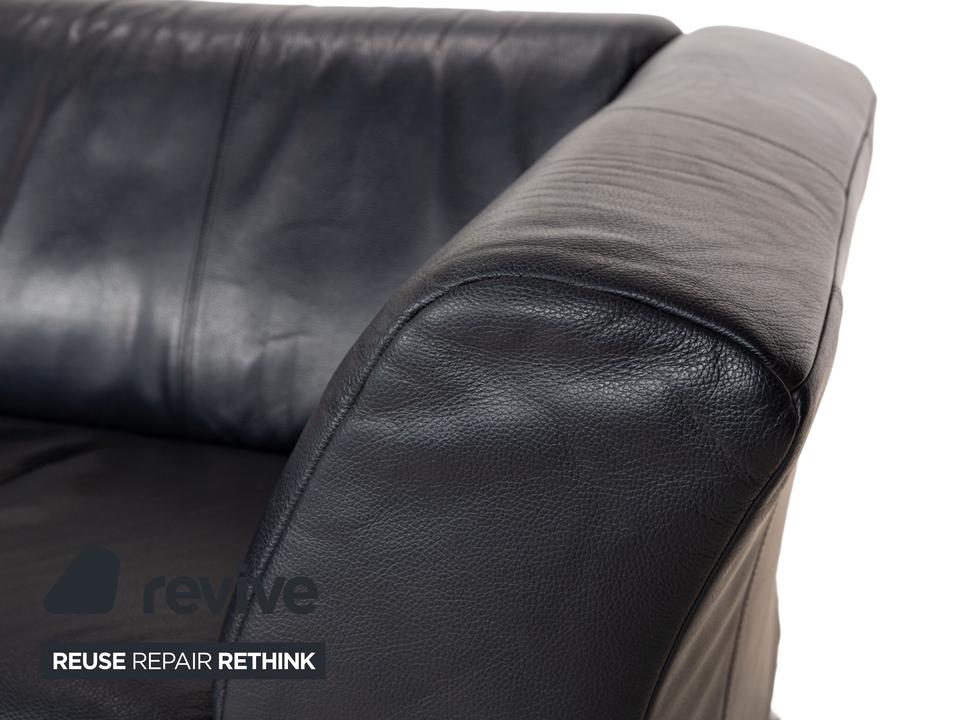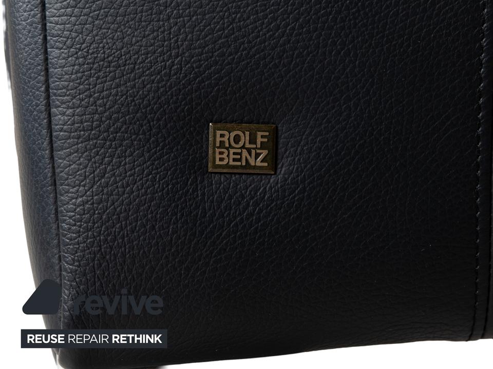 Die Sofa-Garnitur 322 von Rolf Benz ist mit einem schwarzblauen Leder bezogen und steht auf silbernen Metallfüßen. Das moderne Design und die abgerundeten Kanten zeichnen das Set, bestehend aus zwei minimal unterschiedlich breiten Zweisitzern, aus.