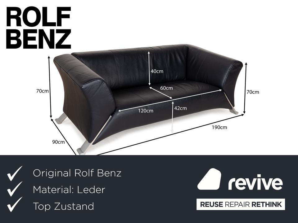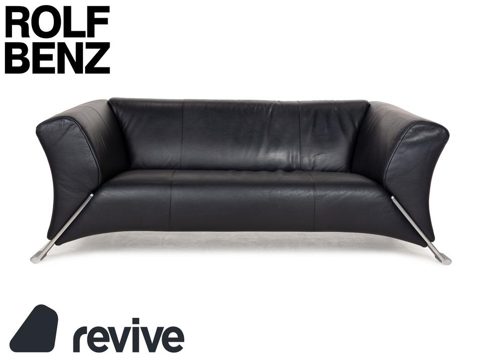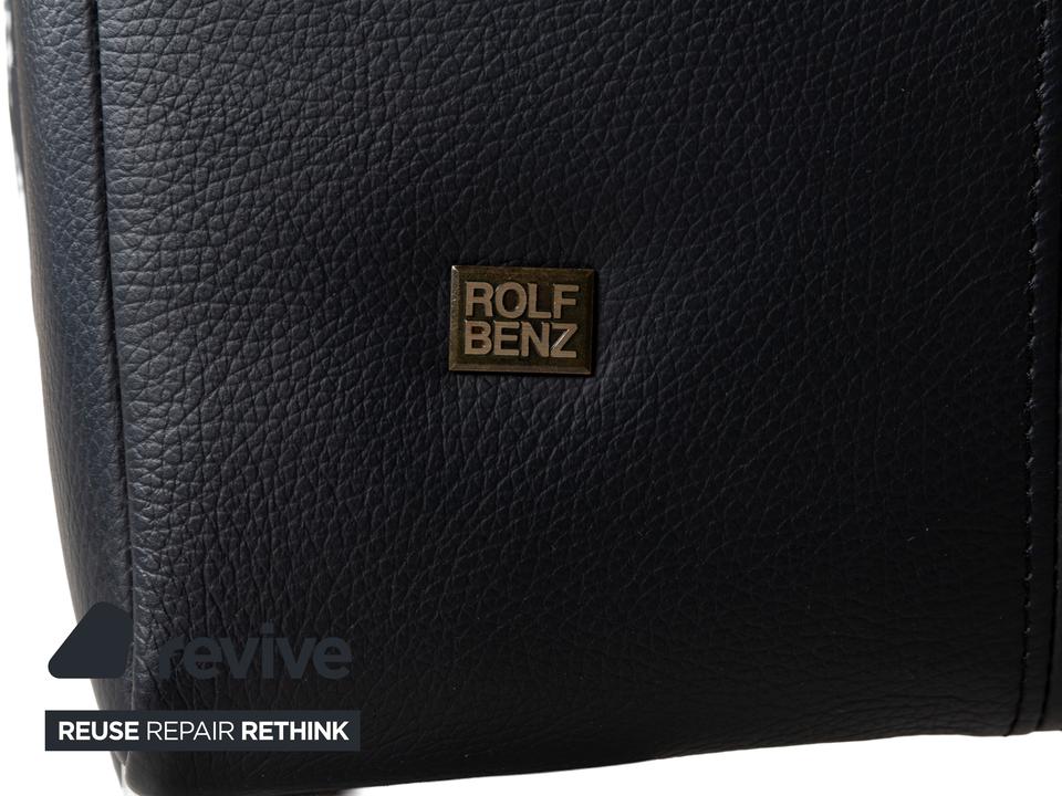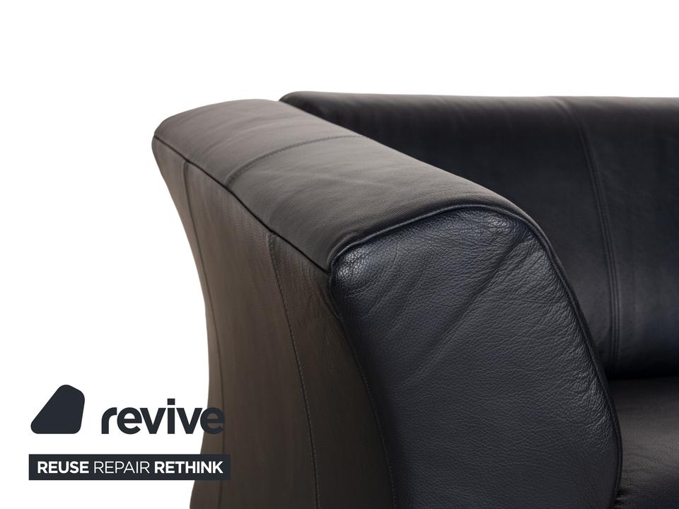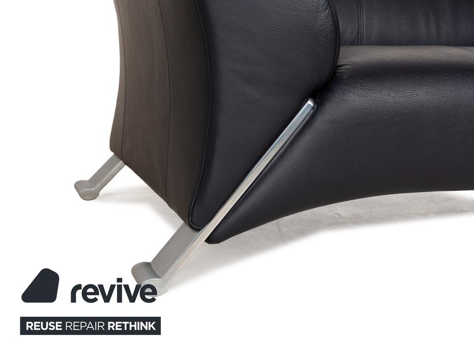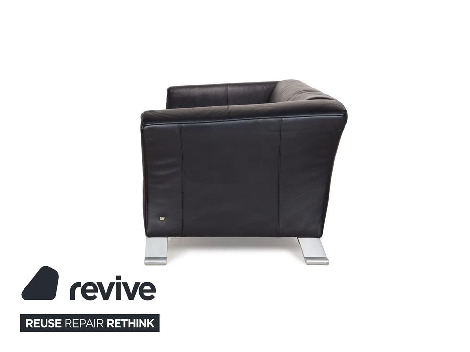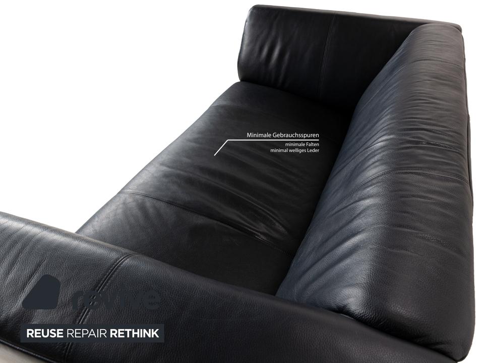 Das Sofa 322 von Rolf Benz ist mit einem schwarzblauen Leder bezogen und steht auf silbernen Metallfüßen. Das moderne Design und die abgerundeten Kanten zeichnen den Zweisitzer aus.