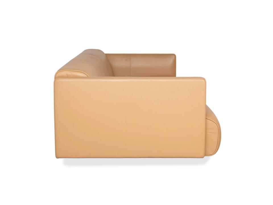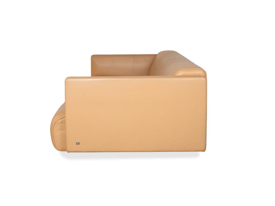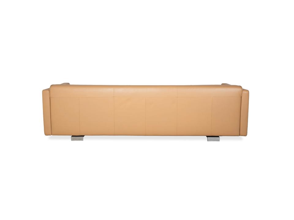 Das Modell 6300 von Rolf Benz ist ein Stück Design, das sofort Ruhe und Großzügigkeit ausstrahlt. Was bei diesem Dreisitzer direkt ins Auge fällt, ist die wunderbar warme Farbe des Leders – eine Mischung aus Beige und hellem Braun (oft als Sand oder Camel bezeichnet), die den Raum sofort wohnlicher macht, ohne dunkel zu wirken.Die Formsprache ist sehr klar und fast architektonisch: Die schmalen, hohen Armlehnen rahmen die Sitzfläche ein, ohne wertvollen Platz zu verschwenden. Apropos Platz: Die Sitzfläche ist hier durchgehend gestaltet, also ohne störende Ritzen zwischen den Polstern, was das Sofa optisch streckt und extrem einladend macht. Das Leder zeigt die typische, hochwertige Rolf-Benz-Verarbeitung mit einer leichten, natürlichen Faltenbildung, die für den legeren Look sorgt. Getragen wird der Korpus von flachen Metallsockeln, die fast unsichtbar sind und das Sofa bodennah und stabil wirken lassen. Ein moderner Klassiker, der Eleganz mit einer sehr entspannten Lounge-Atmosphäre verbindet.