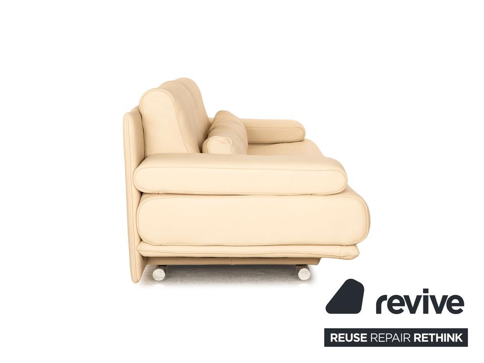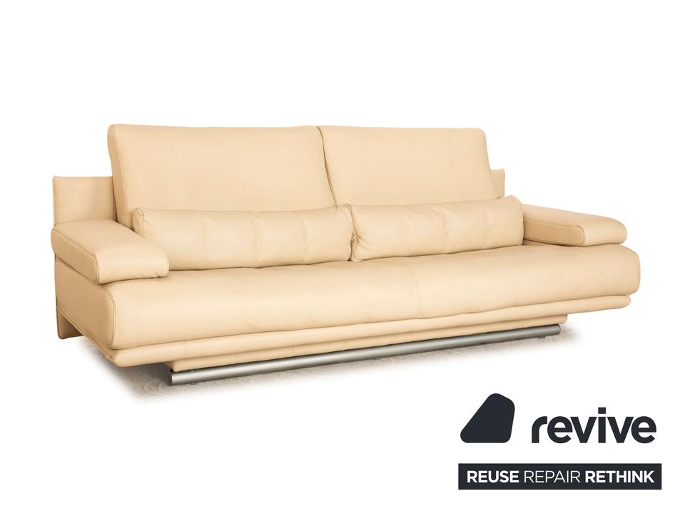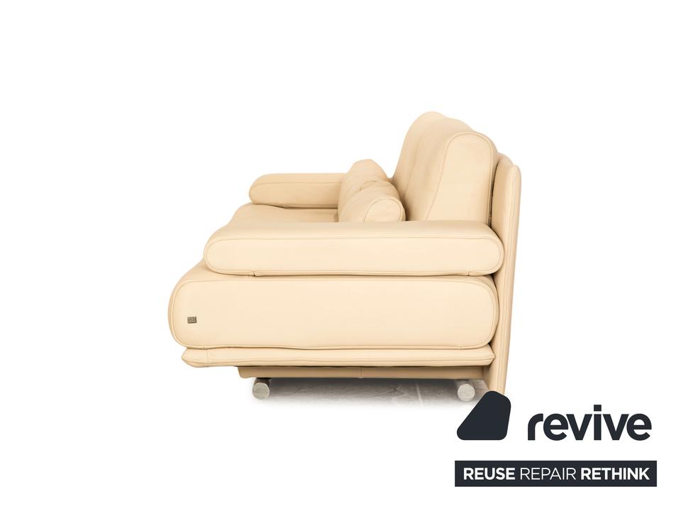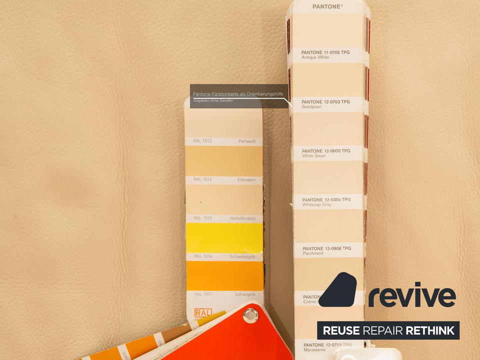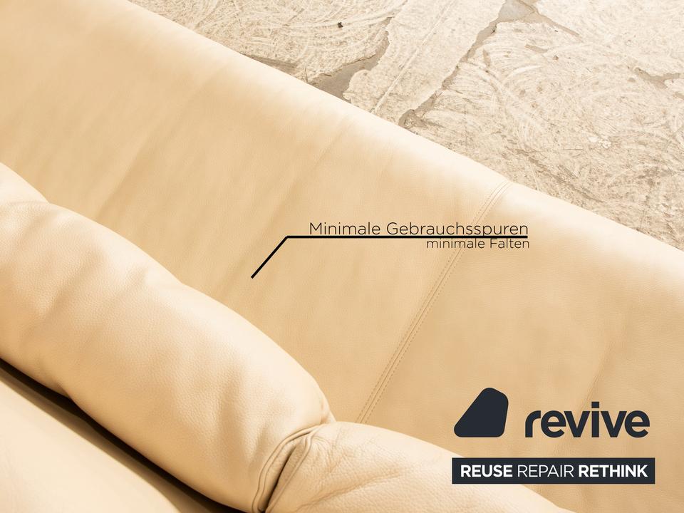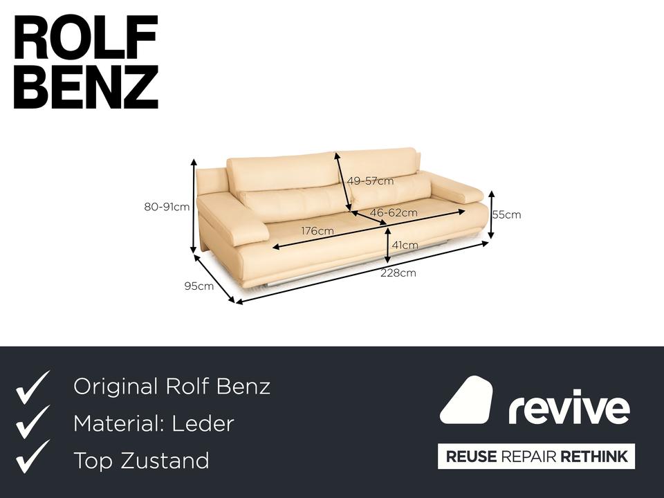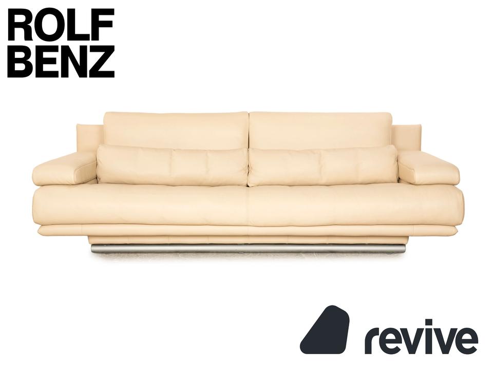 Der 6500 Dreisitzer von Rolf Benz ist mit einem cremefarbenen Echtleder bezogen. Der Klassiker zeichnet sich durch ein einzigartiges Design mit zeitlosem Charakter aus. Die ausgewogene, bequeme Polsterung sowie Stützkissen sorgen für Komfort. Die Rückenlehnen sind verstellbar.