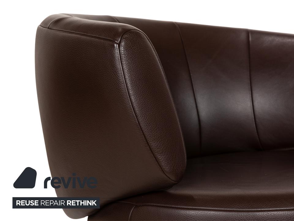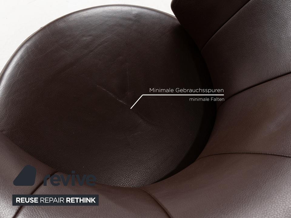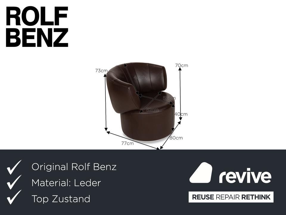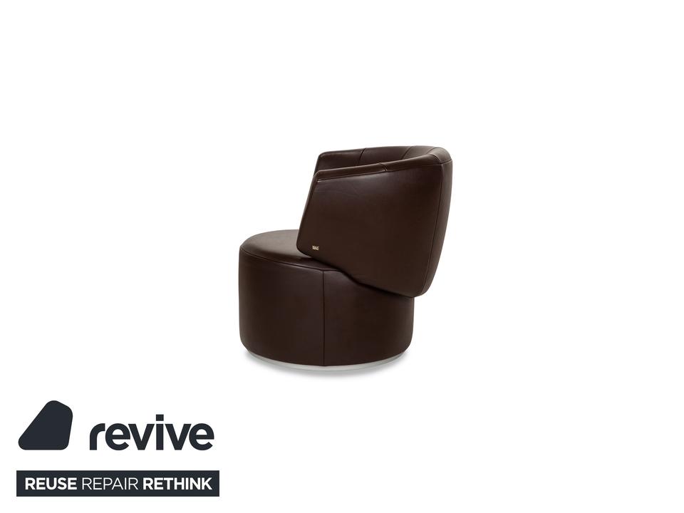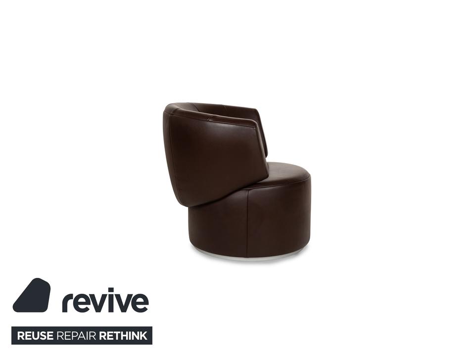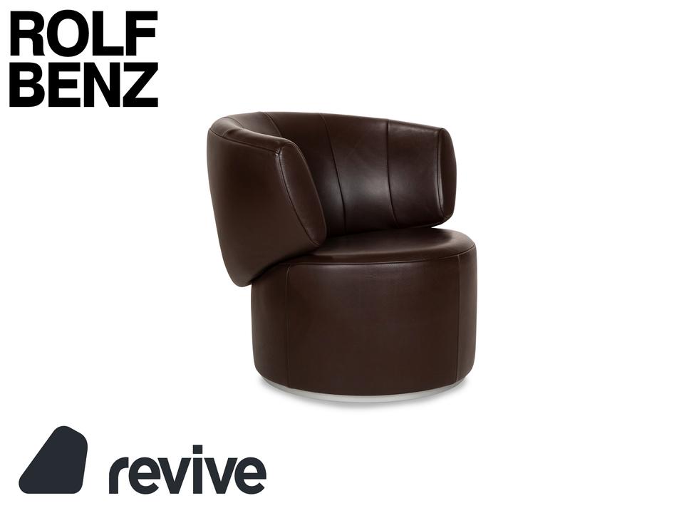 Der Sessel 684 von Rolf Benz ist mit einem braunen Echtleder bezogen und steht auf einem silbernen Metallsockel. Er zeichnet sich durch die stilvolle Optik und das minimalistische Design aus.