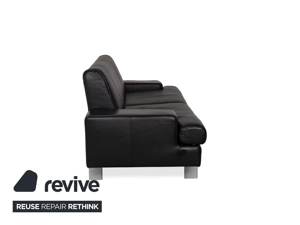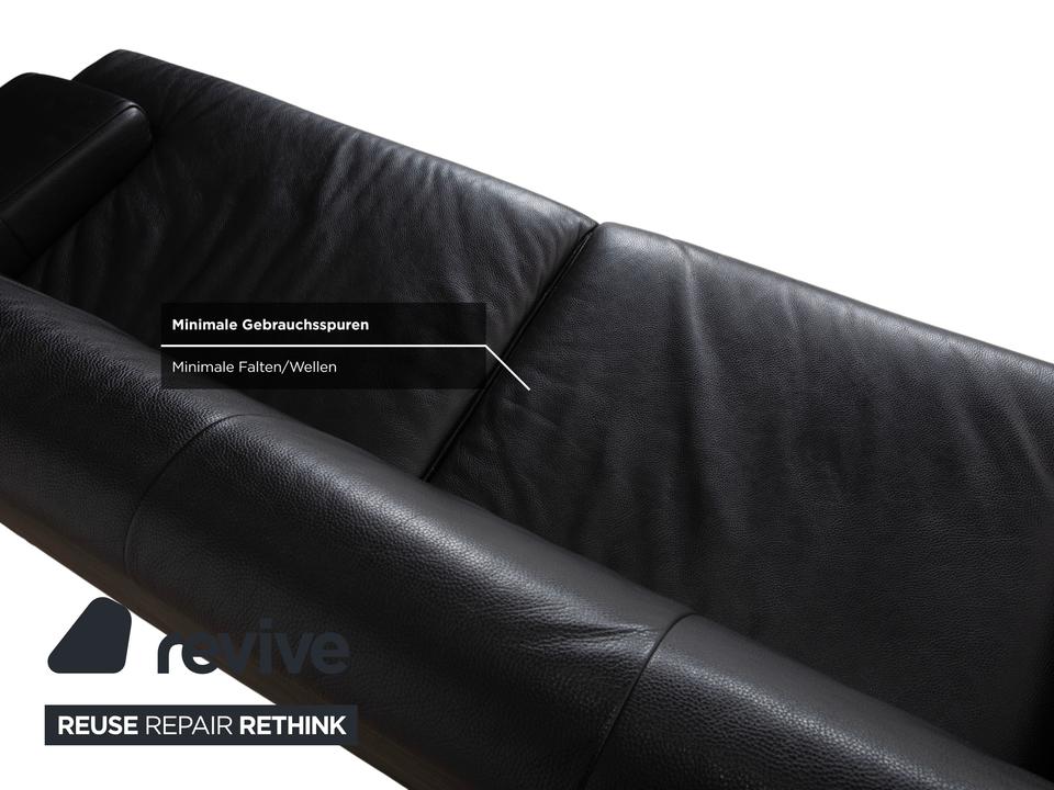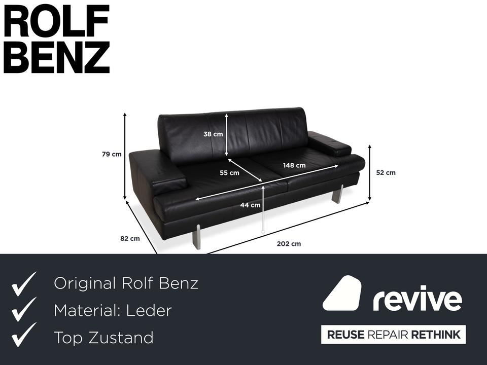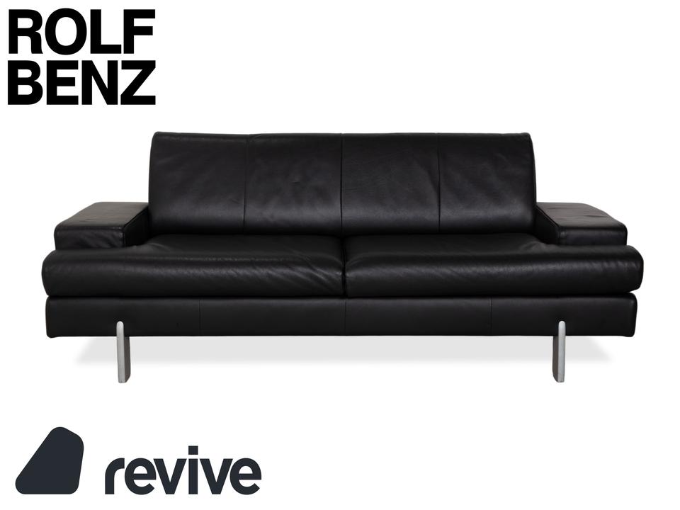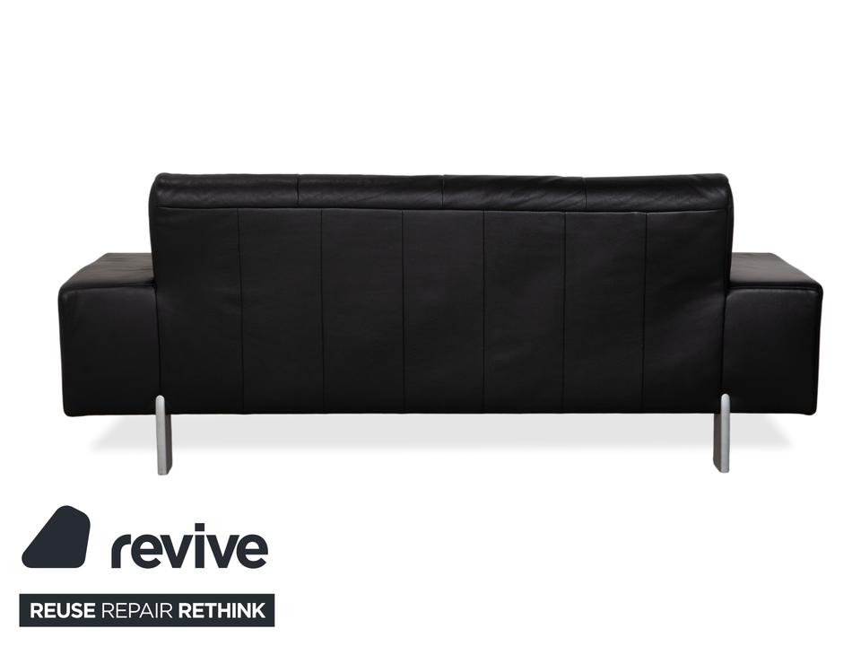 Rolf Benz AK 644: Ein Klassiker der ModerneDieses Sofa ist ein Musterbeispiel für das Design der 80er und 90er Jahre, das heute wieder absolut zeitgemäß wirkt. Das Modell AK 644 besticht durch seine massive, bodenständige Architektur, die Solidität und Langlebigkeit ausstrahlt.Der Dreisitzer ist in hochwertiges, schwarzes Glattleder gehüllt. Das Leder wirkt robust und dick, zeigt aber eine feine Narbung, die für Qualität spricht. Das Design ist markant und unverwechselbar:Die Armlehnen: Das charakteristischste Merkmal sind die breiten, kubischen Armlehnen. Auf der Oberseite liegt ein flaches Polsterkissen auf, das wie eine separate Auflage wirkt und die strenge Form weicher macht.Die Linie: Der Korpus ist streng geometrisch aufgebaut. Die Sitzfläche ist in zwei breite Segmente unterteilt, ebenso die Rückenlehne. Ein interessantes Detail ist die horizontale Teilung an der Frontblende unterhalb der Sitzkissen, die die Breite des Sofas betont.Getragen wird der massive Körper von schlichten, silbernen Metallfüßen. Diese sind an den Ecken positioniert und sorgen dafür, dass das wuchtige Polstermöbel nicht zu schwer wirkt, sondern einen festen, aber eleganten Stand hat.