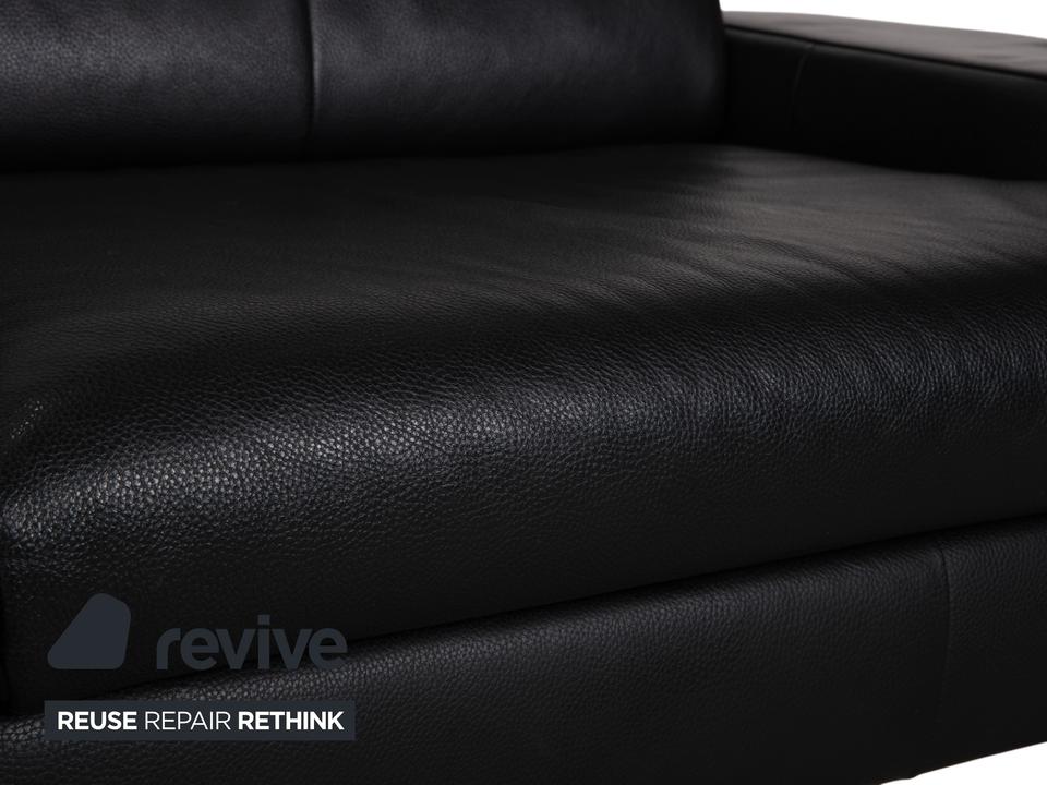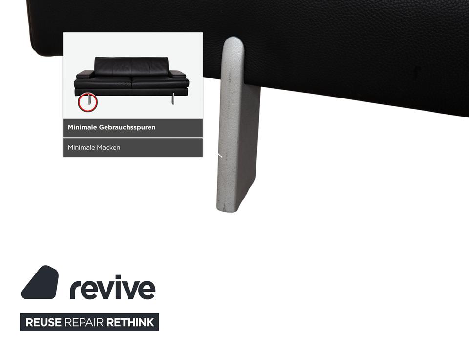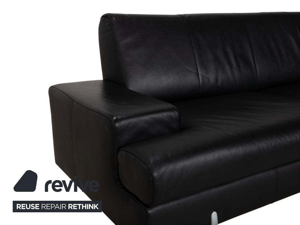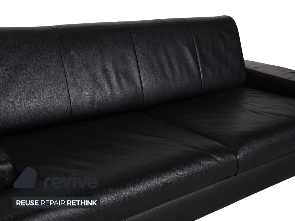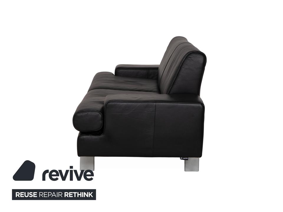 Rolf Benz AK 644: Ein Klassiker der ModerneDieses Sofa ist ein Musterbeispiel für das Design der 80er und 90er Jahre, das heute wieder absolut zeitgemäß wirkt. Das Modell AK 644 besticht durch seine massive, bodenständige Architektur, die Solidität und Langlebigkeit ausstrahlt.Der Dreisitzer ist in hochwertiges, schwarzes Glattleder gehüllt. Das Leder wirkt robust und dick, zeigt aber eine feine Narbung, die für Qualität spricht. Das Design ist markant und unverwechselbar:Die Armlehnen: Das charakteristischste Merkmal sind die breiten, kubischen Armlehnen. Auf der Oberseite liegt ein flaches Polsterkissen auf, das wie eine separate Auflage wirkt und die strenge Form weicher macht.Die Linie: Der Korpus ist streng geometrisch aufgebaut. Die Sitzfläche ist in zwei breite Segmente unterteilt, ebenso die Rückenlehne. Ein interessantes Detail ist die horizontale Teilung an der Frontblende unterhalb der Sitzkissen, die die Breite des Sofas betont.Getragen wird der massive Körper von schlichten, silbernen Metallfüßen. Diese sind an den Ecken positioniert und sorgen dafür, dass das wuchtige Polstermöbel nicht zu schwer wirkt, sondern einen festen, aber eleganten Stand hat.