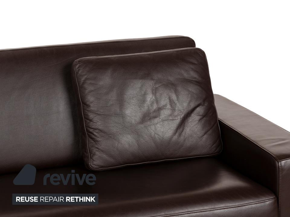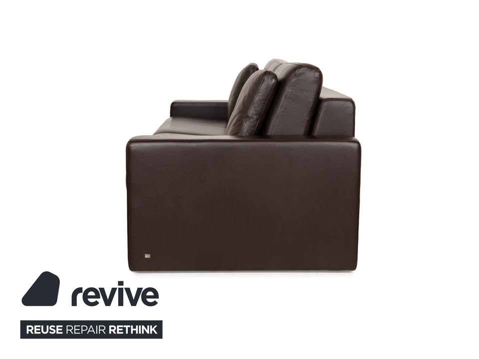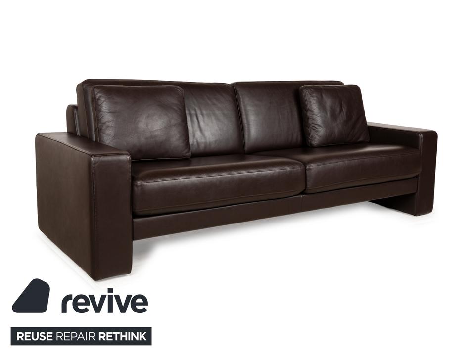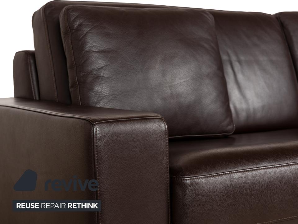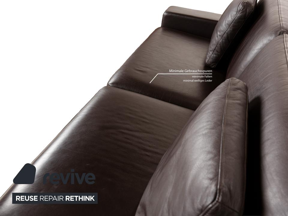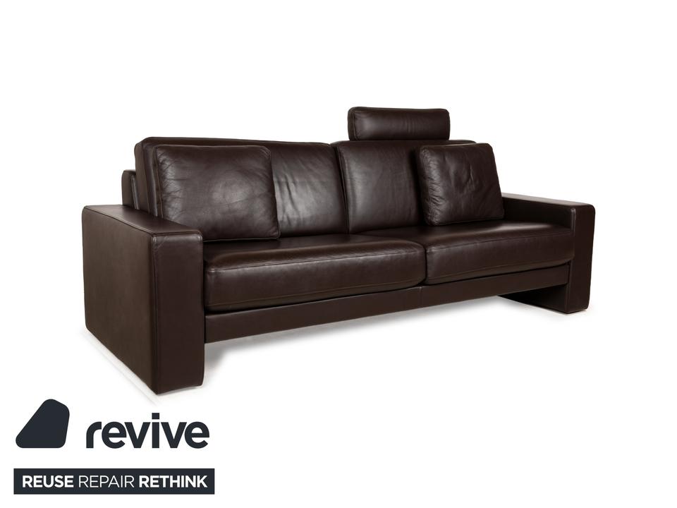 Das Sofa EGO von Rolf Benz ist mit dunkelbraunem Leder bezogen und steht auf bodentiefen Seitenteilen. Es zeichnet sich durch sein klassisches, unaufdringliches Design aus, wodurch es einfach mit weiteren Einrichtungsgegenständen kombinierbar ist. Breite Armlehnen, eine großzügige Polsterung und versetzbare Kopfstützten-Elemente sorgen für hohen Komfort.