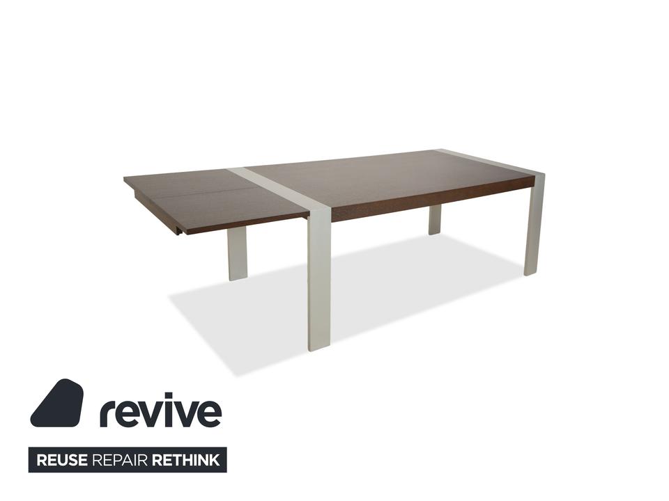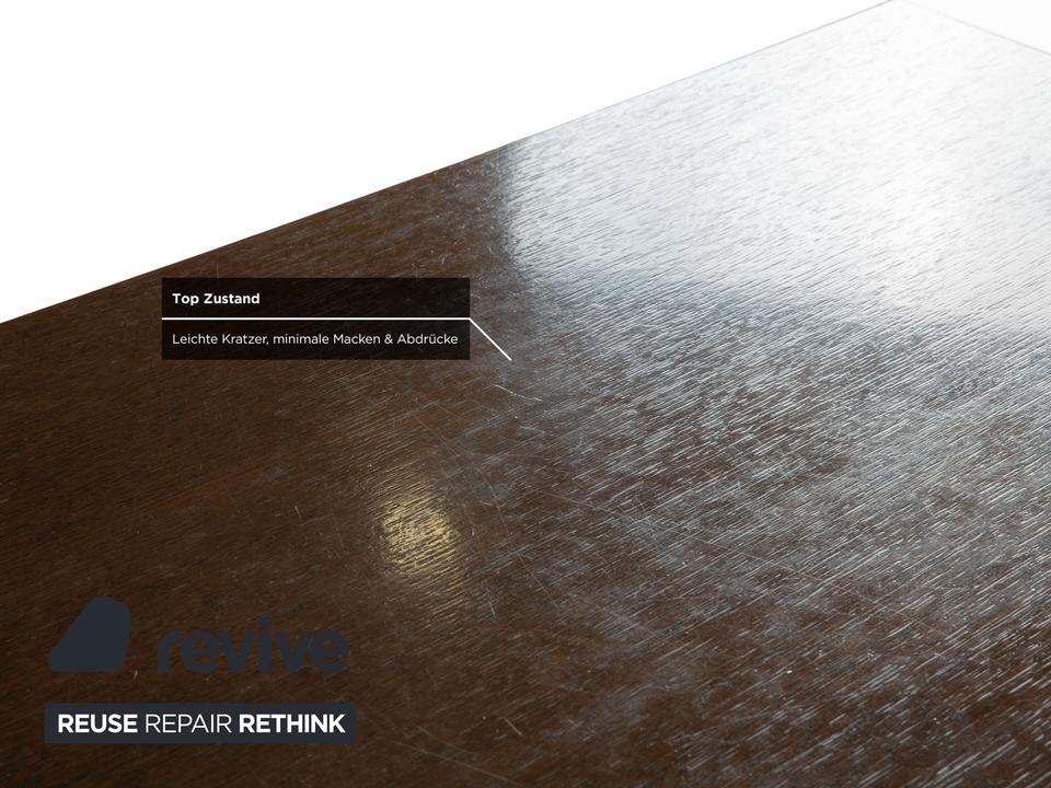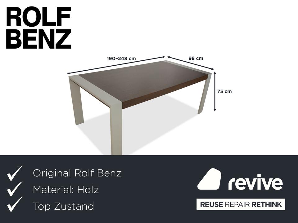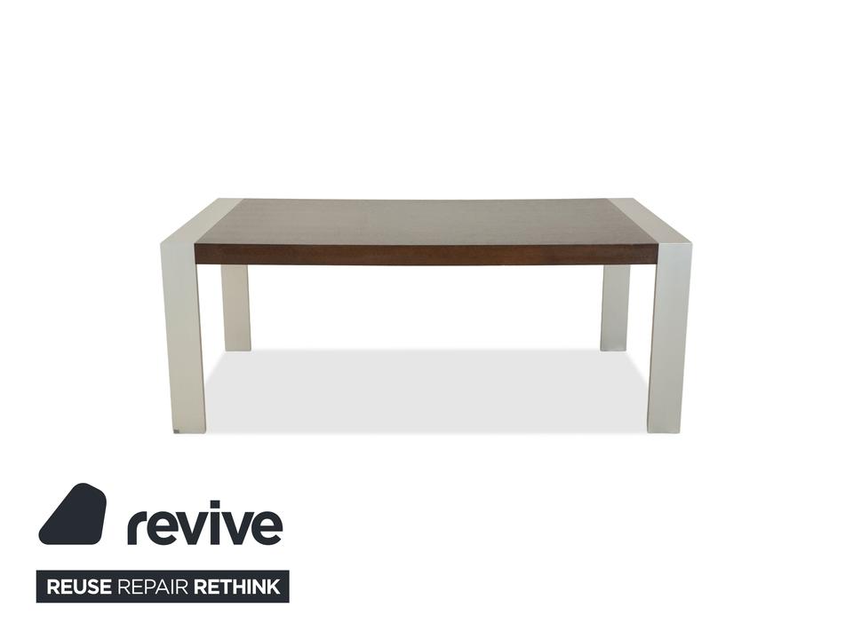 Dieser Esstisch von Rolf Benz besteht aus einer dunkelbraunen Holz-Tischplatte und silbernen Metallfüßen. Die Kombination des dunklen Holzes und der silbernen Füße trotzt von Eleganz und sorgt für ein modernes und schlichtes Erscheinungsbild. Der Tisch ist mit einem einseitigem Auszugelement ausgestattet. Dadurch lässt sich die Tischlänge von 190 cm auf bis zu 248 cm erweitern.