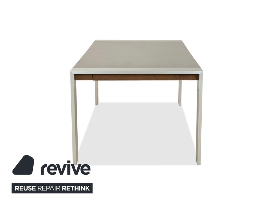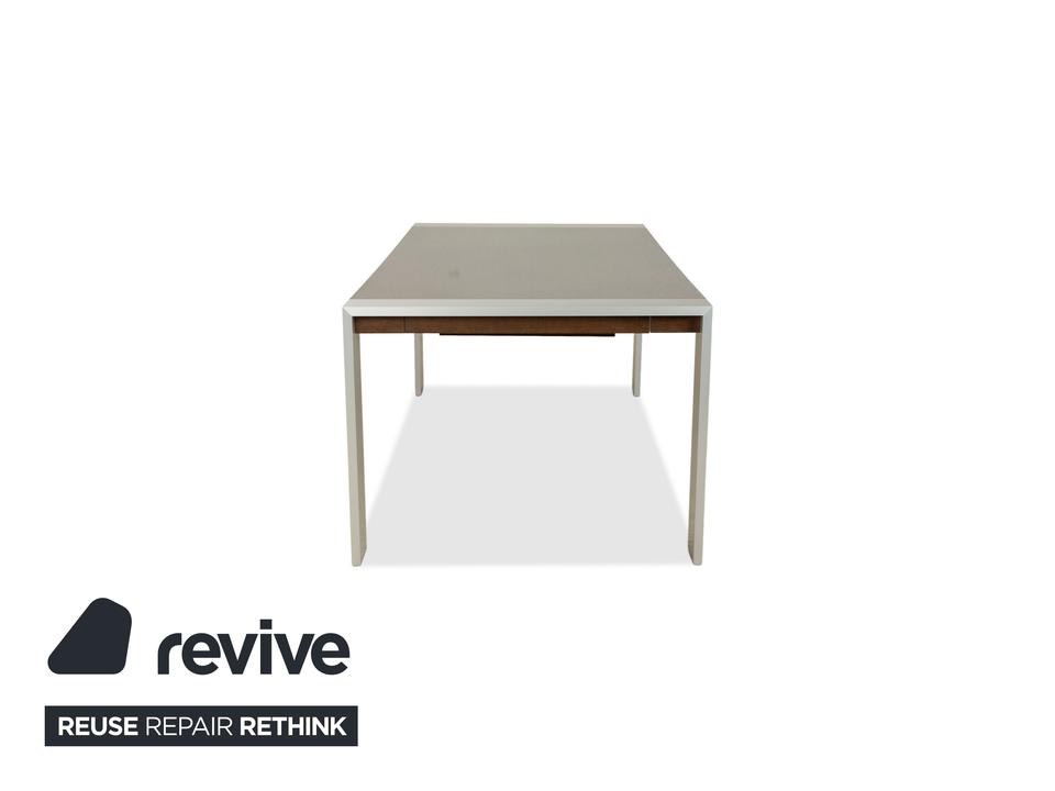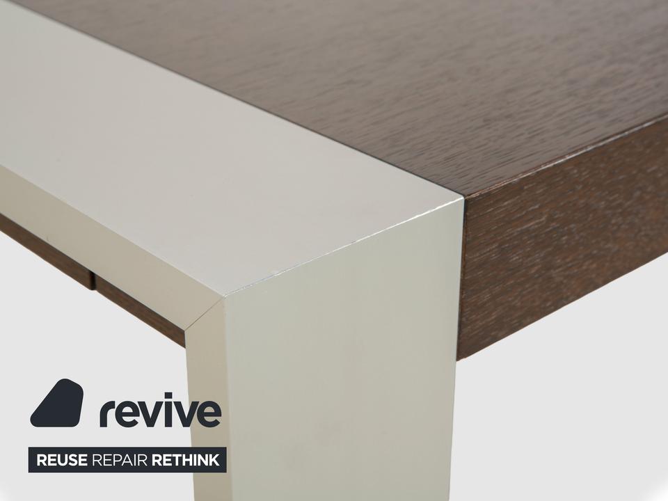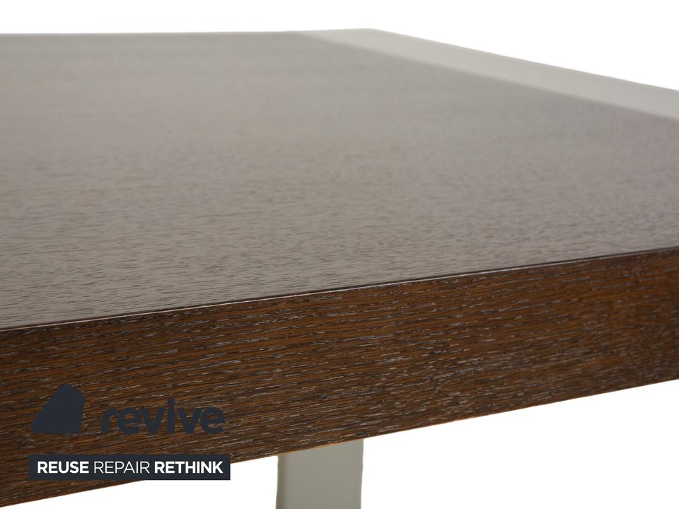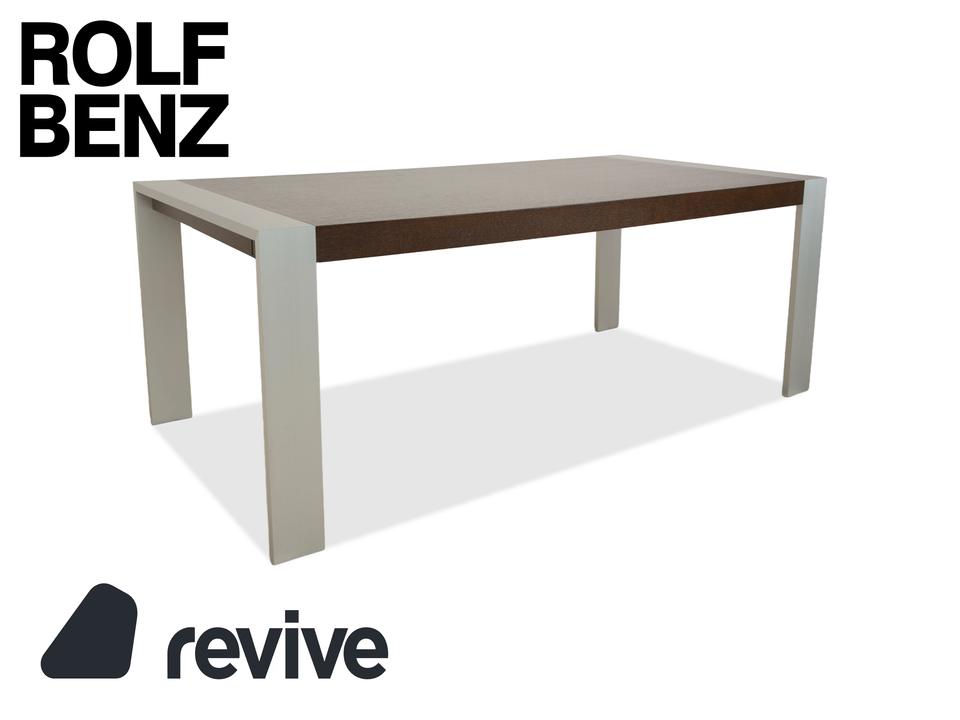 Dieser Esstisch von Rolf Benz besteht aus einer dunkelbraunen Holz-Tischplatte und silbernen Metallfüßen. Die Kombination des dunklen Holzes und der silbernen Füße trotzt von Eleganz und sorgt für ein modernes und schlichtes Erscheinungsbild. Der Tisch ist mit einem einseitigem Auszugelement ausgestattet. Dadurch lässt sich die Tischlänge von 190 cm auf bis zu 248 cm erweitern.