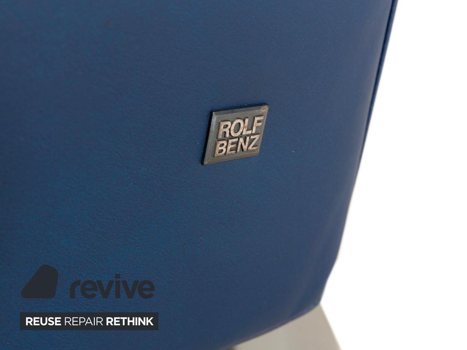 Der Sessel von Rolf Benz ist mit einem dunkelblauen Echtleder bezogen und steht auf einem silbernen runden Fuß. Er zeichnet sich durch das klassische Design und die schlichte, zeitlose Optik aus.