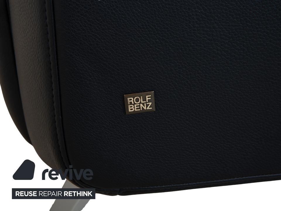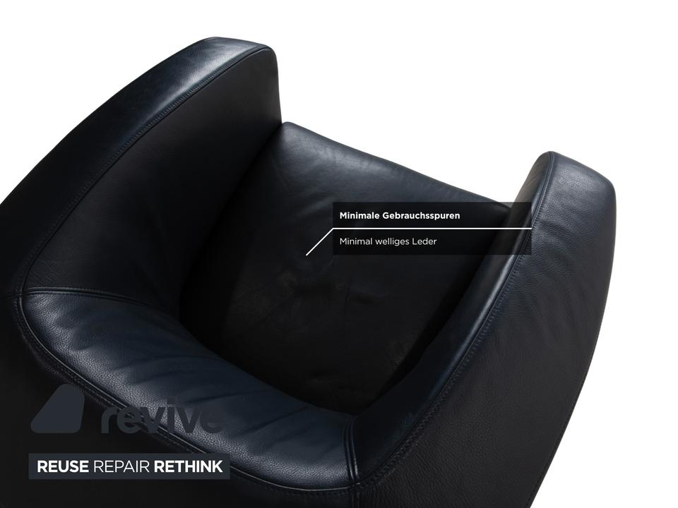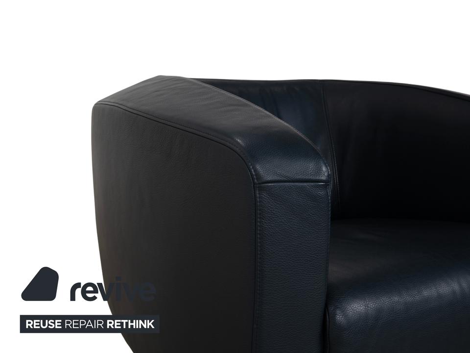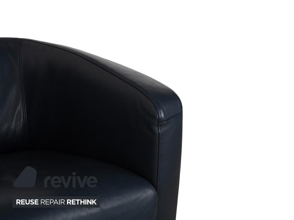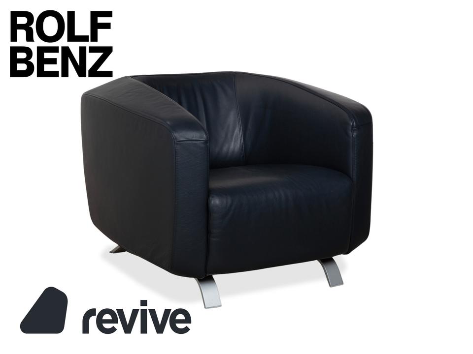 Dieser Sessel von Rolf Benz beweist, dass ein klassisches Möbelstück nicht immer schwarz sein muss, um elegant zu wirken. Das tiefe, satte Dunkelblau des Leders ist eine tolle Alternative: Es wirkt genauso seriös, bringt aber eine subtile, weichere Note in den Raum. Die Form erinnert an einen modernen Cocktailsessel – kompakt, kubisch, aber mit einer Rückenlehne, die in einem Schwung in die Armlehnen übergeht und dich beim Sitzen förmlich „umarmt“.Ein schönes Detail ist der leichte Faltenwurf im inneren Rückenbereich, der die strenge Außenform etwas aufbricht und dem Sessel einen gemütlichen Charakter verleiht. Getragen wird der massive Korpus von geschwungenen, silbernen Metallfüßen, die für Bodenfreiheit sorgen und das Design leichtfüßiger machen. Ein perfekter Solitär, der in einer Lounge-Ecke genauso gut funktioniert wie als stilvoller Ruhepol im Büro oder Schlafzimmer.