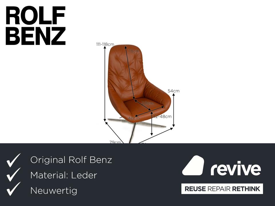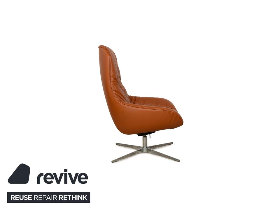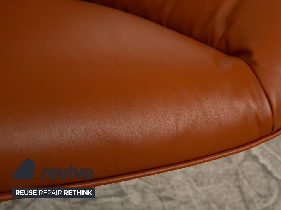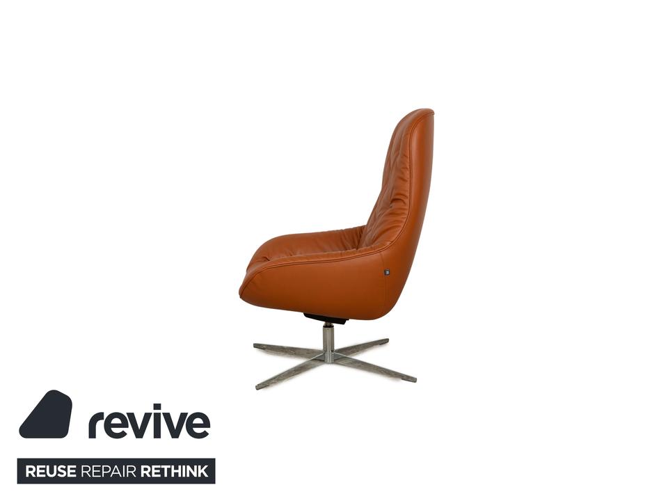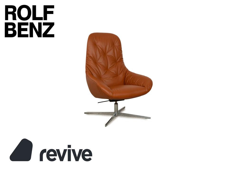 Der MEG Sessel von Rolf Benz ist mit einem braunen Echtleder bezogen und steht auf Metallfüßen.