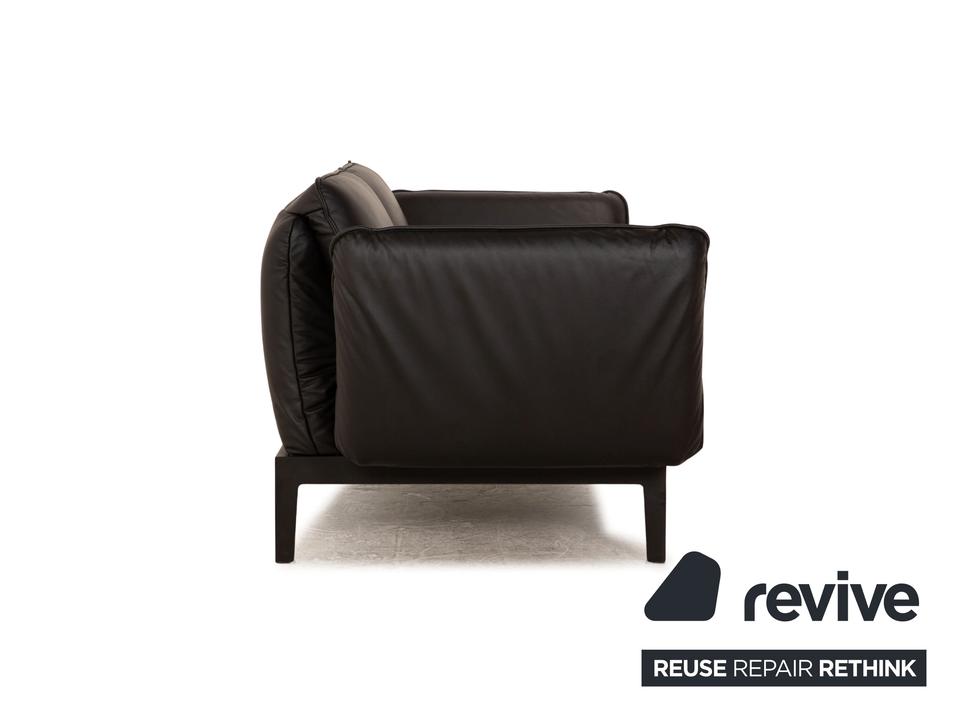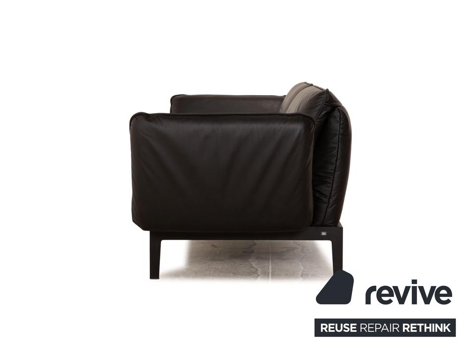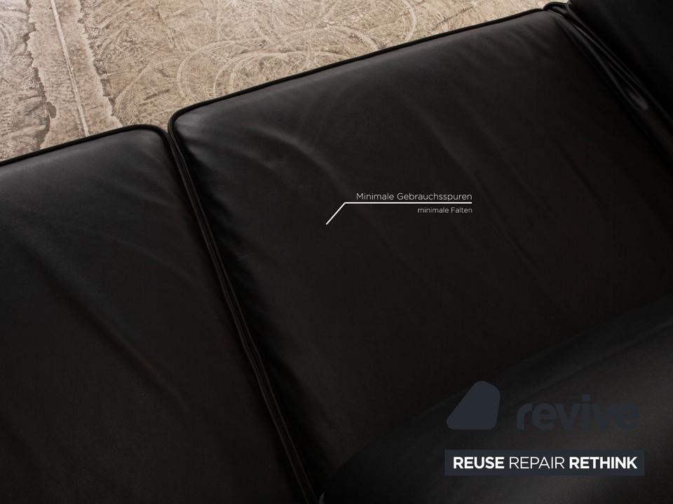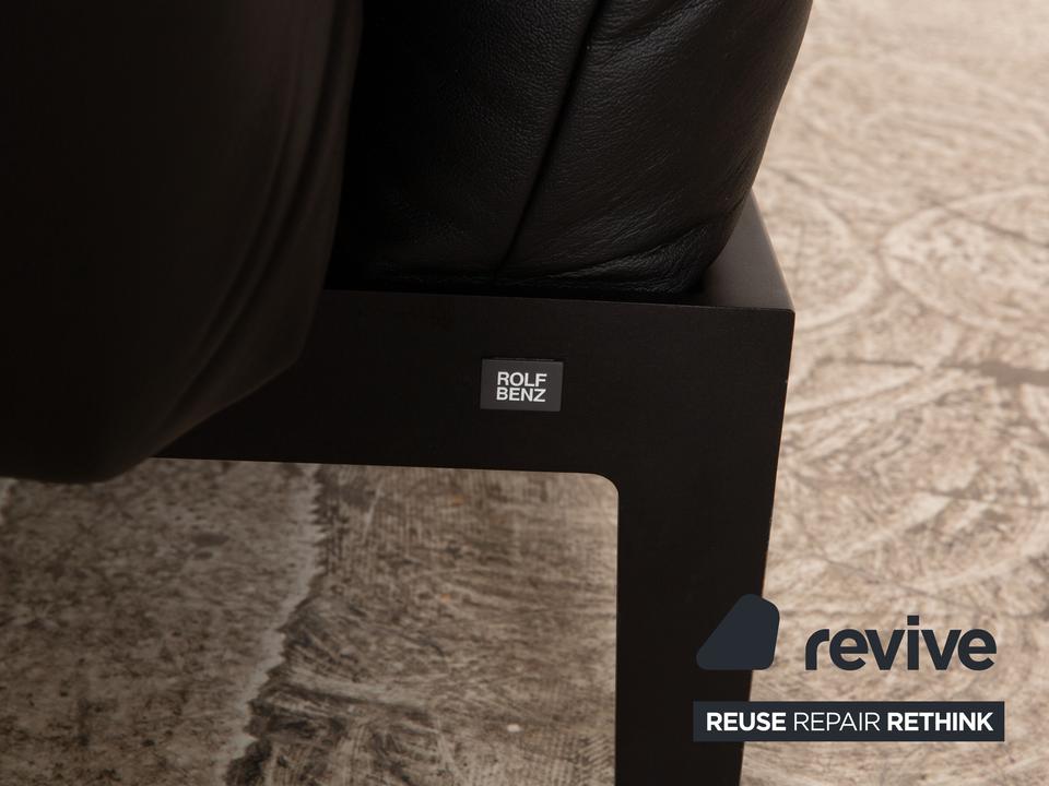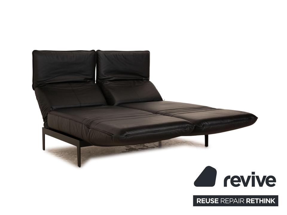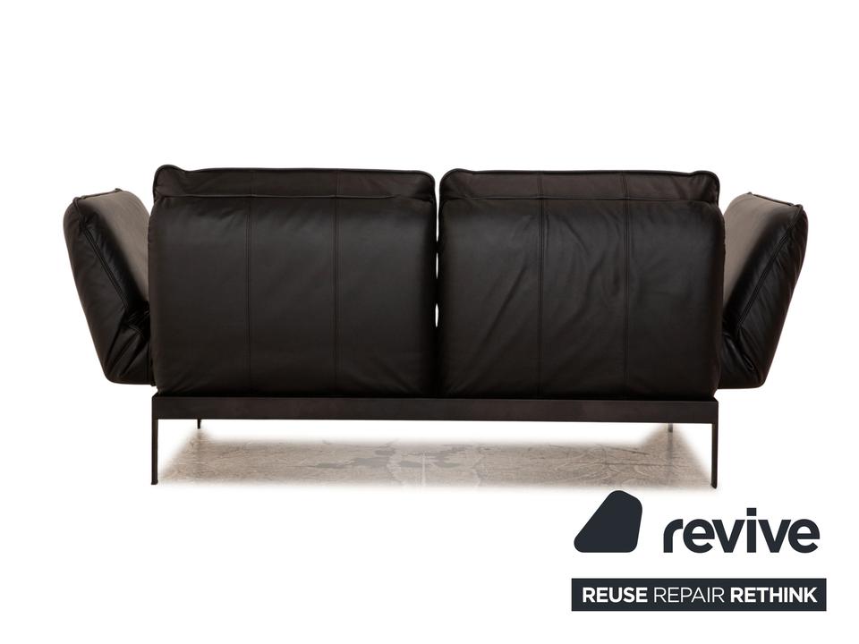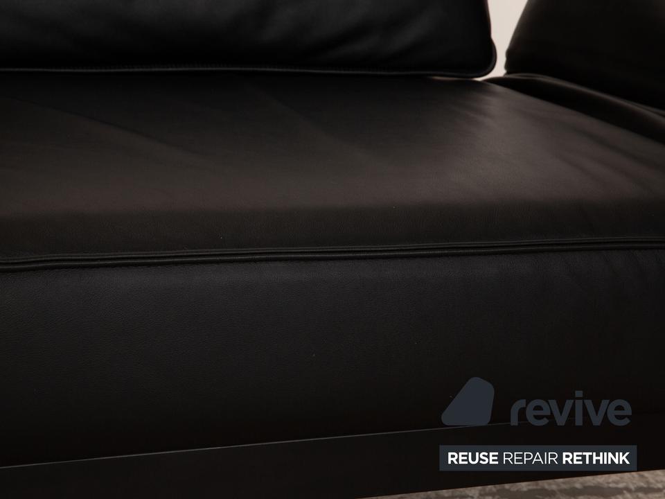 Das Mera 386 Sofa von Rolf Benz ist mit einem schwarzen Echtleder bezogen und steht auf schwarzen Metallfüßen. Das minimalistische, zeitlose Design und die praktischen Verstellmöglichkeiten zeichnen den Zweisitzer aus.
