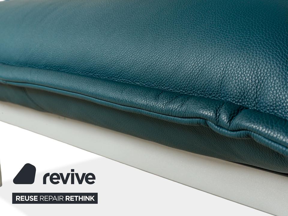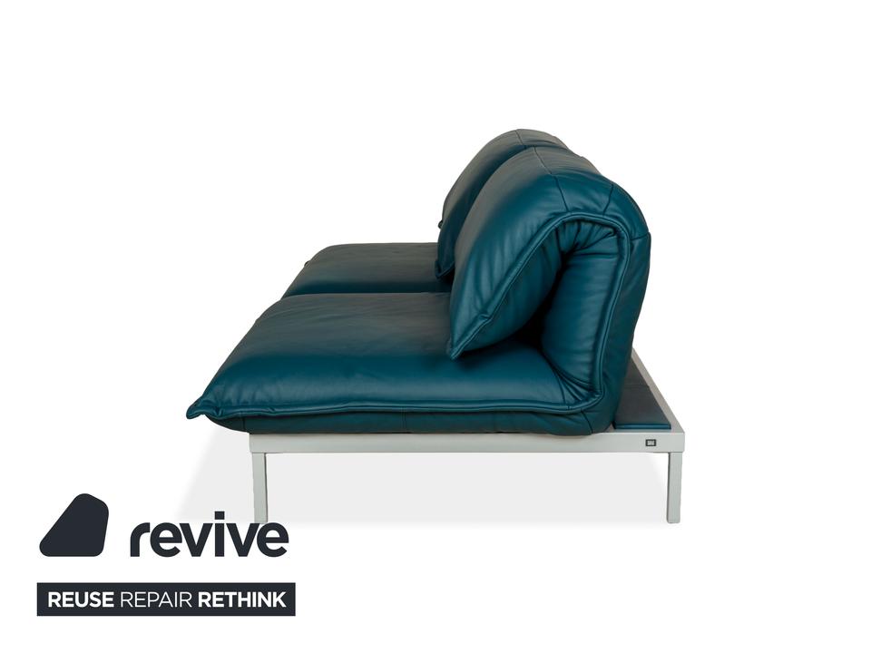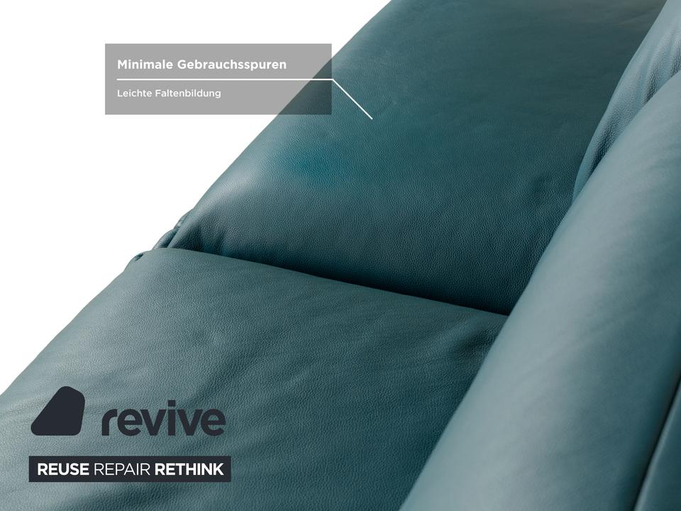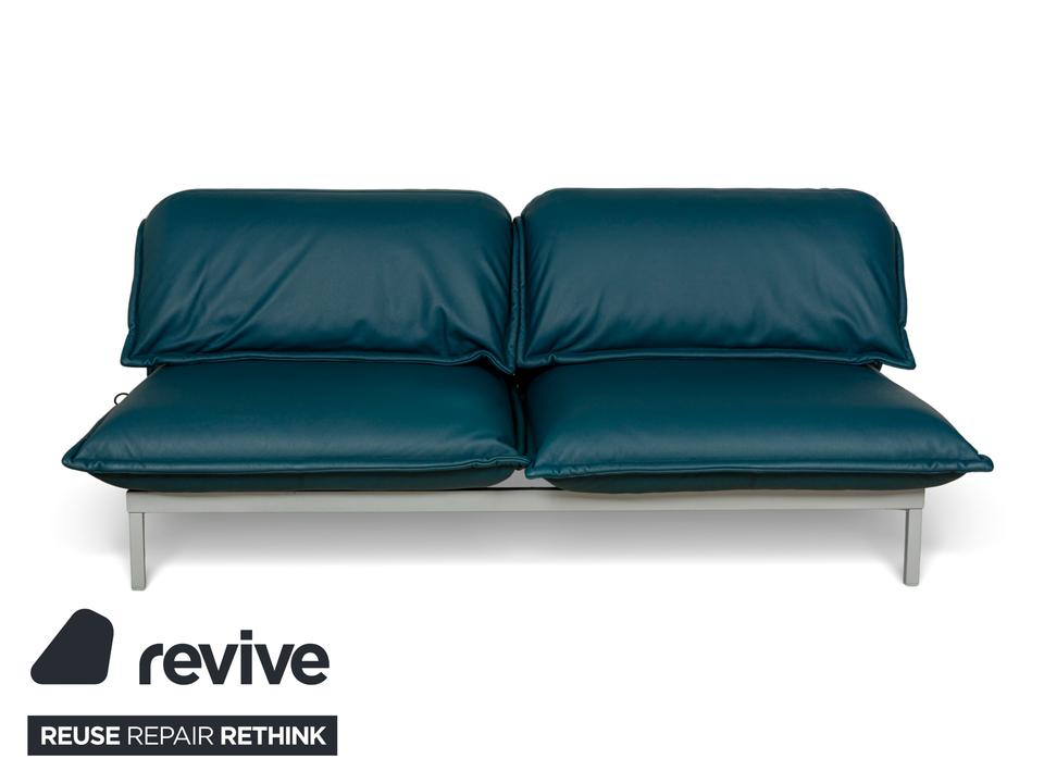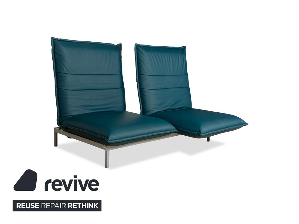 Das Nova 340 von Rolf Benz ist mit einem Blauen Leder bezogen und steht auf Metallfüßen. Das moderne Design und die praktischen Verstellmöglichkeiten zeichnen den Zweisitzer aus, während das vegane Leder Komfort und Langlebigkeit leistet.