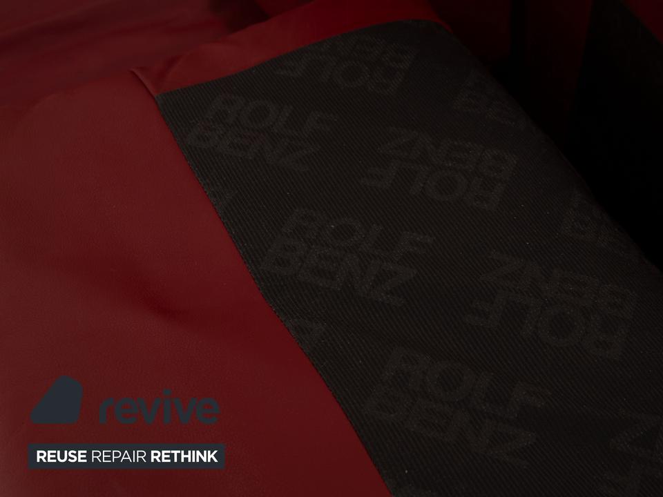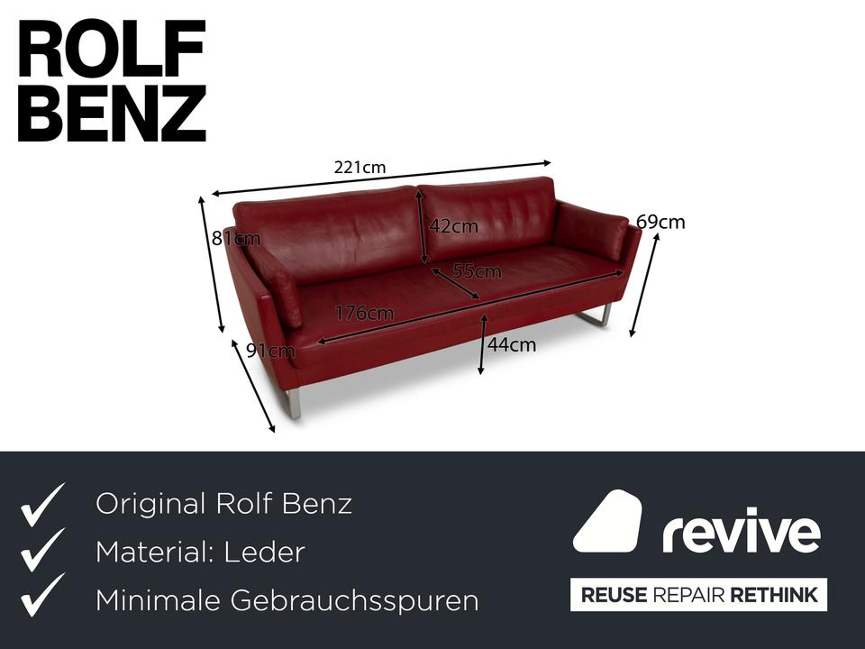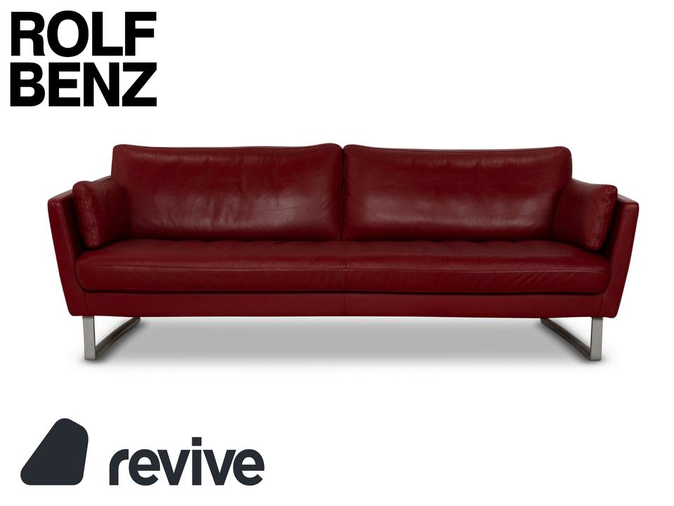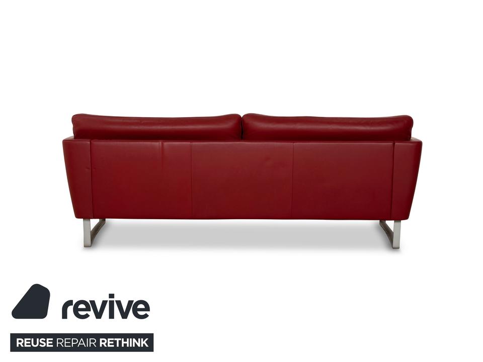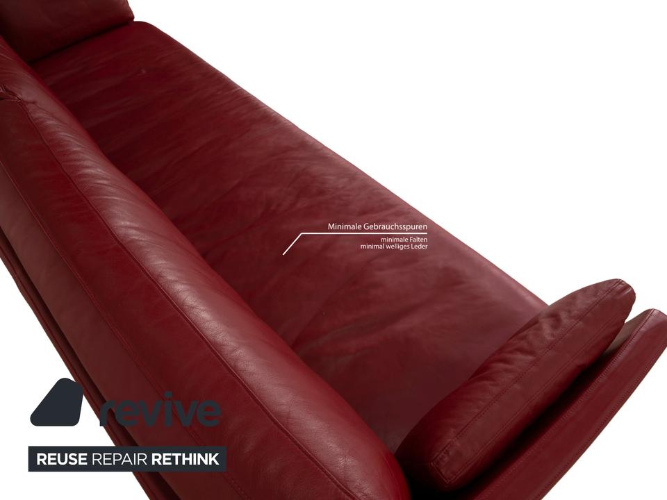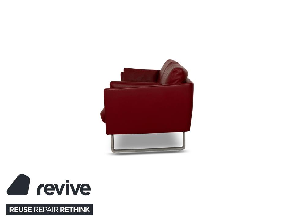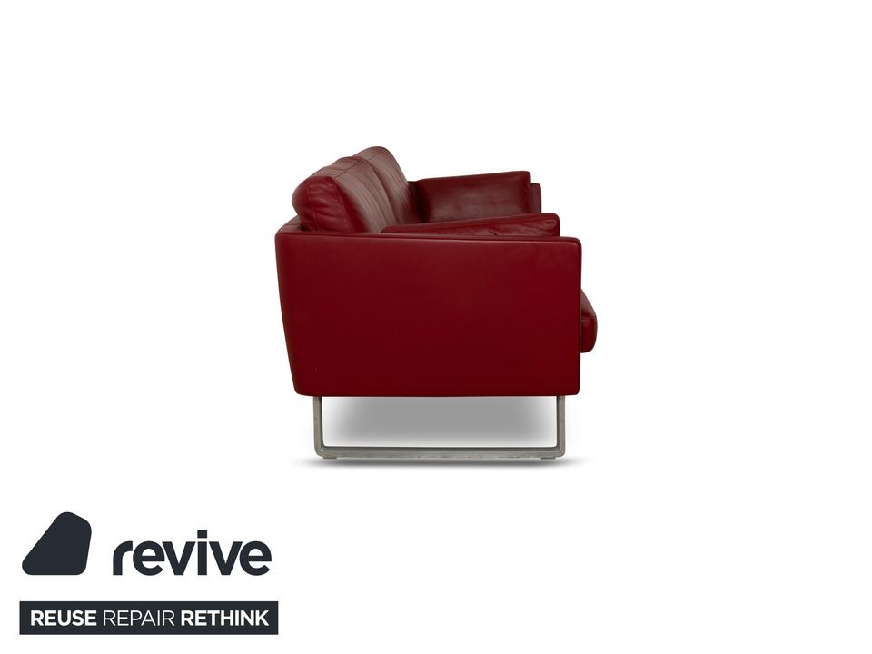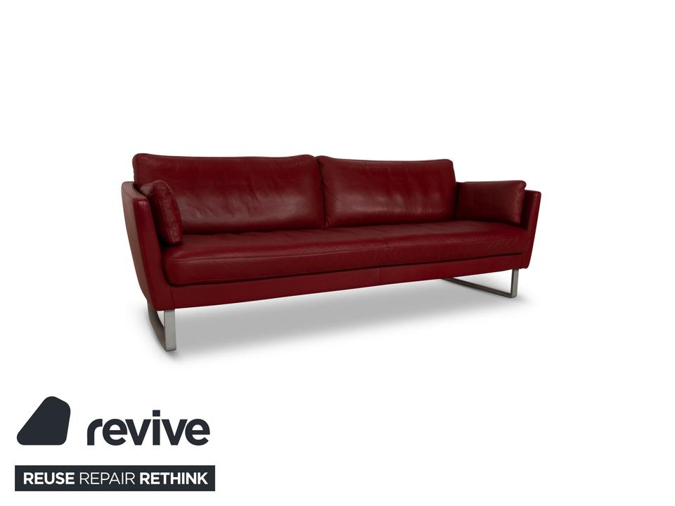 Der Dreisitzer Vida von Rolf Benz ist mit einem dunkelroten Echtleder bezogen und steht auf Metallkufen. Das schlichte, aber pointiert moderne Design zeichnen dieses Sofa aus.