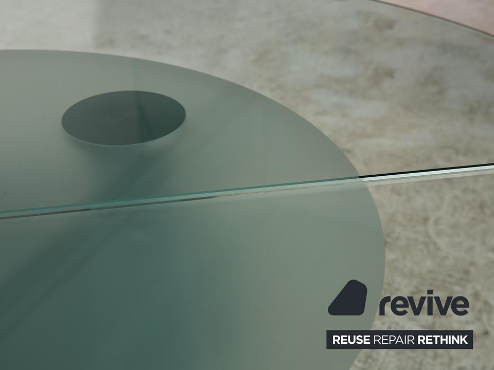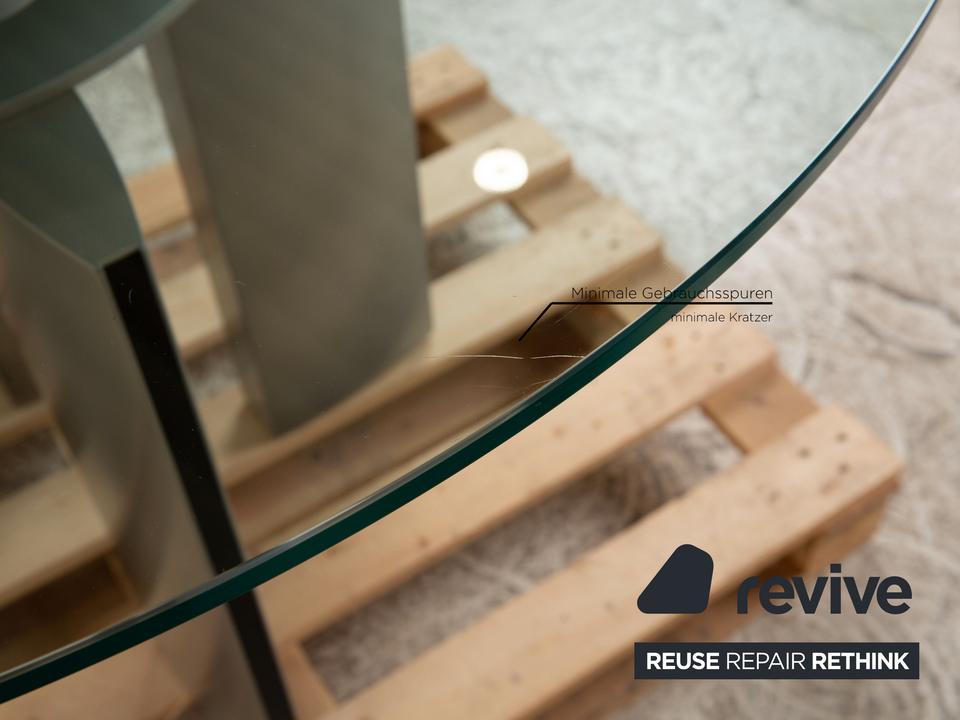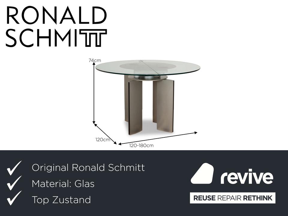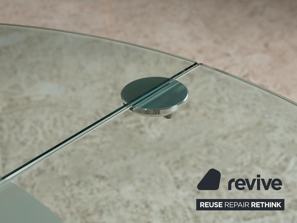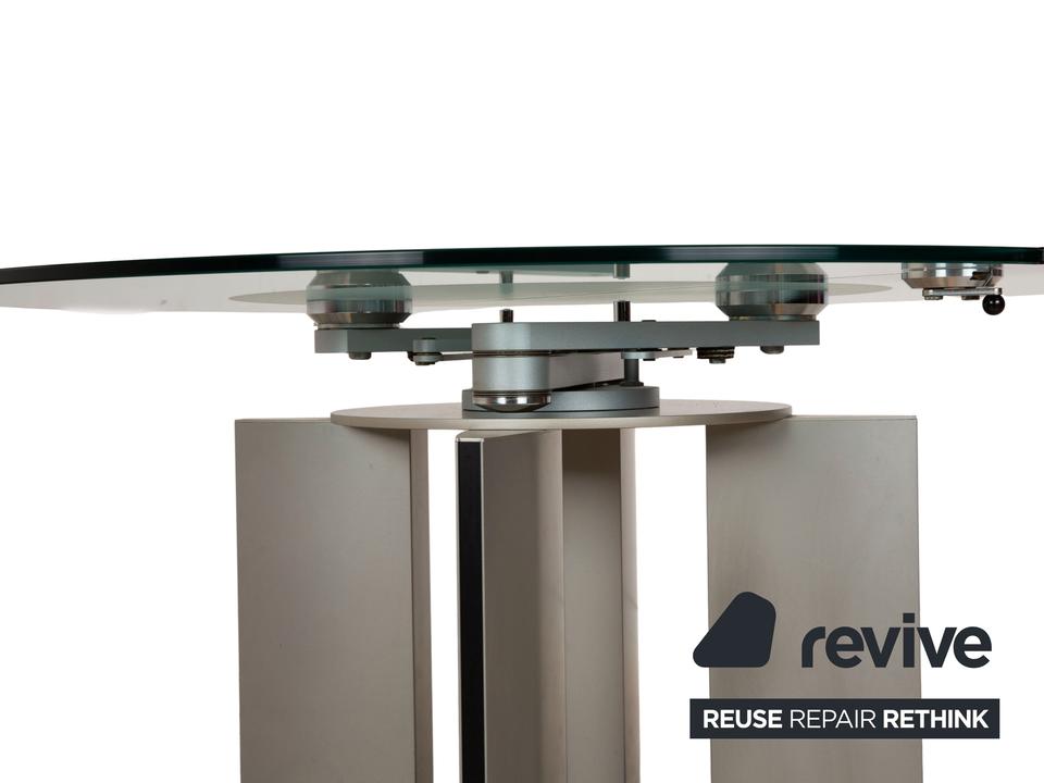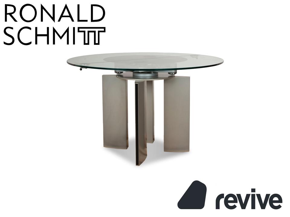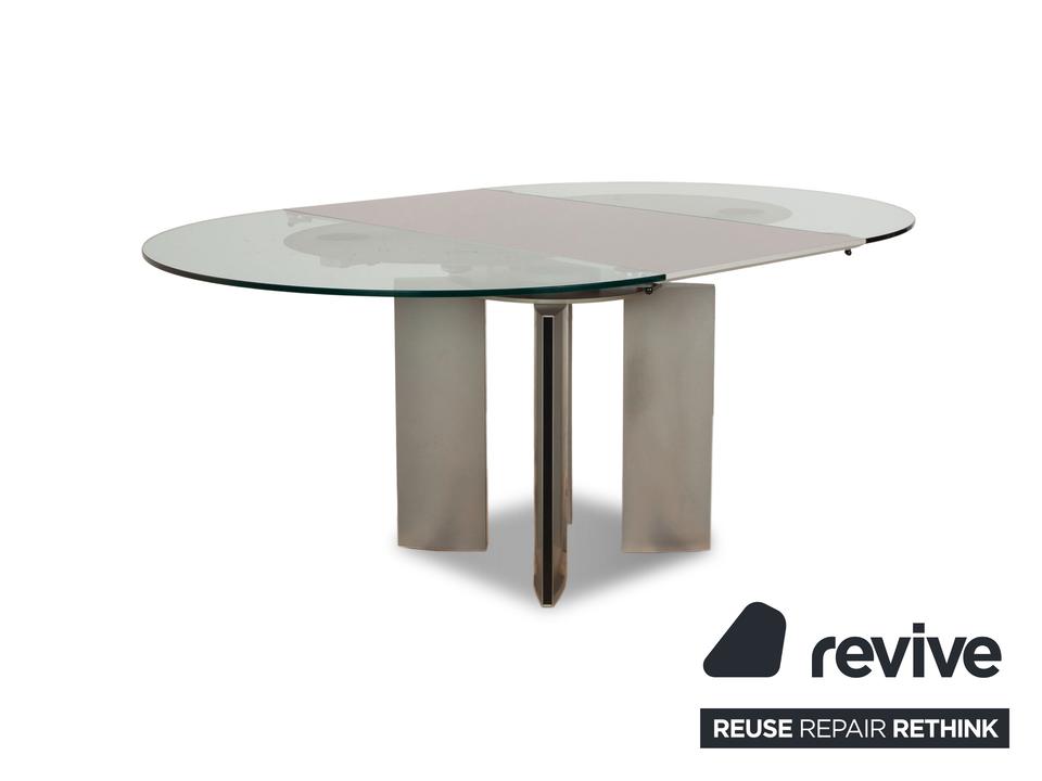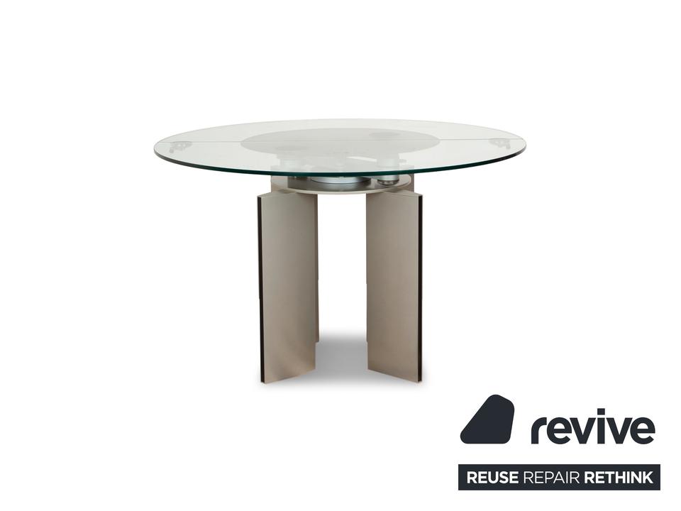 Der K 750 E Tisch von Ronald Schmitt besteht aus einer runden Glasplatte und einem massiven Metallgestell. Die praktische Ausziehfunktion zeichnet den Esstisch aus.