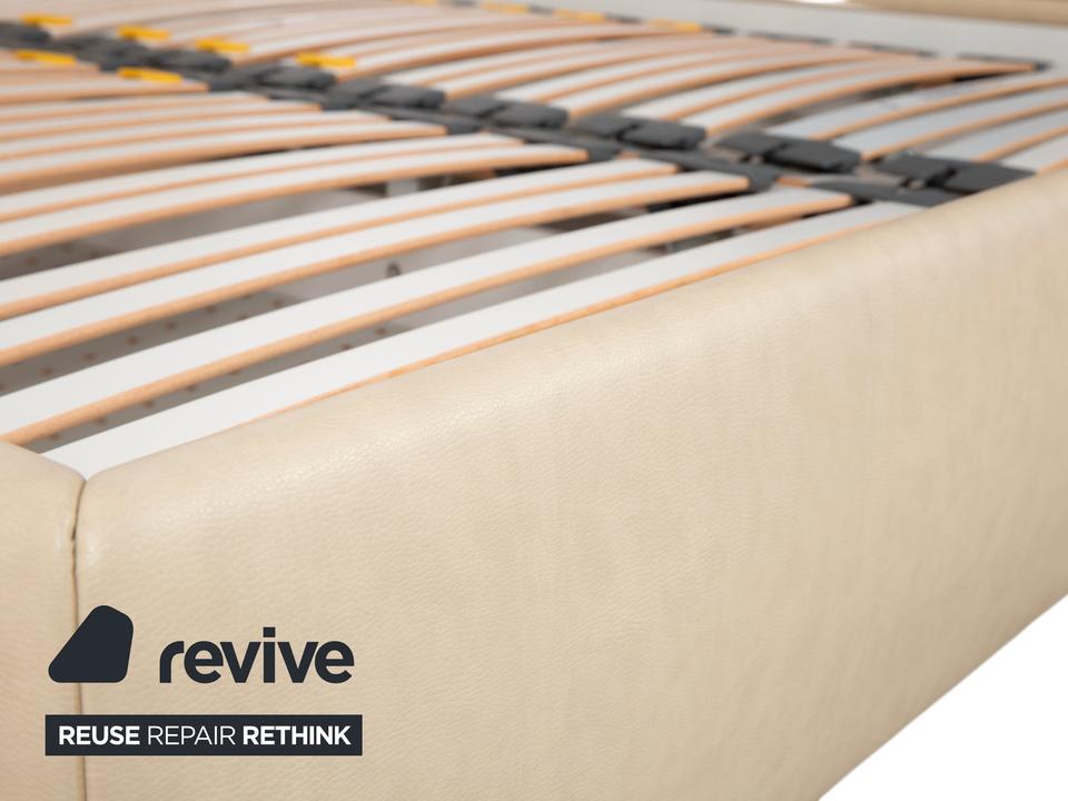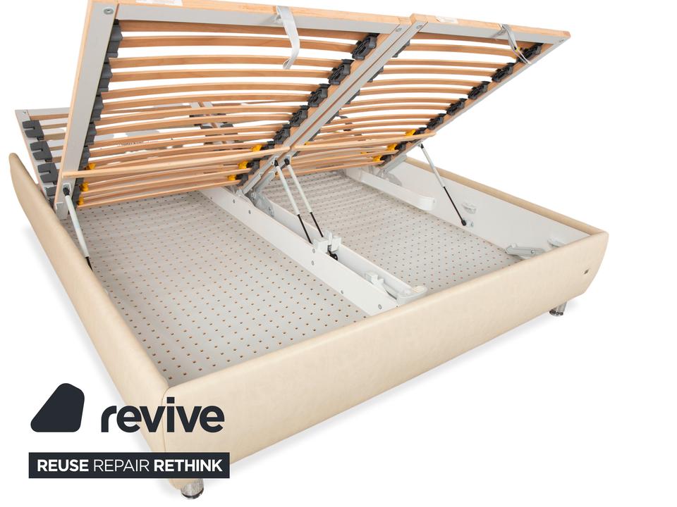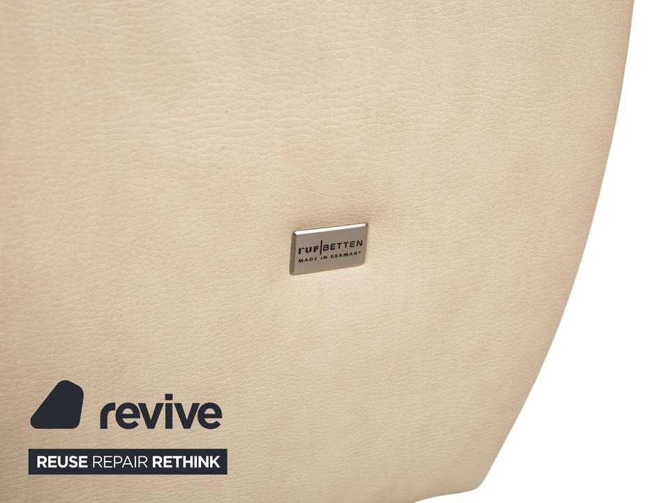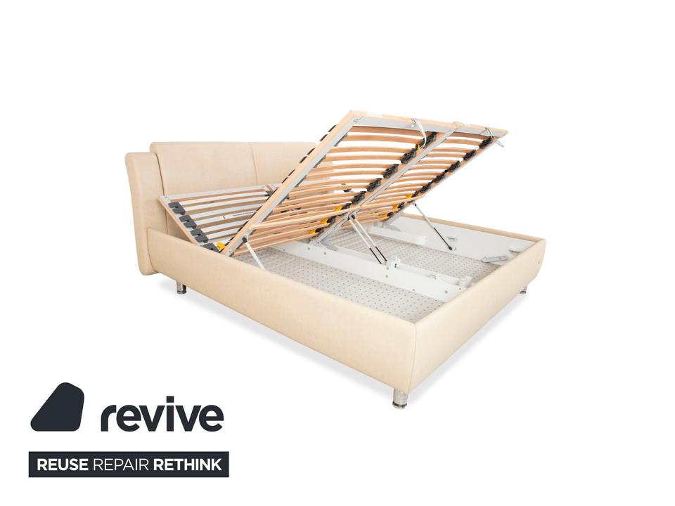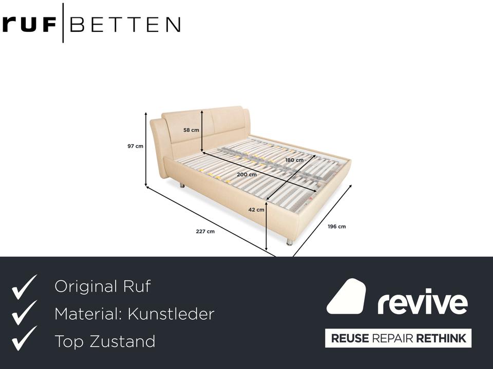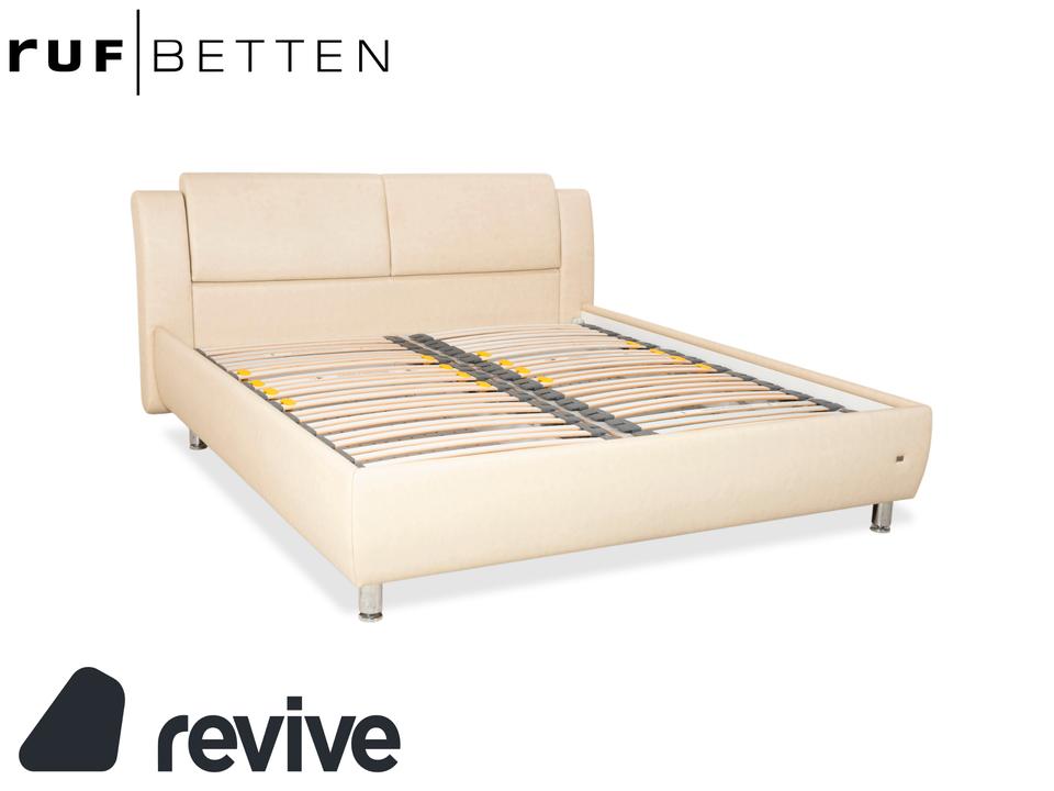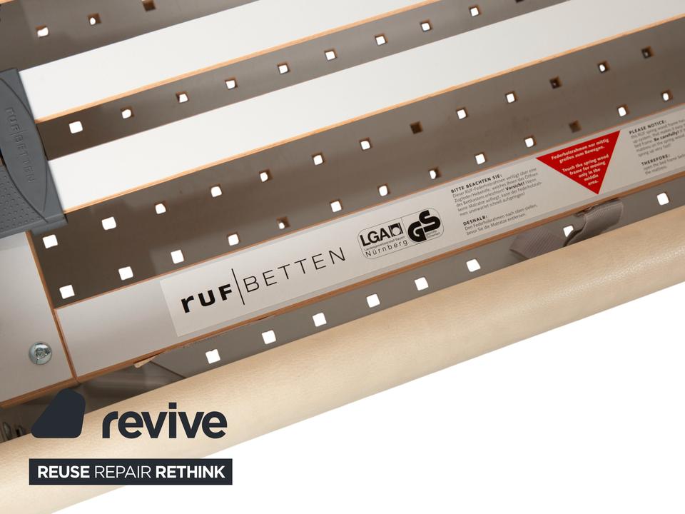 RUF Loftline: Eleganter Komfort mit verborgenem TalentDieses Bett der renommierten Marke RUF Betten beweist, dass sich praktischer Stauraum und leichtfüßiges Design nicht ausschließen müssen. Das Modell „Loftline“ wirkt modern, hell und einladend.Das Bett ist rundum mit pflegeleichtem Kunstleder in einem hellen Beige (Creme oder Sand) bezogen. Dieser Farbton bringt Ruhe in das Schlafzimmer und lässt sich vielseitig kombinieren. Das Design besticht durch folgende Details:Das Kopfteil: Es ist weich gepolstert und verfügt über leicht nach vorne gezogene Seitenteile („Ohren“), die Geborgenheit vermitteln. Die horizontale Unterteilung der Rückenpolster sorgt für eine moderne Struktur.Die Basis: Der gepolsterte Rahmen ruht auf zylindrischen Füßen in Chrom-Optik. Diese heben das Bett an und verleihen ihm trotz des Stauraums eine gewisse optische Leichtigkeit.Ein Blick ins Innere verrät die Funktionalität: Zu sehen sind zwei hochwertige Lattenroste mit Härtegradverstellung (erkennbar an den gelben Schiebereglern im Mittelbereich). Unter diesen Rosten verbirgt sich der im Stichwort genannte integrierte Bettkasten. Dieser bietet auf der großen Liegefläche von 180 x 200 cm enorm viel Platz für Bettwäsche, Decken oder Saisonkleidung.