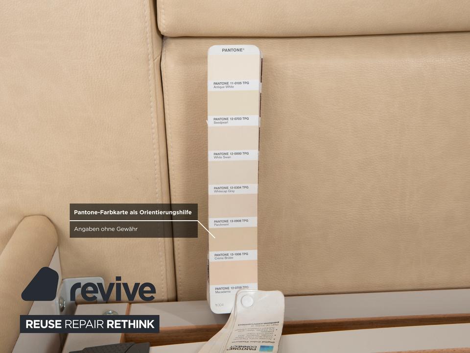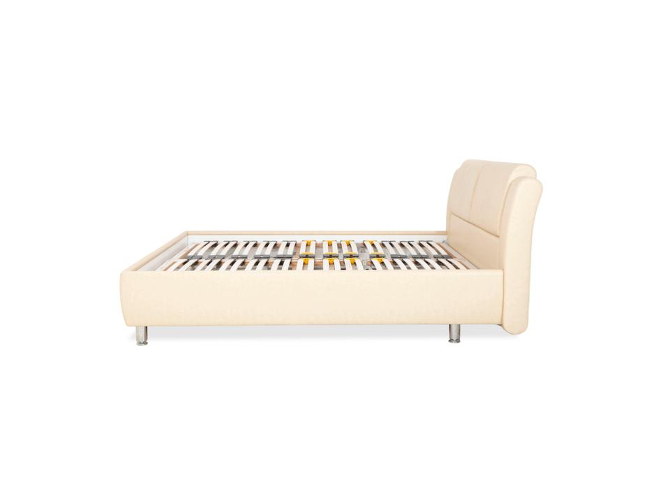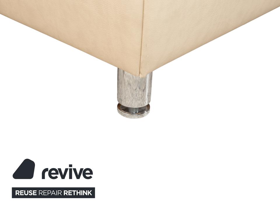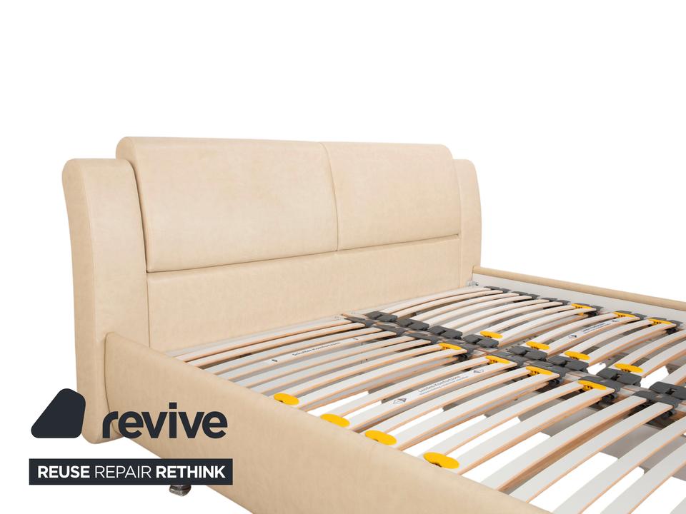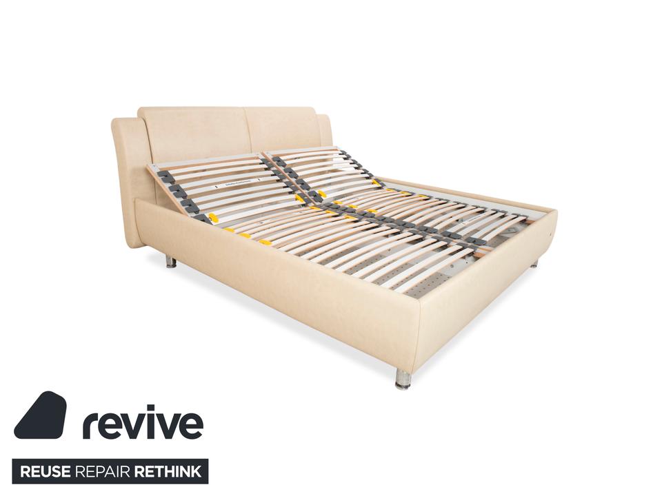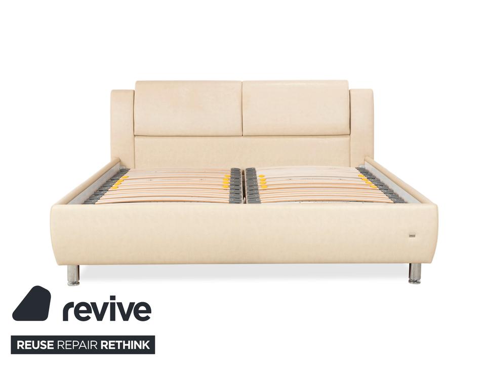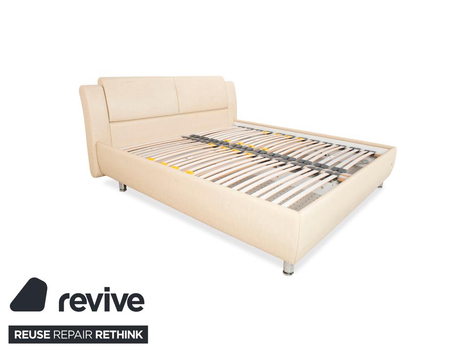 RUF Loftline: Eleganter Komfort mit verborgenem TalentDieses Bett der renommierten Marke RUF Betten beweist, dass sich praktischer Stauraum und leichtfüßiges Design nicht ausschließen müssen. Das Modell „Loftline“ wirkt modern, hell und einladend.Das Bett ist rundum mit pflegeleichtem Kunstleder in einem hellen Beige (Creme oder Sand) bezogen. Dieser Farbton bringt Ruhe in das Schlafzimmer und lässt sich vielseitig kombinieren. Das Design besticht durch folgende Details:Das Kopfteil: Es ist weich gepolstert und verfügt über leicht nach vorne gezogene Seitenteile („Ohren“), die Geborgenheit vermitteln. Die horizontale Unterteilung der Rückenpolster sorgt für eine moderne Struktur.Die Basis: Der gepolsterte Rahmen ruht auf zylindrischen Füßen in Chrom-Optik. Diese heben das Bett an und verleihen ihm trotz des Stauraums eine gewisse optische Leichtigkeit.Ein Blick ins Innere verrät die Funktionalität: Zu sehen sind zwei hochwertige Lattenroste mit Härtegradverstellung (erkennbar an den gelben Schiebereglern im Mittelbereich). Unter diesen Rosten verbirgt sich der im Stichwort genannte integrierte Bettkasten. Dieser bietet auf der großen Liegefläche von 180 x 200 cm enorm viel Platz für Bettwäsche, Decken oder Saisonkleidung.