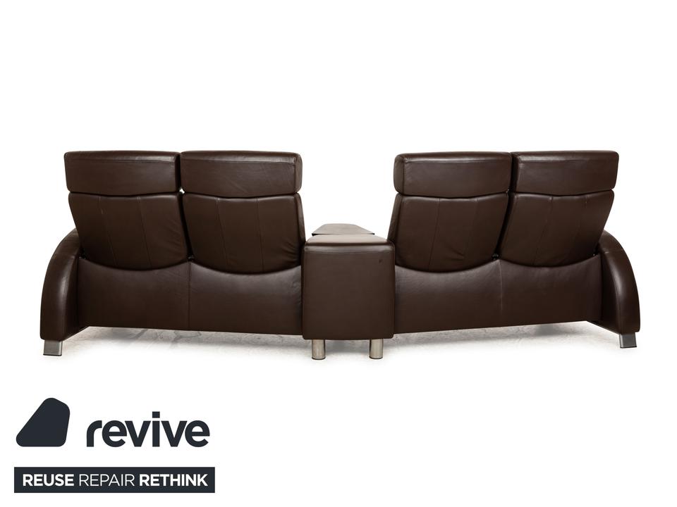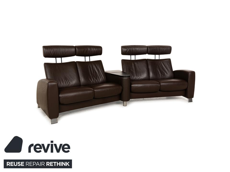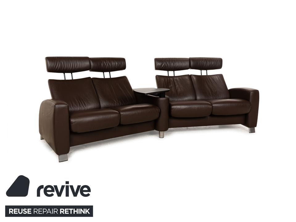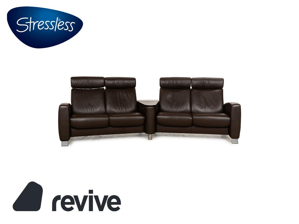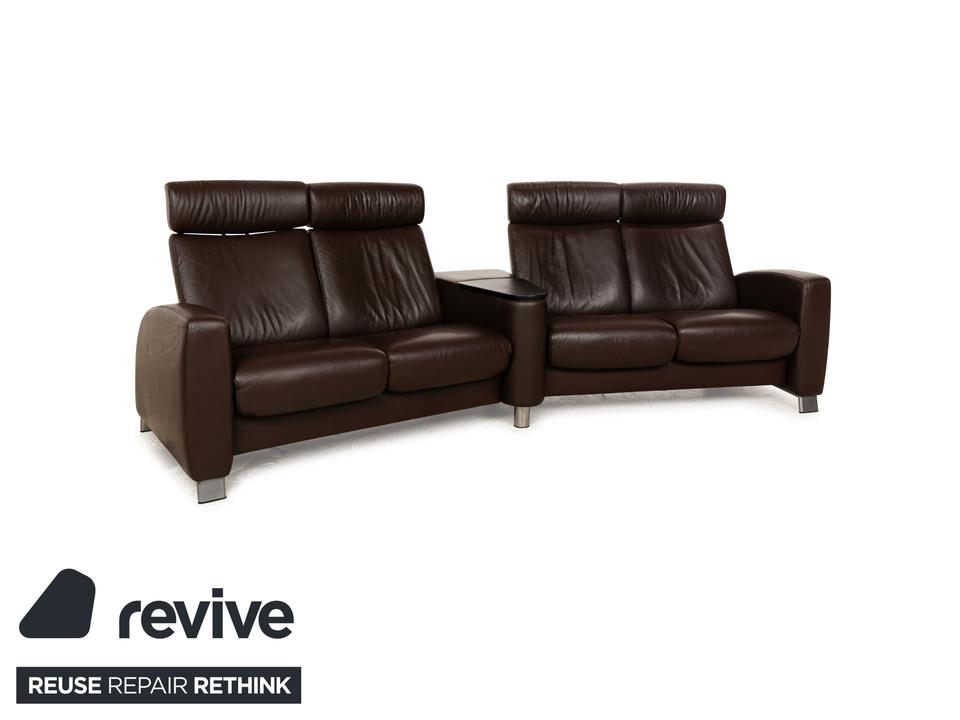 Der Viersitzer Arion von Stressless ist mit dunkelbraunem Leder bezogen und steht auf flachen Metallfüßen. Er zeichnet sich durch die verstellbaren Kopfstützen und die komfortable Holzablage und das für den Hersteller typische Design aus. Jede Sitzfläche lässt sich individuell in eine Relaxposition bringen.